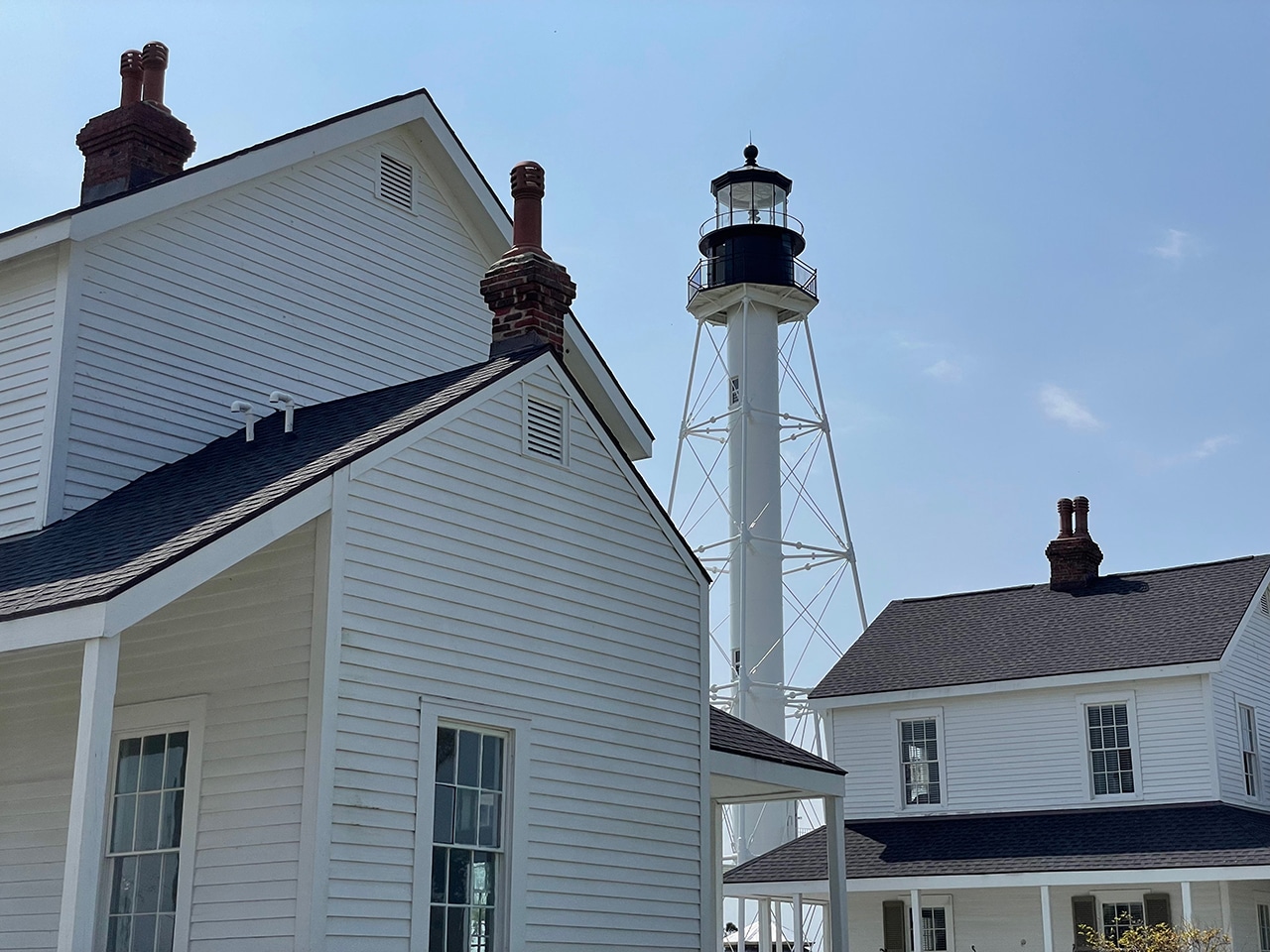•1851 a storm destroys the lighthouse. •1857 a new brick lighthouse was erected, then the wooden parts of the tower and both keepers’ houses were burned by Confederates in the War Between the States. •1865 the lighthouse was returned to operation. •1869 the Lighthouse Board reports beachfront is eroding swiftly and needs protection from the sea’s encroachment. By 1875 the water is within 150 feet, by 1882 the tower stood in eight feet of water. •1883 the Lighthouse Board approves the erection of a 98 foot skeletal tower which has eight cast iron legs bolted into a concrete foundation – allowing less resistance to wind and waves and reducing the weight on the soft, sandy earth.