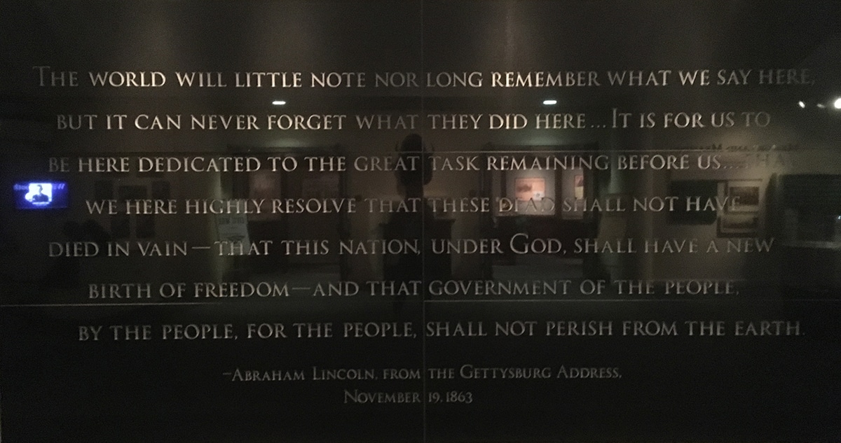 “The world will little note, nor long remember what we say here, but it can never forget what they did here. It is for us the living, rather, to be dedicated here to the unfinished work which they who fought here have thus far so nobly advanced. It is rather for us to be here dedicated to the great task remaining before us – that from these honored dead we take increased devotion to that cause for which they gave the last full measure of devotion – that we here highly resolve that these dead shall not have died in vain – that this nation, under God, shall have a new birth of freedom – and that government of the people, by the people, for the people, shall not perish from the earth.” – FROM the Gettysburg Address by Abraham Lincoln