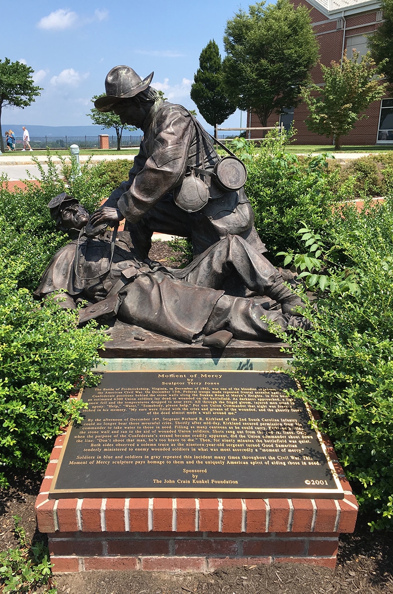 The sculpture in front was somber but beautiful, depicting a “Moment of Mercy” by a solider of the Confederacy who “during a lull in the Battle of Fredericksburg, risked his life to give water to Union soldiers who were lying wounded and dying in a “no man’s land” between the opposing armies.” – READ the words inscribed on the “Moment of Mercy” sculpture by Terry Jones