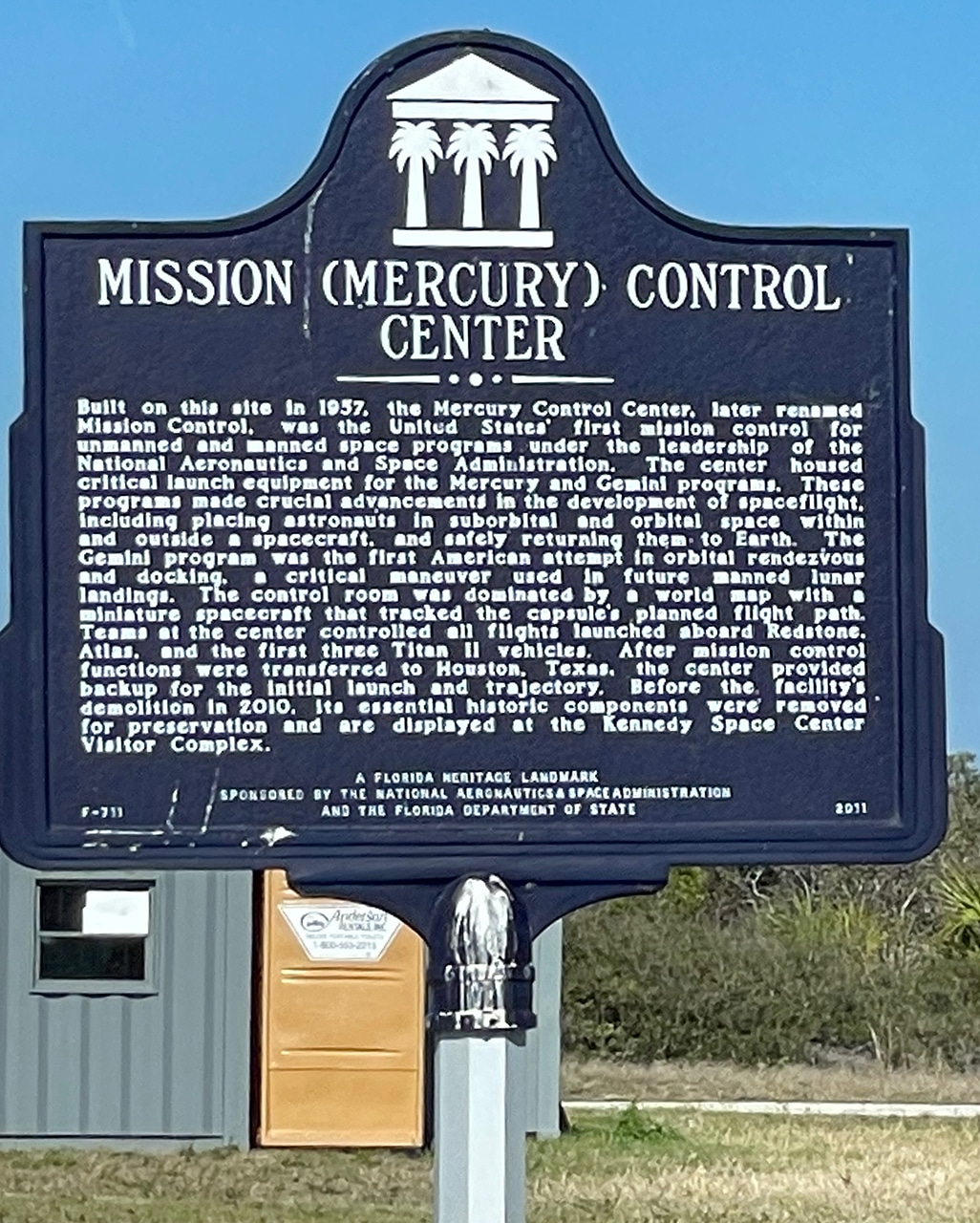 “Built on this site in 1957, the Mercury Control Center, later renamed Mission Control, was the United States’ first mission control for unmanned and manned space programs under the leadership of the National Aeronautics and Space Administration. The center housed critical launch equipment for the Mercury and Gemini programs. These programs made crucial advancements in the development of spaceflight, including placing astronauts in suborbital and orbital space within and outside a spacecraft, and safely returning them to Earth…