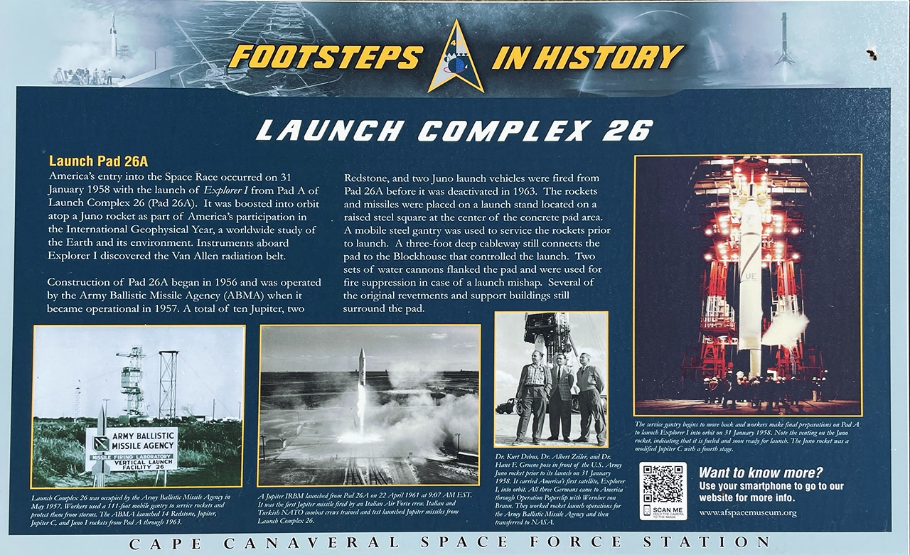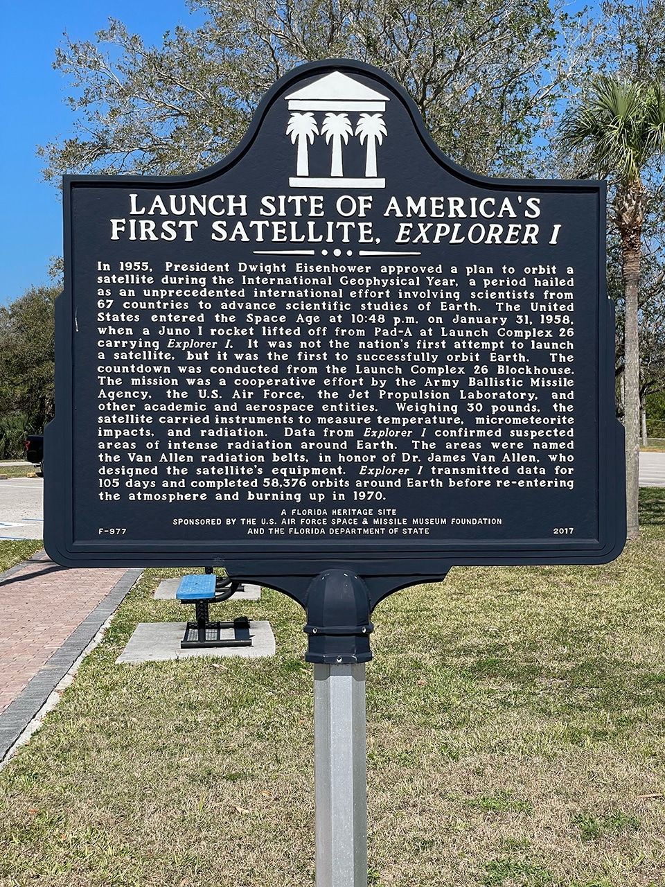 “America’s entry into the Space Race occurred on 31 January 1958 with the launch of Explorer I from Pad A of Launch Complex 26 (Pad 26A). It was boosted into orbit atop a Juno rocket as part of America’s participation in the International Geophysical Year, a worldwide study of the Earth and its environment. Instruments aboard Explorer I discovered the Van Allen radiation belt.” ~ From the sign below.