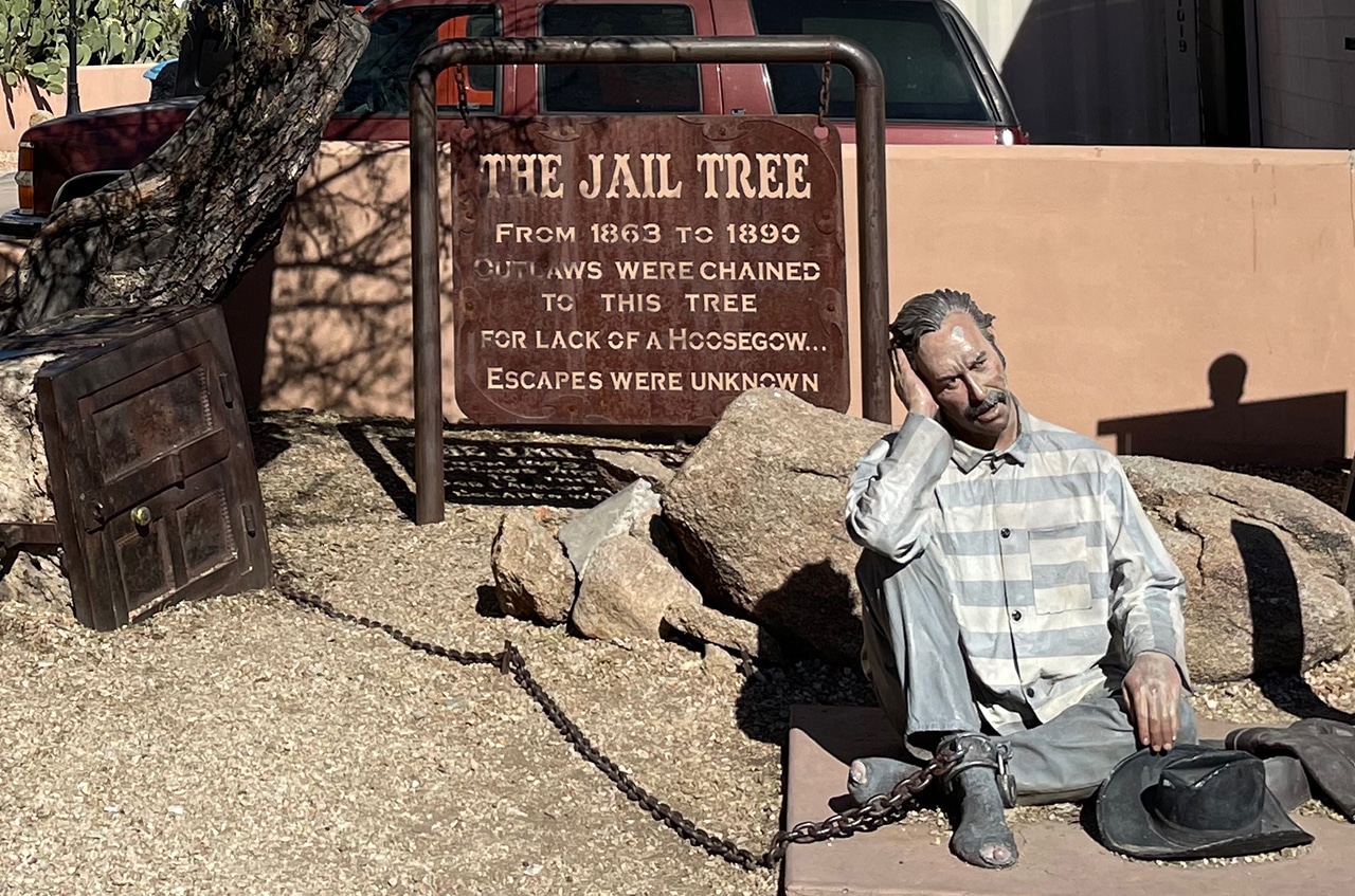“Located at the corner of US-60 and Tegner Street, sits a 200 year old mesquite tree that served as the Town jail from 1863 to 1890. Outlaws were chained to the tree to prevent their escape.