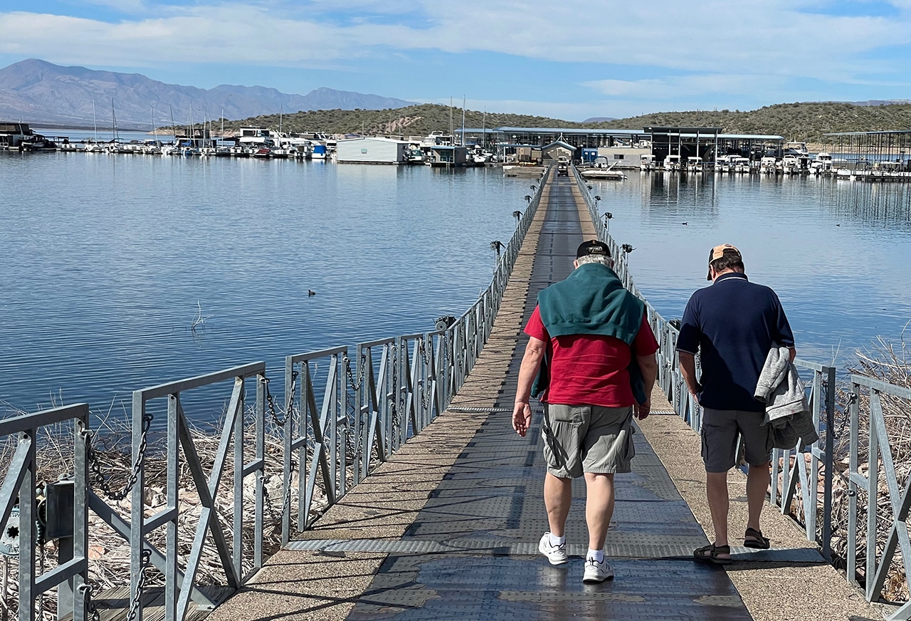 Although we didn’t go out on the lake on this short visit, we sat on the back upper deck of their nephew’s gorgeous houseboat while it was docked at the Roosevelt Lake Marina. We put our feet up with a beer, watching a few boats go by like we owned the place! The water was like glass and the blue sky and red rock was just awesome!
