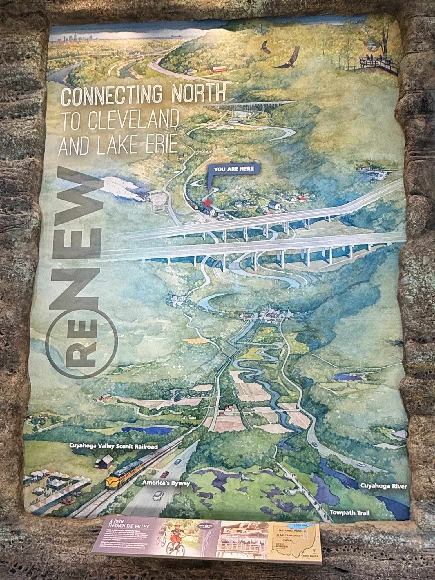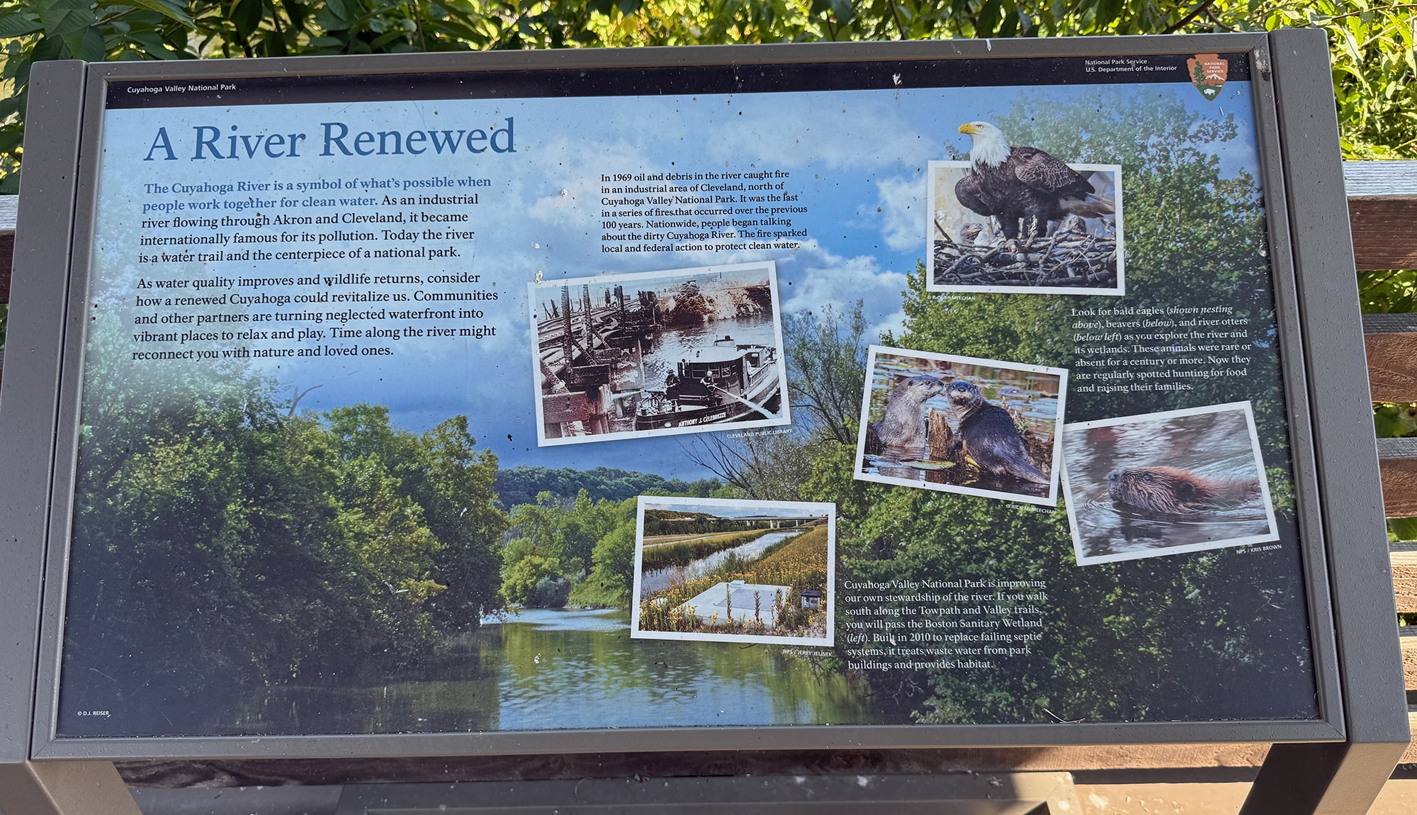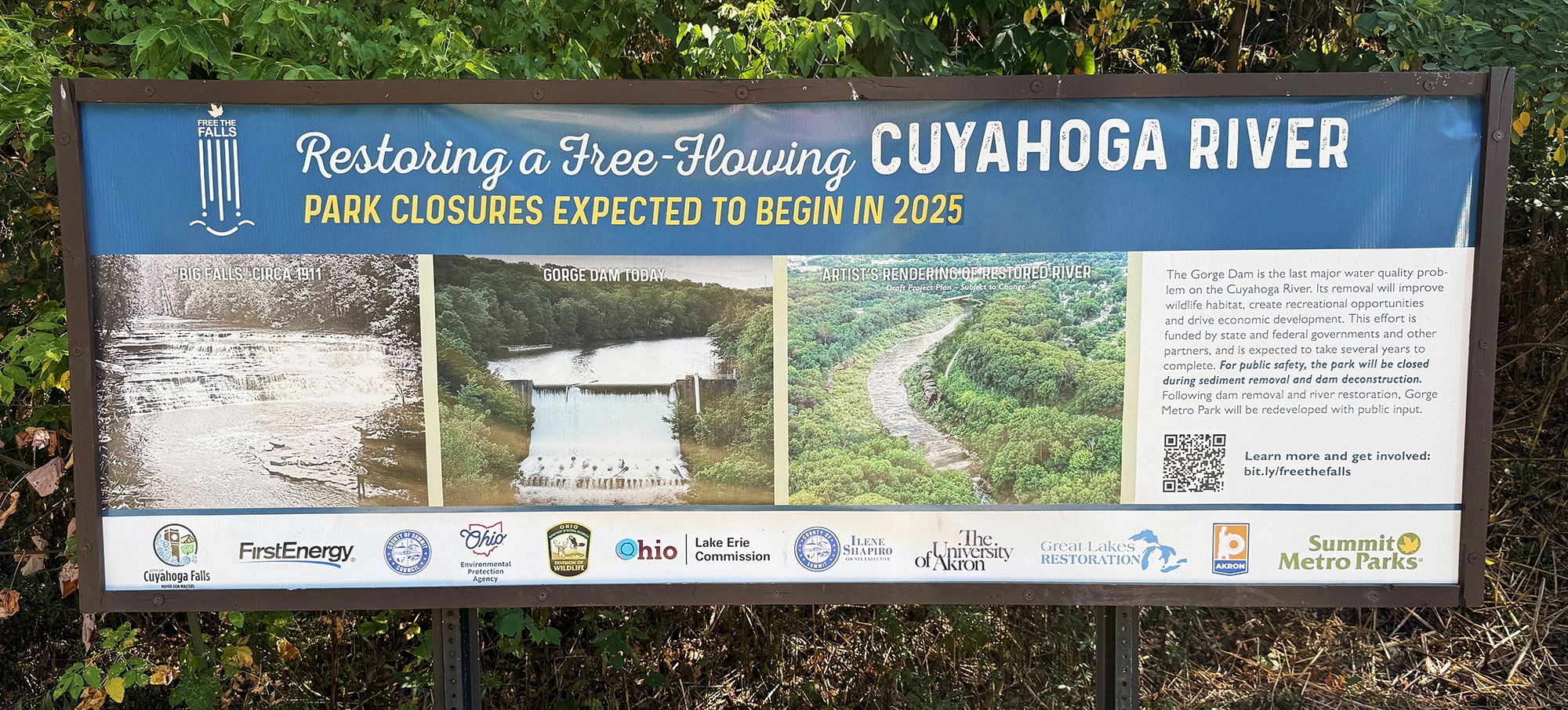 The sign below shows a before and after picture of Big Falls, along with an artist rendering of the soon-to-become free-flowing Cuyahoga River. The photo below and two other photos were taken before this dam was put in, and are found at the link.