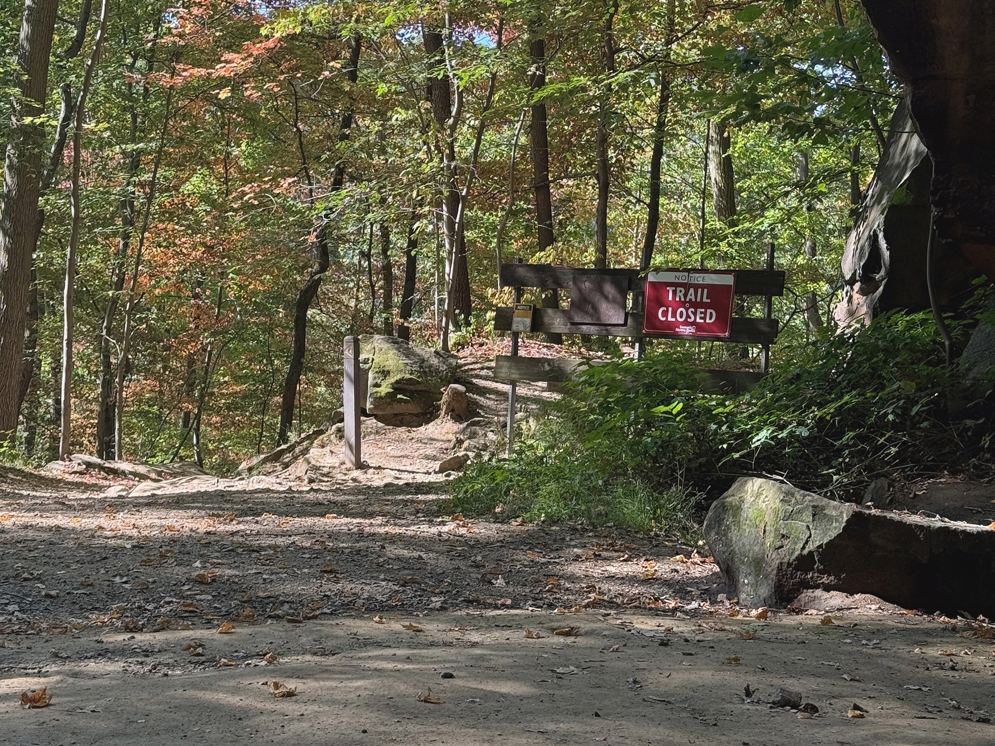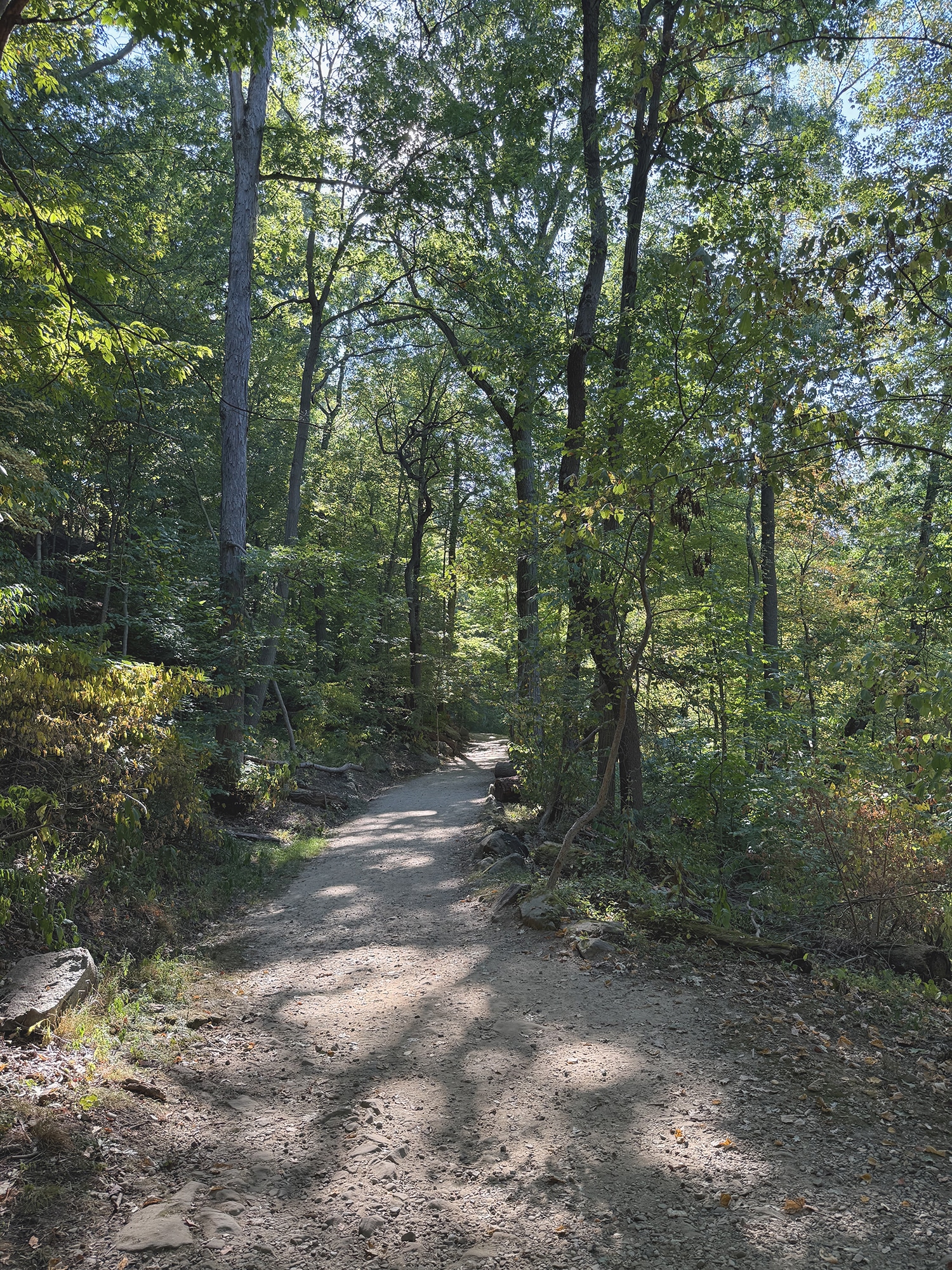 Signs were posted about some trail closures due to a park renovation that was in progress. From the map, it looked as though the overlook with a view of the falls was still open, so we set out to find it. We were thankful to be heading into a heavily wooded area as this morning warmed up, and we immediately felt its relief.