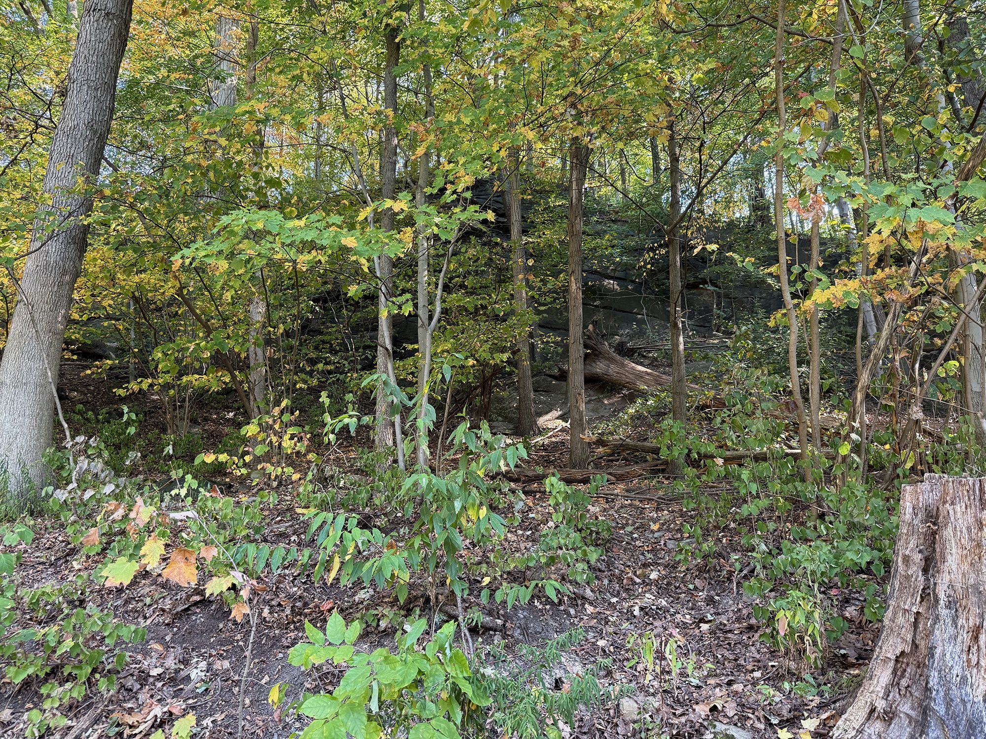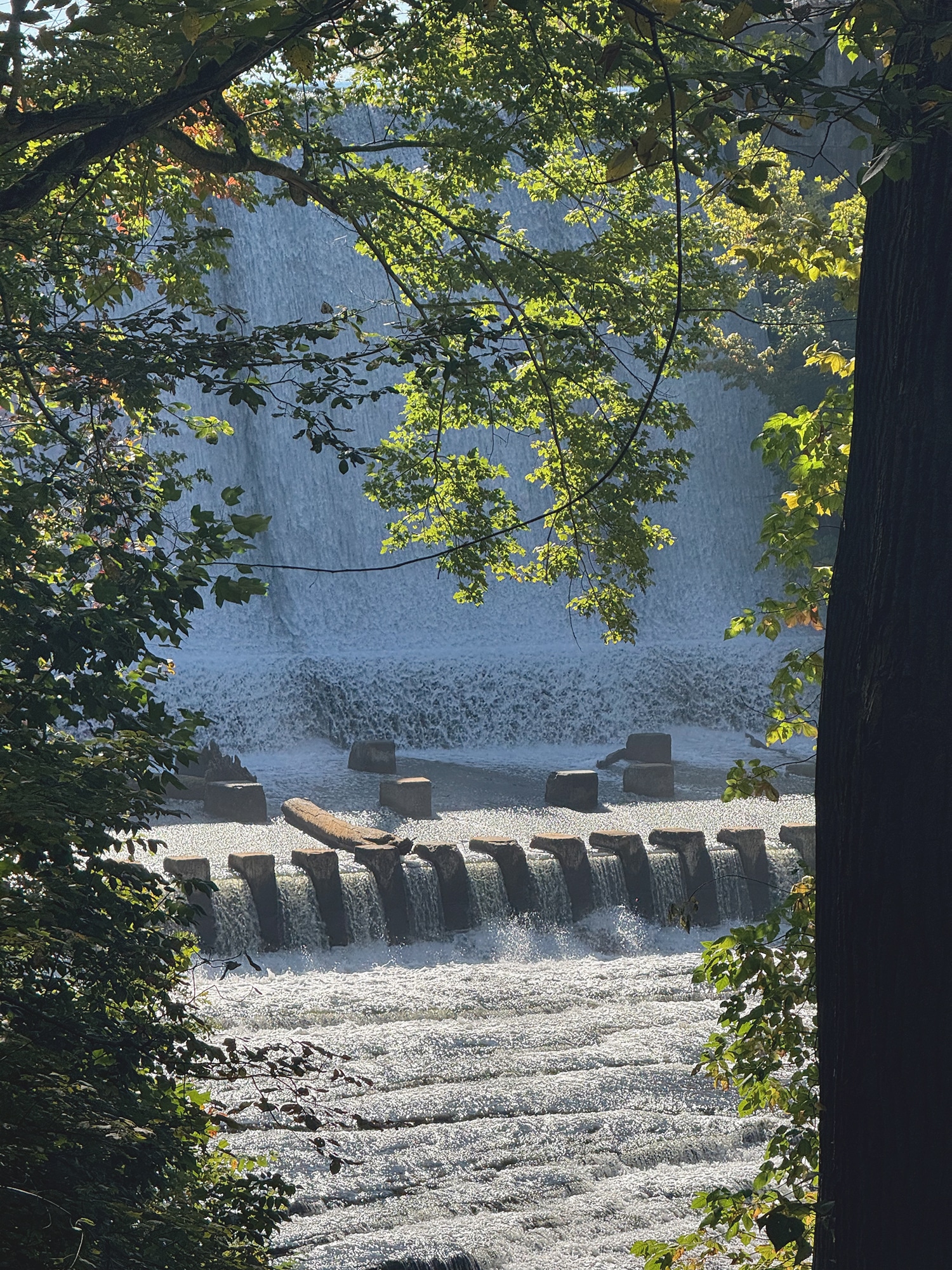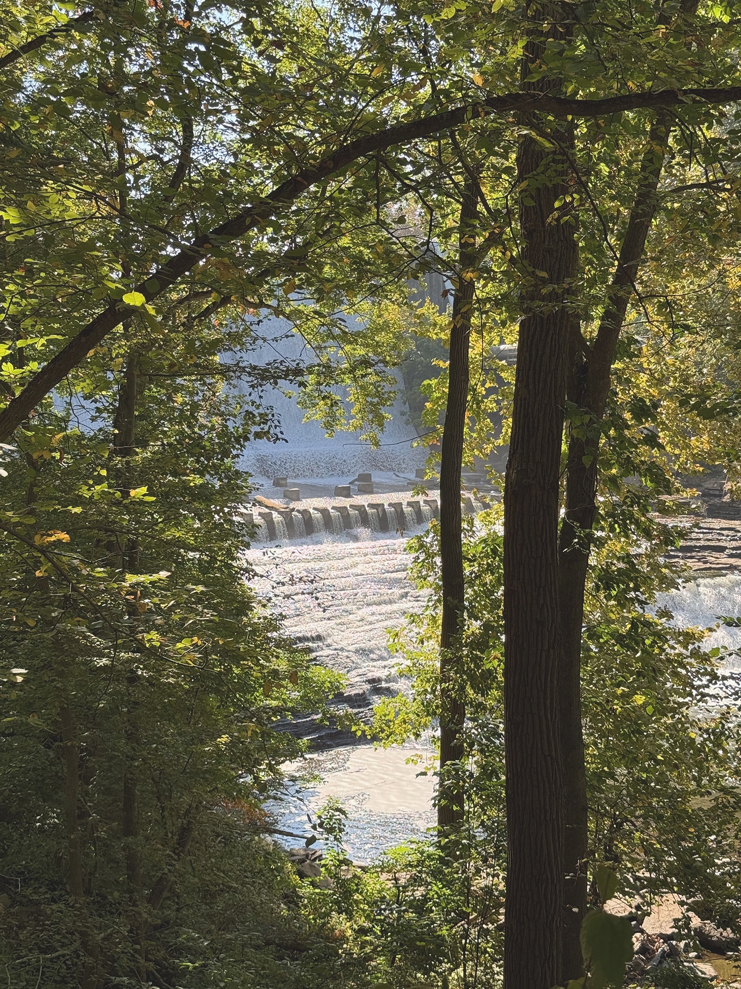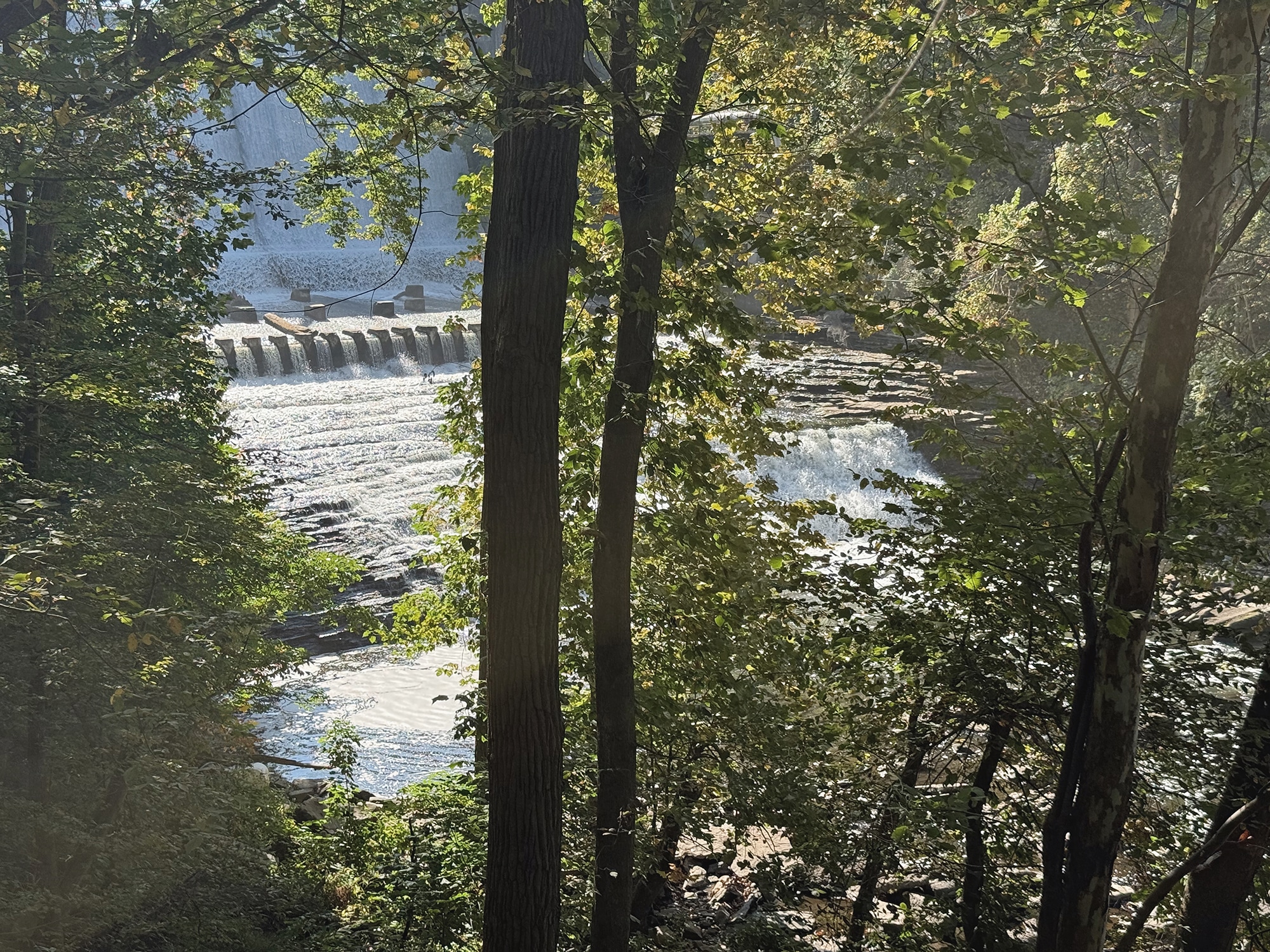 Although I was still looking for the overlook where I could see the falls, when I come upon a short trail that headed down a little and toward the edge of a cliff, I took it. It was hard to tell what I was looking at without the benefit of the zoom lens on my phone, but I finally recognized a wall of water rushing down to the dam area.
