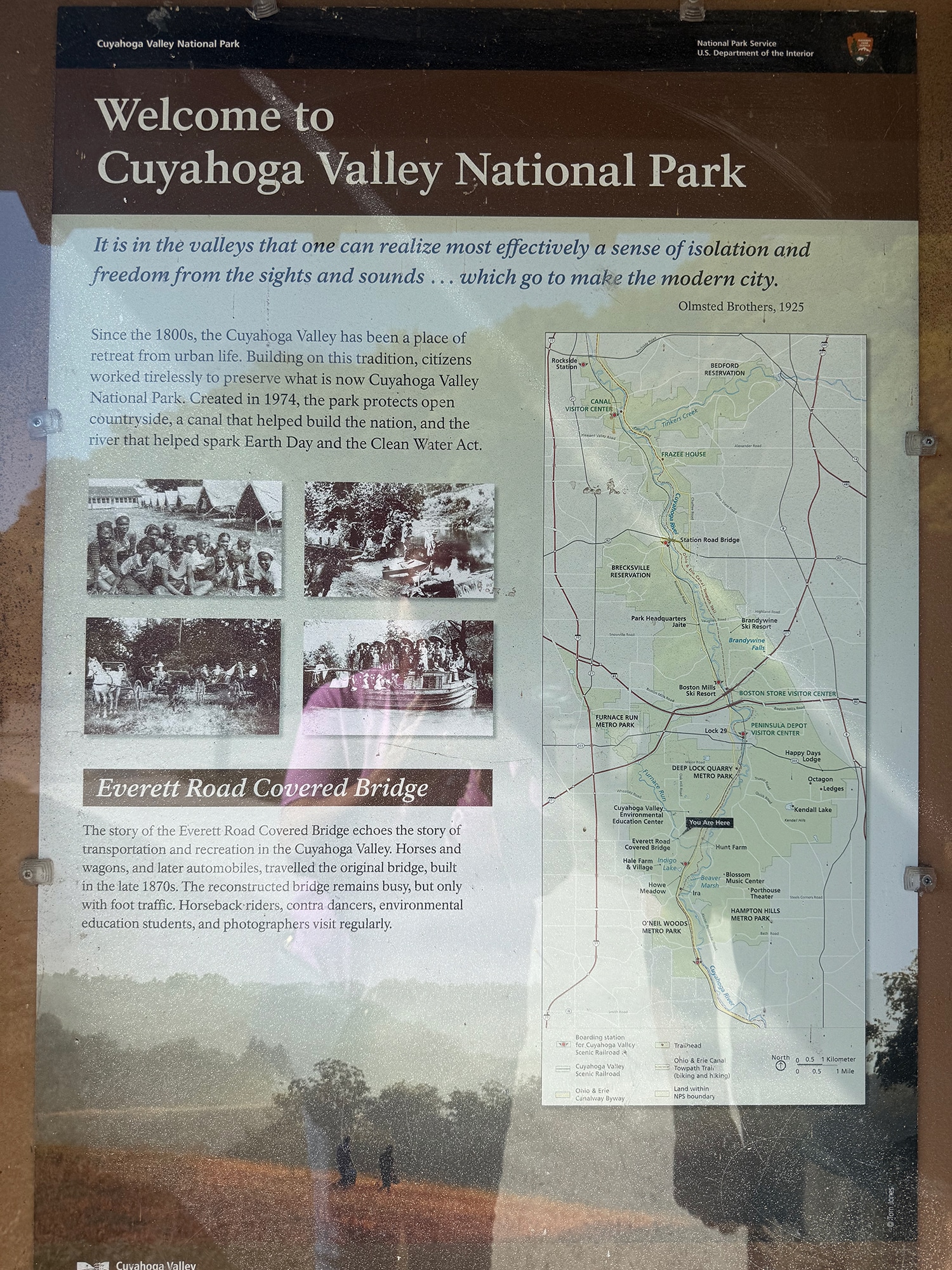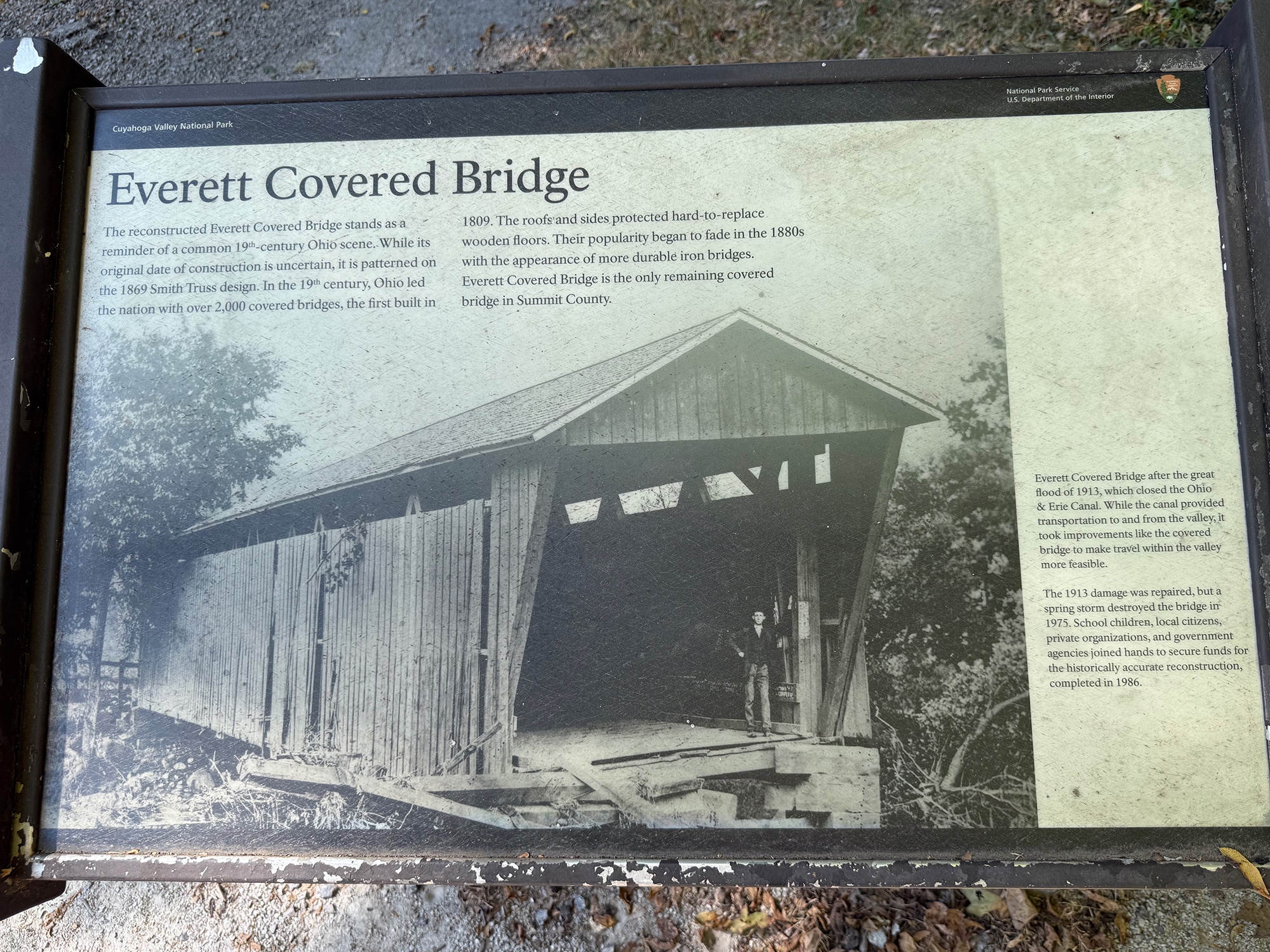 “The story of the Everett Road Covered Bridge echoes the story of transportation and recreation in the Cuyahoga Valley. Horses and wagons, and later automobiles, travelled the original bridge, built in the late 1870s. The reconstructed bridge remains busy, but only with foot traffic. Horseback riders, contra dancers, environmental education students, and photographers visit regularly.” ~ from the first sign below