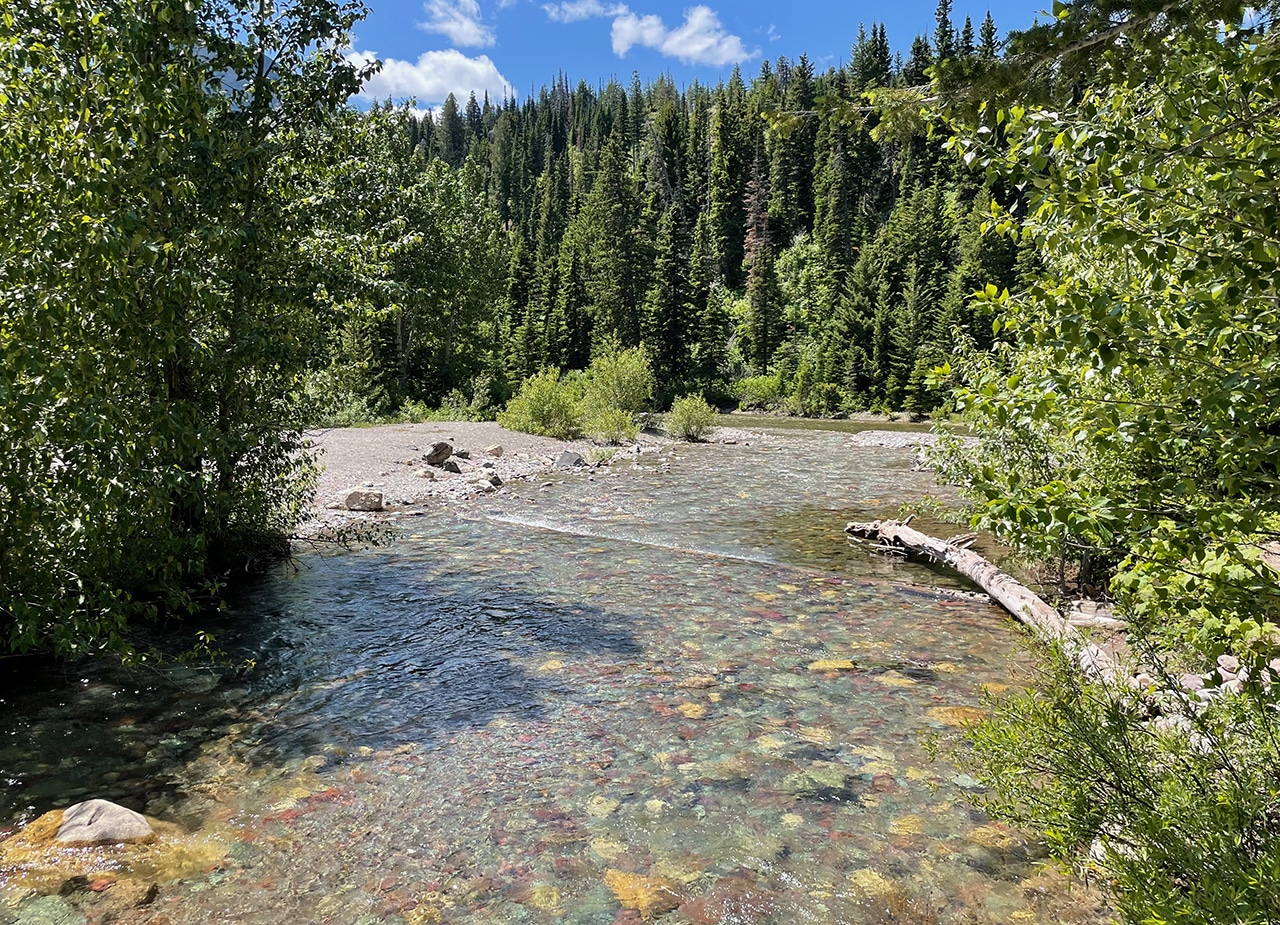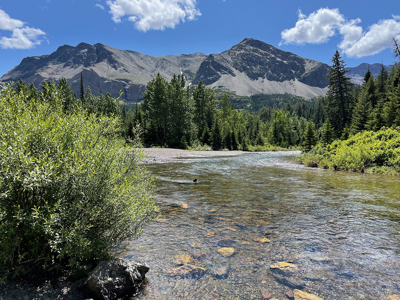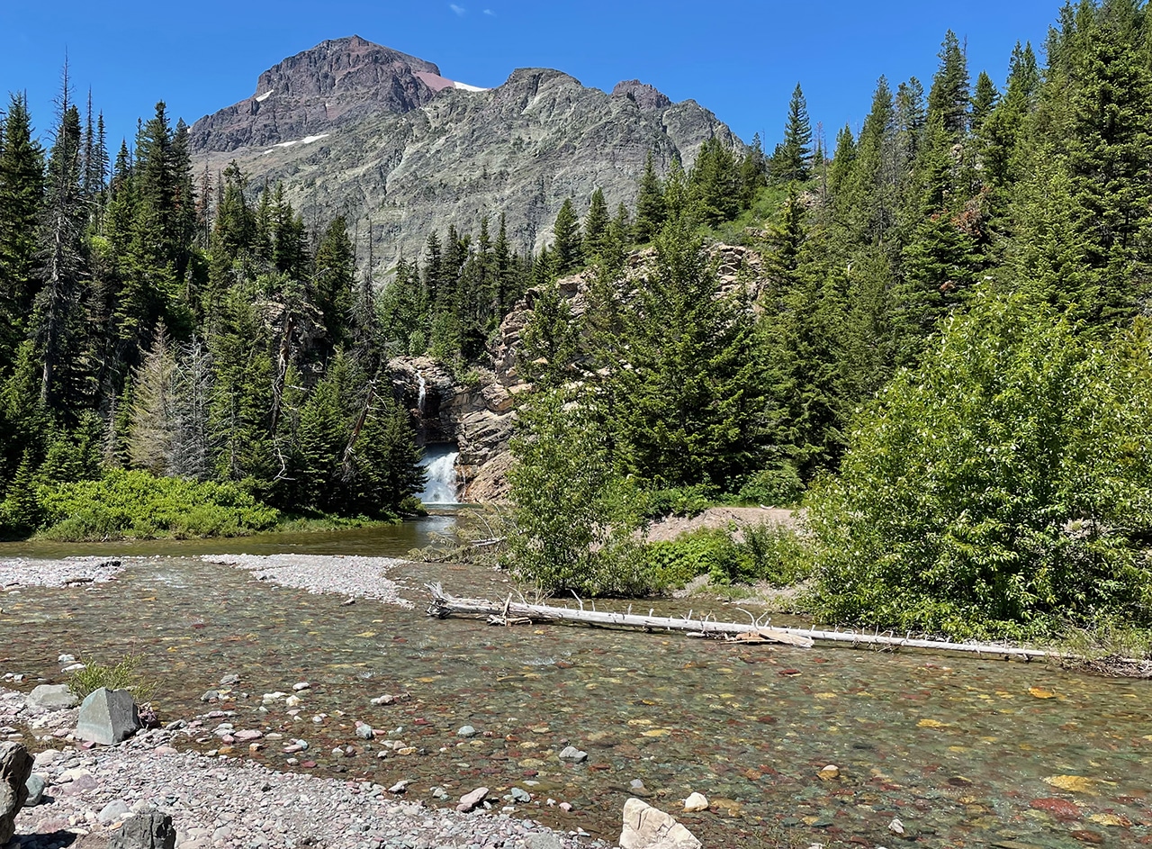 From the parking lot, it was just a short walk to the edge of Two Medicine Creek – and the clearest water I’ve seen in my life, burbling down a bed of multi-colored stones. A burbling creek has got to be number one on the list of nature’s stress-relievers – not that we’ve had much to be stressed about in the last five weeks.