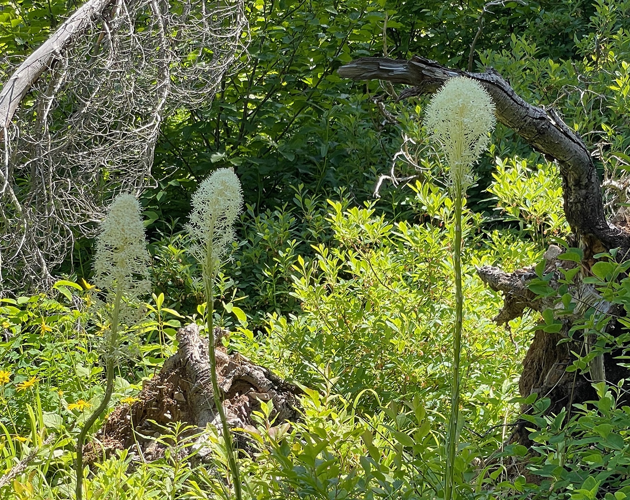 I talked to a ranger for a while who was stationed in the area to answer any questions that visitors may have. I asked him about the beautiful cream-colored flowers (pictured below) which were growing along the trail. They turned out to be Bear Grass. Yep, and guess who likes those flowers! As much as I’d like to see a bear up close, I really wouldn’t.