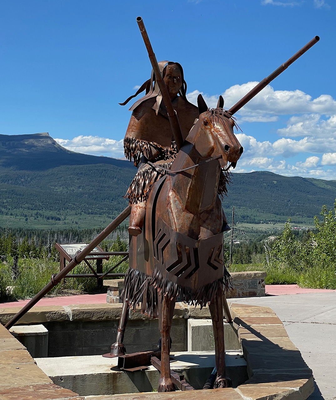 Running Eagle’s life story is an illustrious saga of leadership and many victories that are famous to this day. The story of her life was told by Pikuni elders in a true oral traditional manner. Running eagle is the only young woman of the Pikuni people to have gone on a four day fast; to suffer, dream, pray and find her medicine. High above the beautiful falls, her vision was successful…” ~ READ MORE on the sign to the right. >