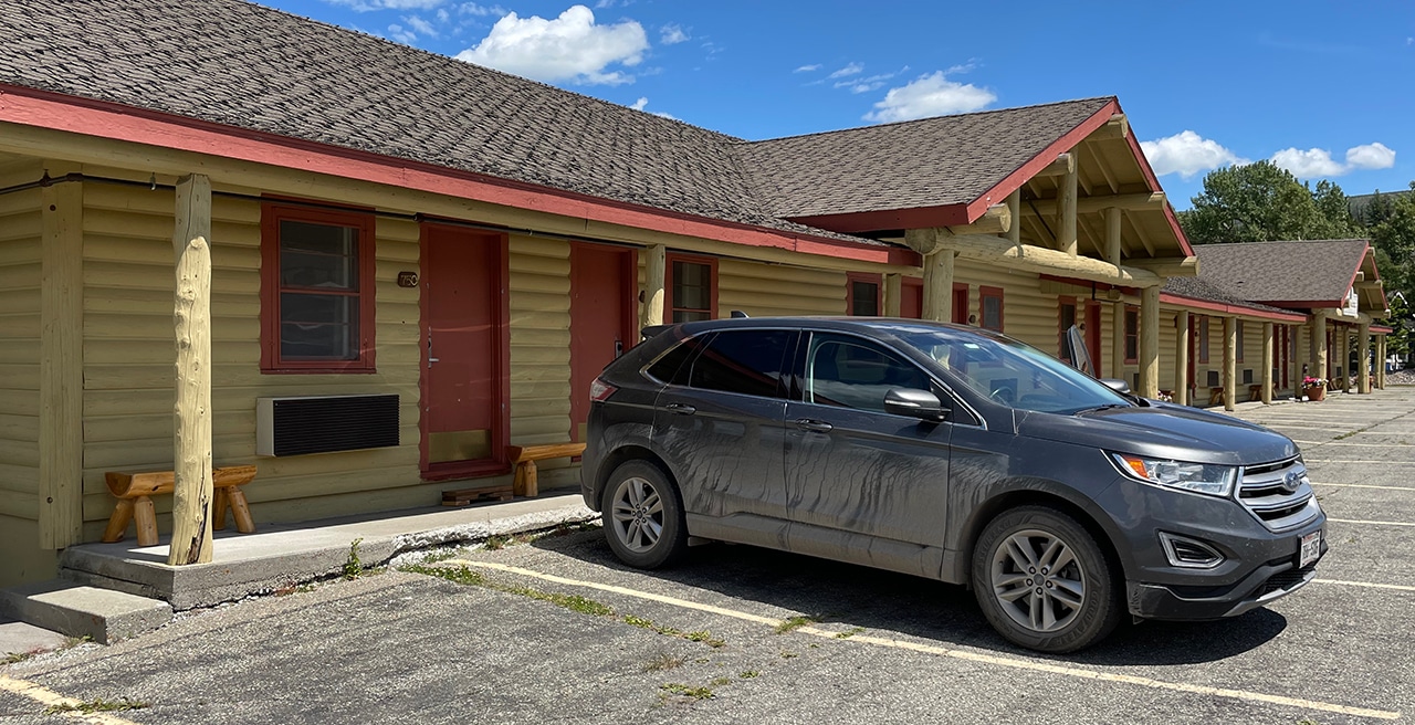 We checked into our 50s-style motel at St. Mary Lodge and Resort right at 4pm. As you’ll see from the first photo below (besides our filthy car), this motel was not the most glamorous of accommodations. But it was clean, had a king-sized bed, an updated bathroom, and it was literally steps from the St. Mary entrance to Glacier National Park. I actually did walk to the sign.