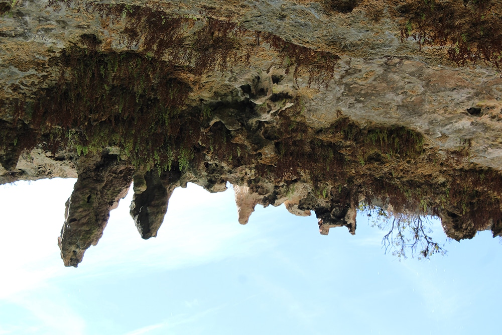 The pool is surrounded by large slabs of limestone that rest by the water’s edge; large stalactites grow from the ceiling high above. The ceiling and surrounding cliffs of the grotto are home to moss, maidenhair fern and cliff swallows. The Ashe juniper (cedar) uplands of the preserve are home to the endangered golden-cheeked warbler.