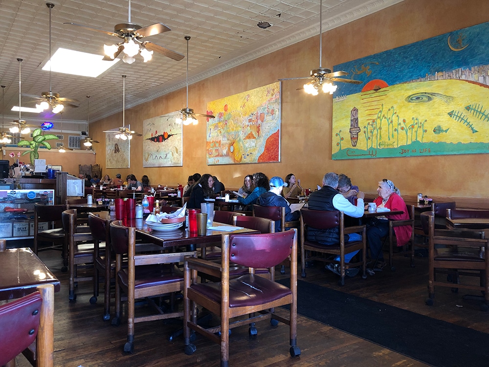 Although we were a little offended by the “Hippies Use Back Door” sign in the window, I got excited seeing the shop in the photo below. That was until we realized it was a smoke shop – for all your cigarette, cigar, and chew needs. Never mind. We gravitated towards some breakfast at Cafe on the Square before heading out. I really liked the immense paintings on the wall of the diner that have remained on those walls for years – from owner to owner. The breakfast burrito was pretty good too!