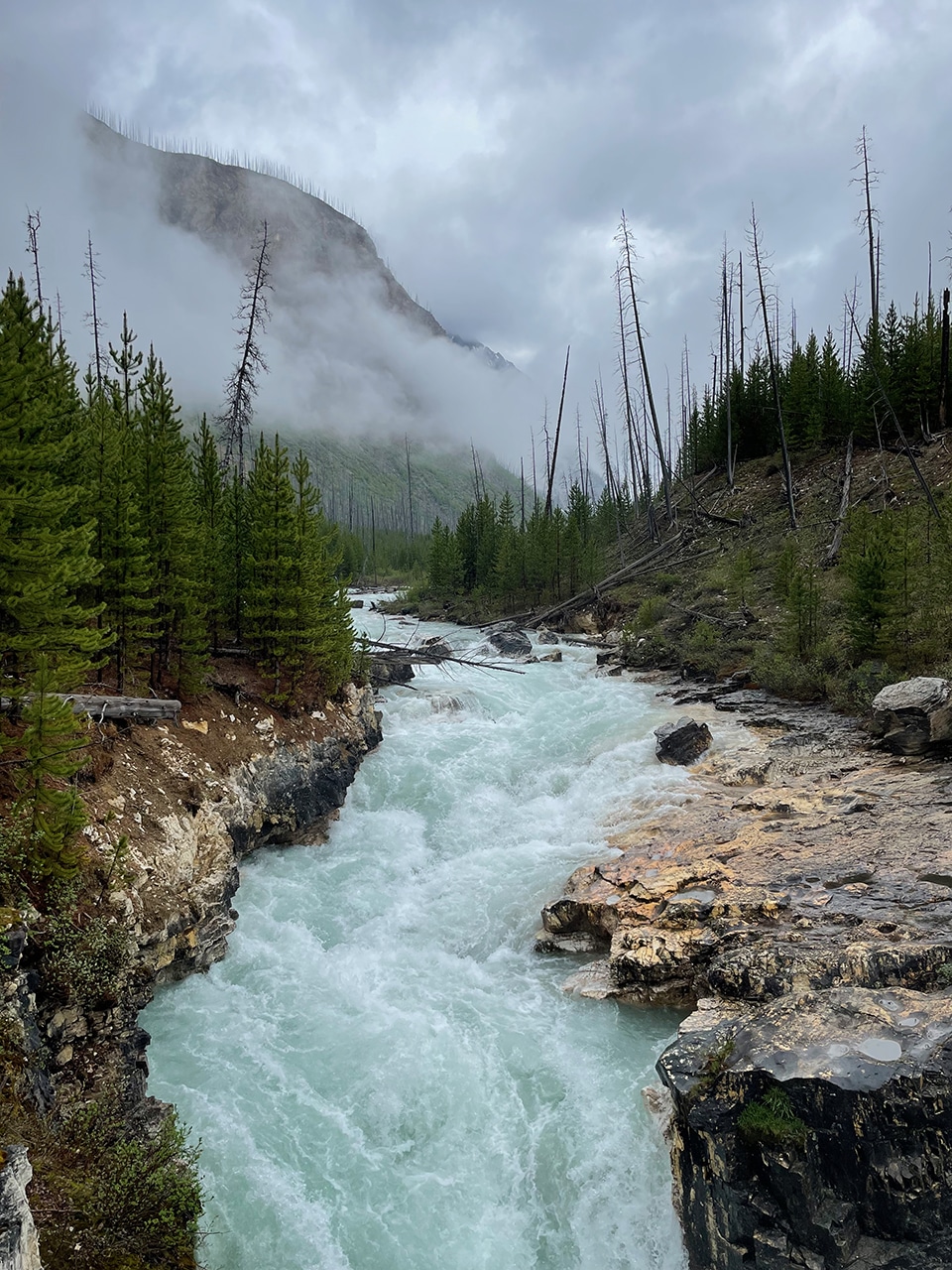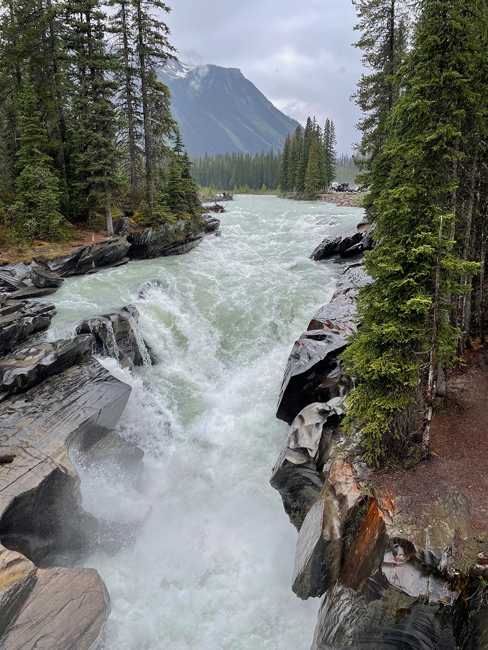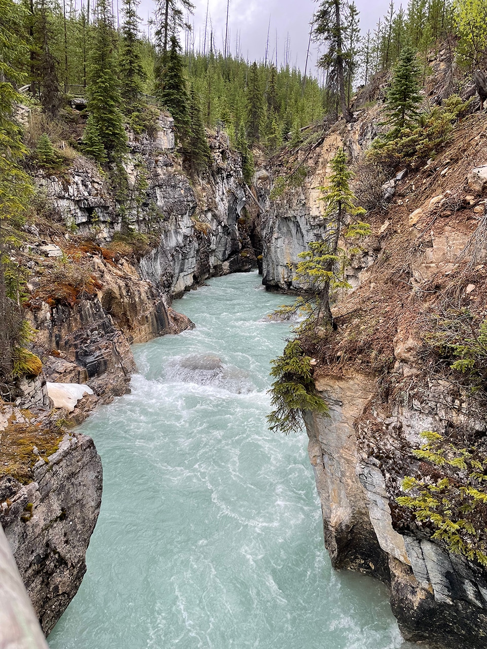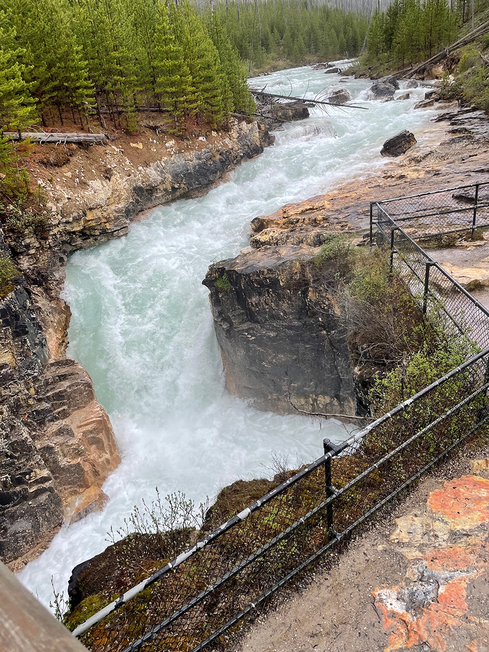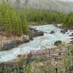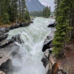 Also in Kootenay National Park, Numa Falls is located along the Banff-Windermere Highway (Kootenay Highway). The falls are easily accessed from a small parking lot and then a short and wonderful walk along the glacially fed Vermilion River. You can spot glacially fed lakes and rivers by their lovely bluish-green waters. Since there’s not a lot of sun today, the water is almost milky.