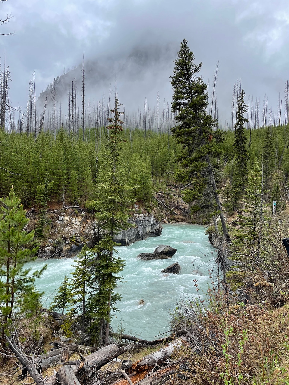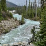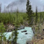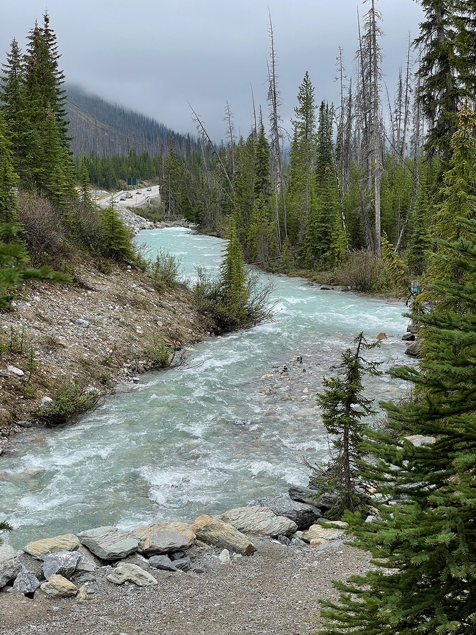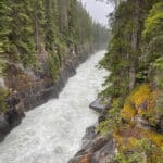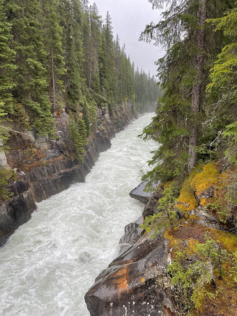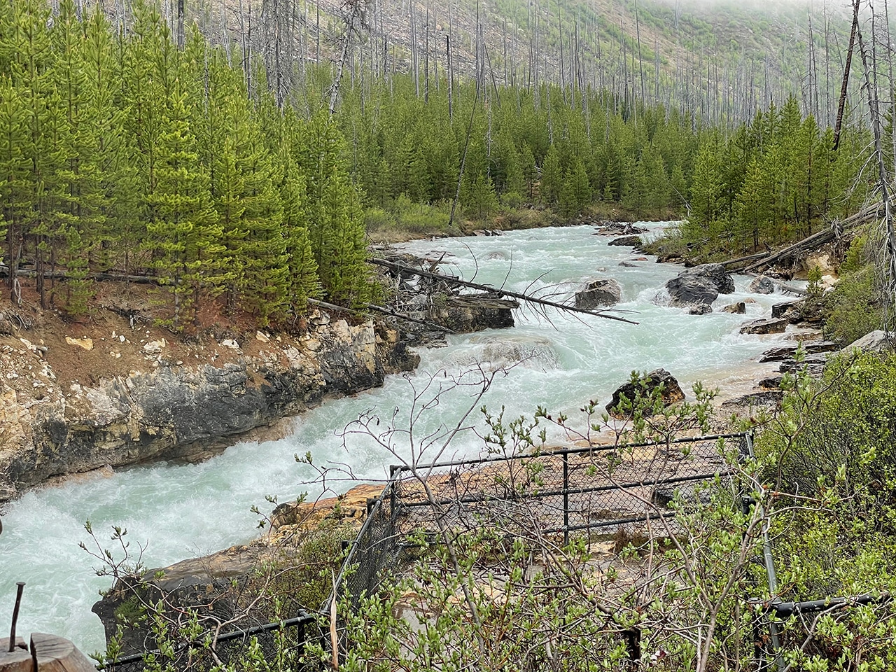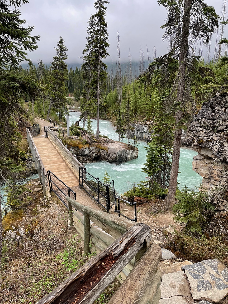 Also in Kootenay National Park, Numa Falls is located along the Banff-Windermere Highway (Kootenay Highway). The falls are easily accessed from a small parking lot and then a short and wonderful walk along the glacially fed Vermilion River. You can spot glacially fed lakes and rivers by their lovely bluish-green waters. Since there’s not a lot of sun today, the water is almost milky.