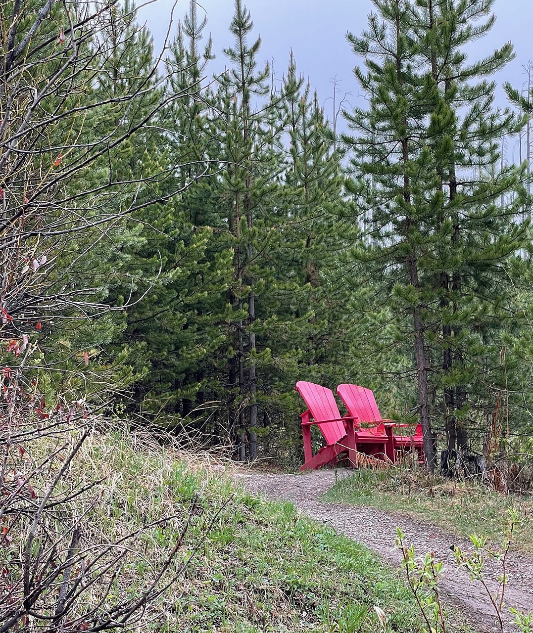A pair of Parks Canada Red Chairs were calling our names, and they did look tempting. We decided to trudge on because the longer we took, the more drippy it got out here. We found a few more red chairs at other locations along our trip.