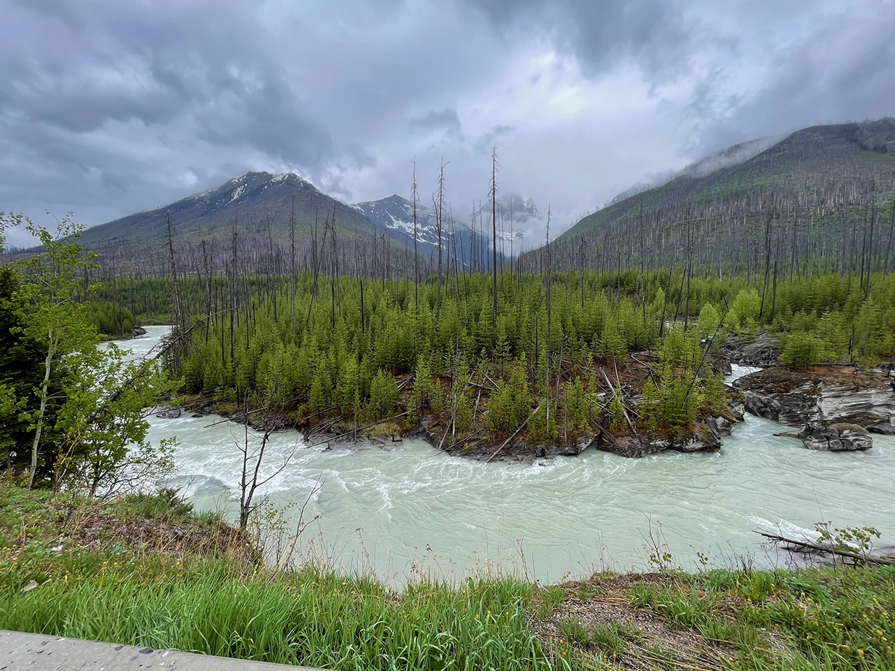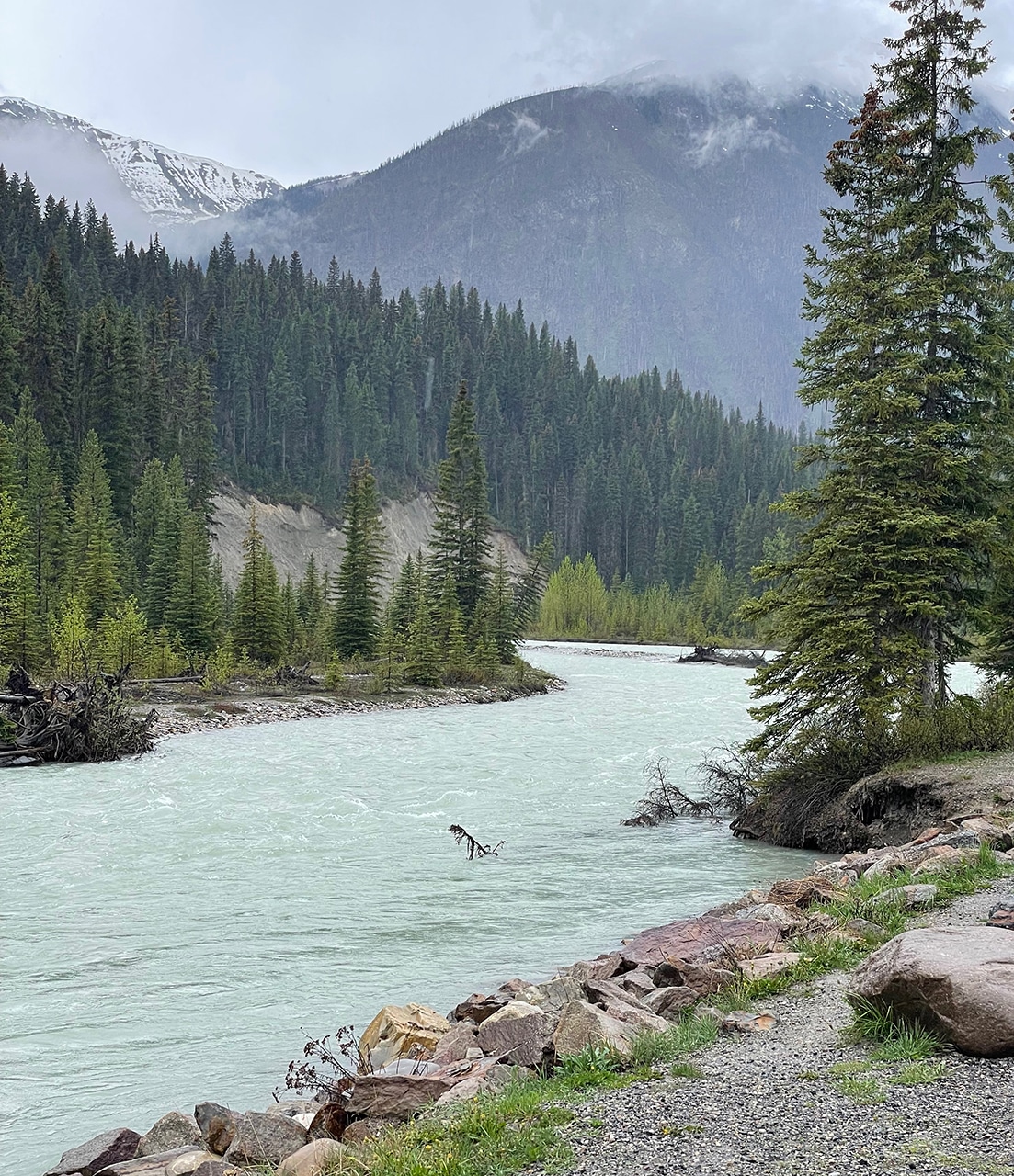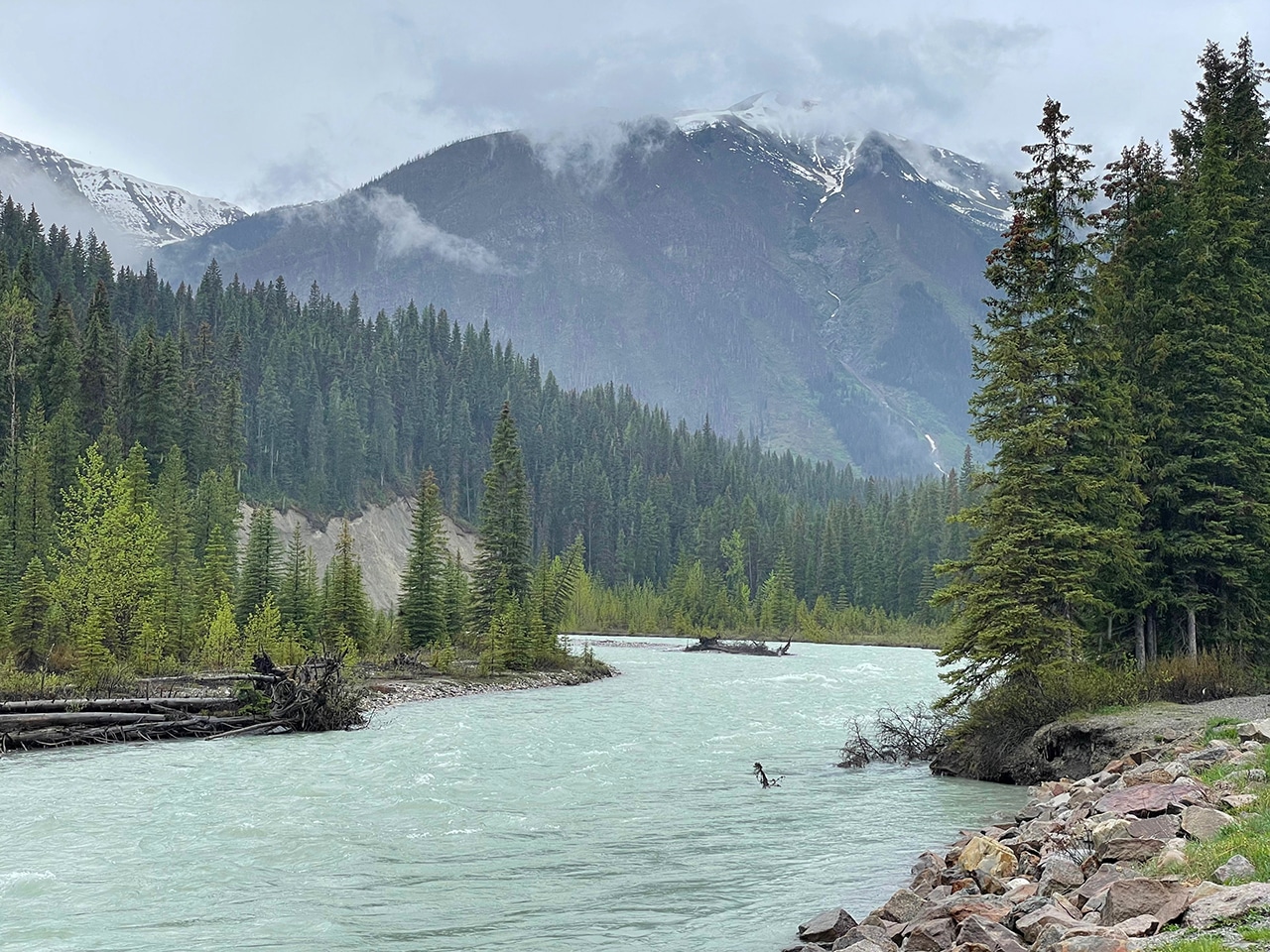 Our first day out and about took us by the Continental Divide (left) and into the north end of Kootenay National Park in the Canadian Rockies of British Columbia. Of the bevy of coats that we packed for this trip, the raincoats came out today – not because we needed them this minute, but we will be needing them at one point by the looks of that sky.