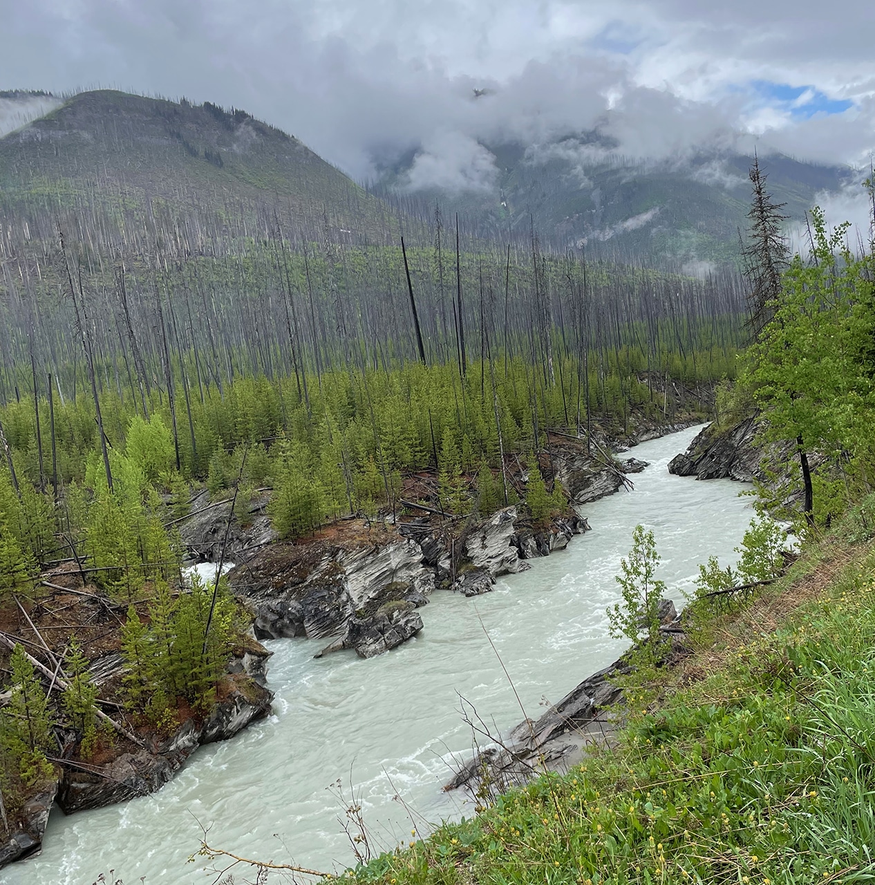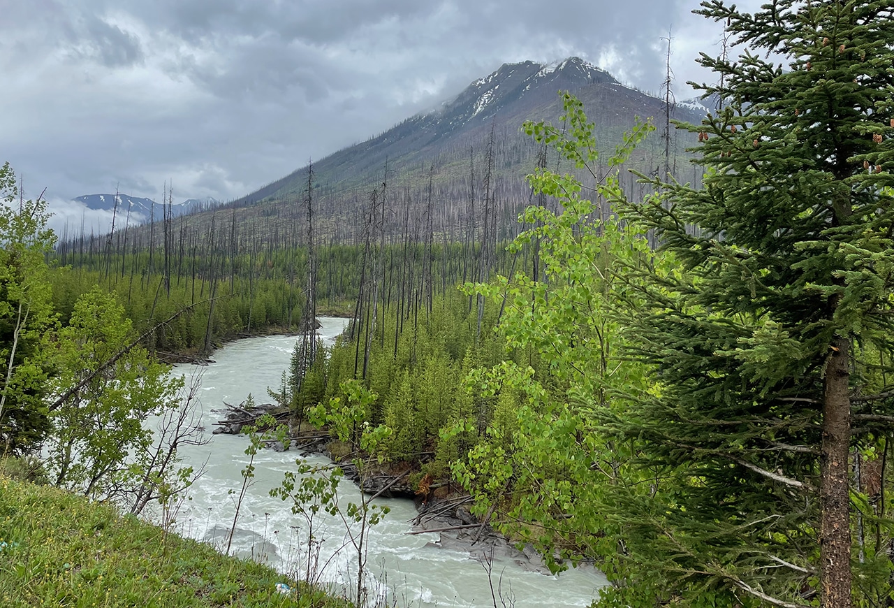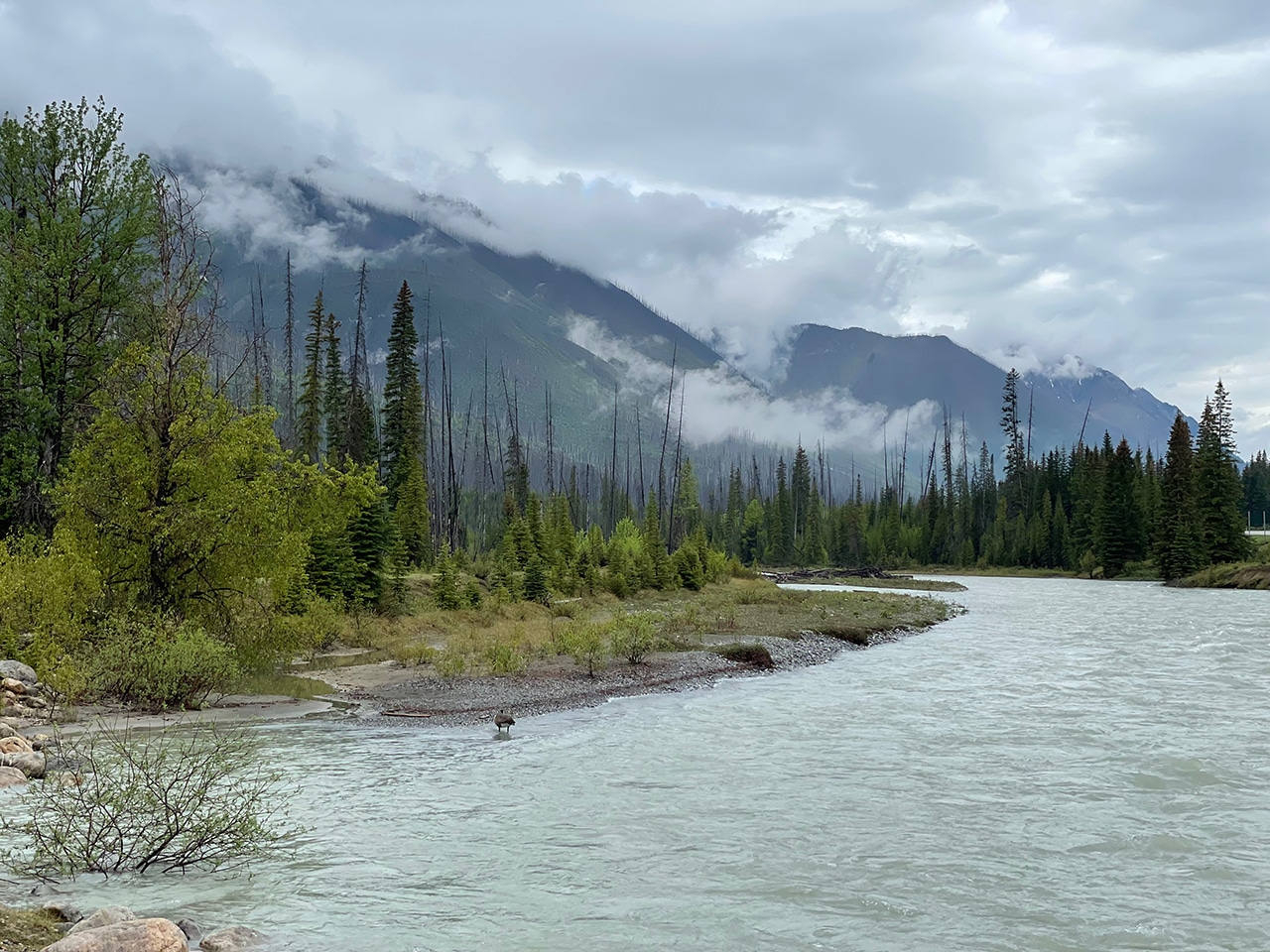 Our first day out and about took us by the Continental Divide (left) and into the north end of Kootenay National Park in the Canadian Rockies of British Columbia. Of the bevy of coats that we packed for this trip, the raincoats came out today – not because we needed them this minute, but we will be needing them at one point by the looks of that sky.