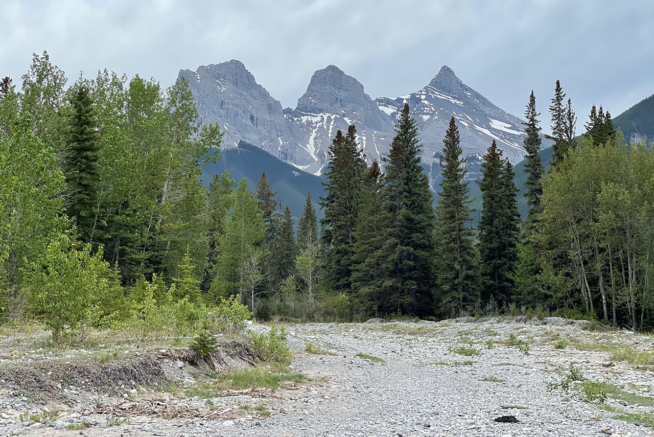 From the patio of our condo we had an obscured view of some mountains, including Little Sister (far left peak above). The trees made it difficult to see it from here, but all Three Sisters welcomed us as we ventured out everyday. And from a viewpoint just a couple minutes south, a short walk along a now-dry riverbed got us an even better view.