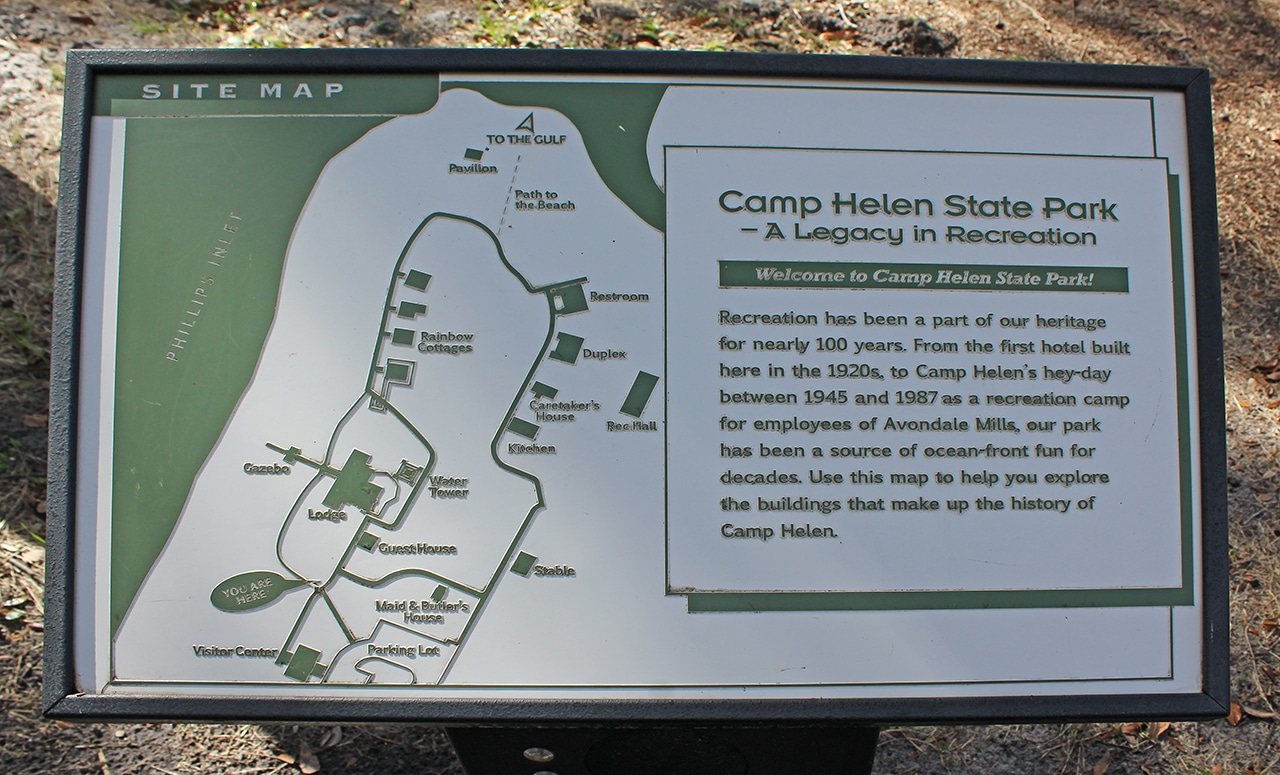 According to the sign pictured below: “From the first hotel built here in the 1920s to Camp Helen’s hey-day between 1945 and 1987 as a recreation camp for employees of Avondale Mills, our park has been a source of ocean-front fun for decades.”