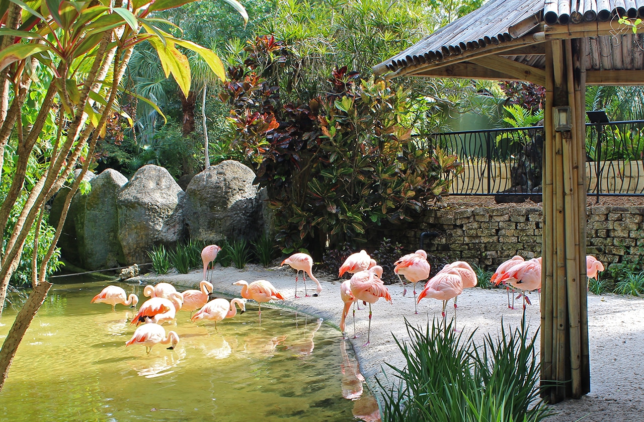 In 2016, twenty Chilean flamingos were added in with the two remaining flamingos from the original 17-bird flock. George and Lucy have lived here since 1956, and now have some youngsters to keep them company. Also on the grounds are turtles, fish in the ponds, quite an assortment of other birds (macaws, parrots, laughing kookaburras and more) and a wonderful butterfly garden.
