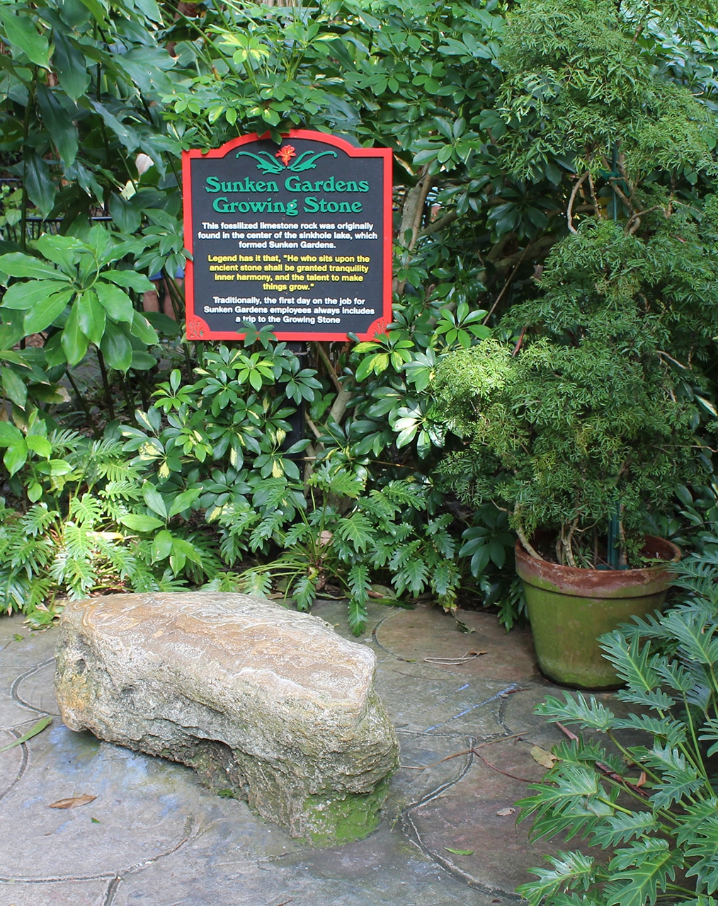 The Sunken Garden Growing Stone was originally found in the center of the sinkhole lake, which formed Sunken Gardens. Legend has it that, “He who sits upon the ancient stone shall be granted tranquility, inner harmony, and the talent to make things grow.” Of course I had to give it a try.