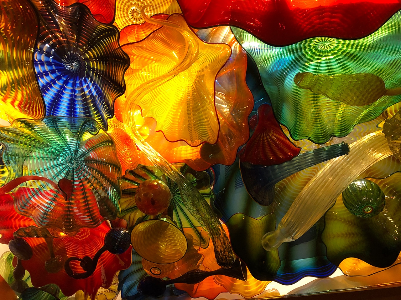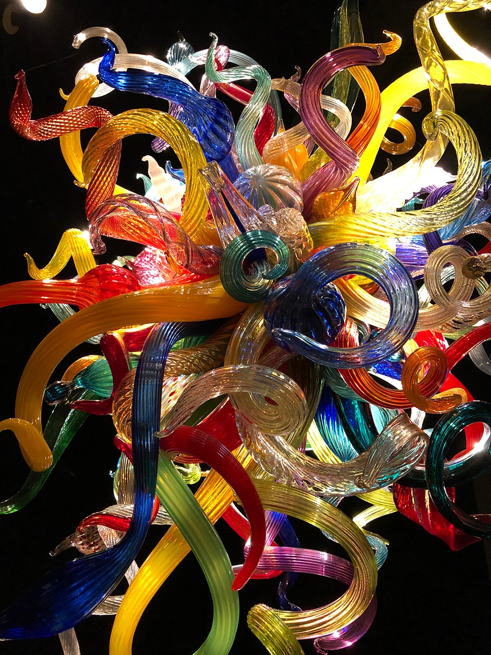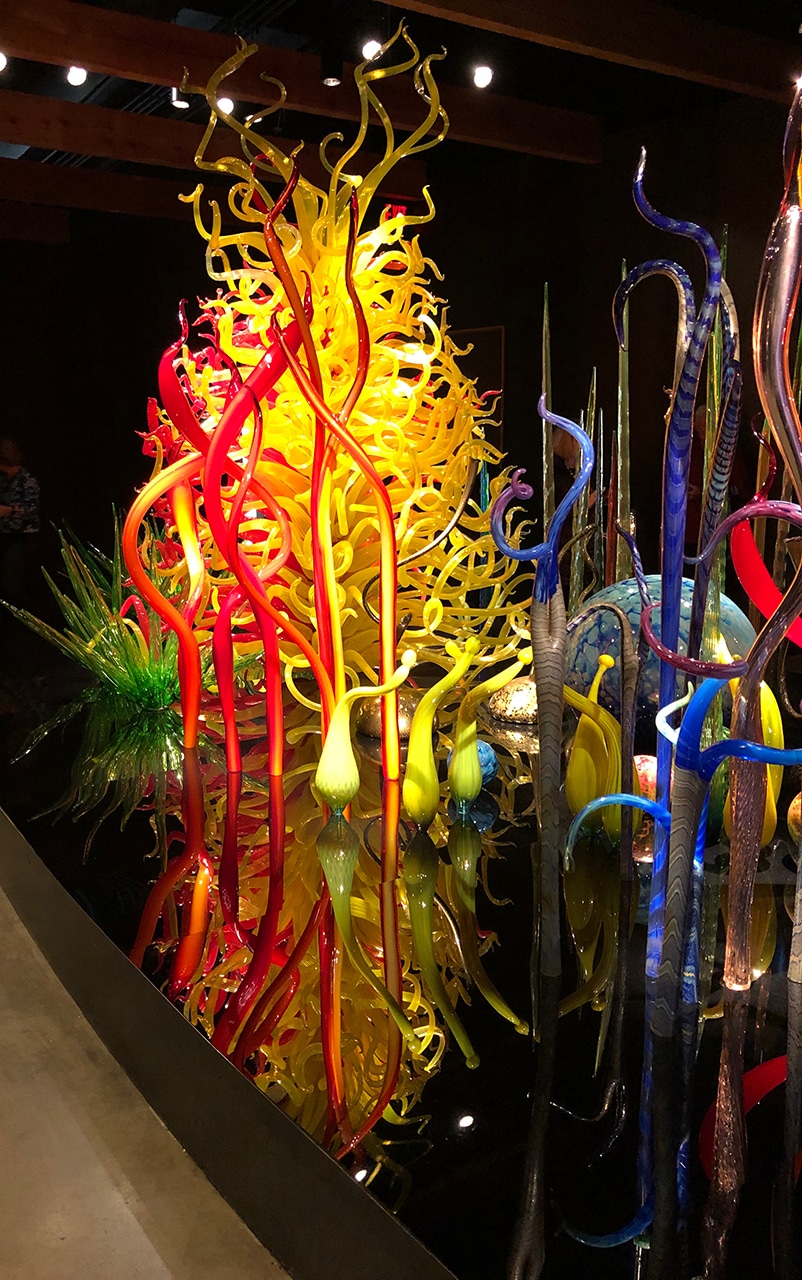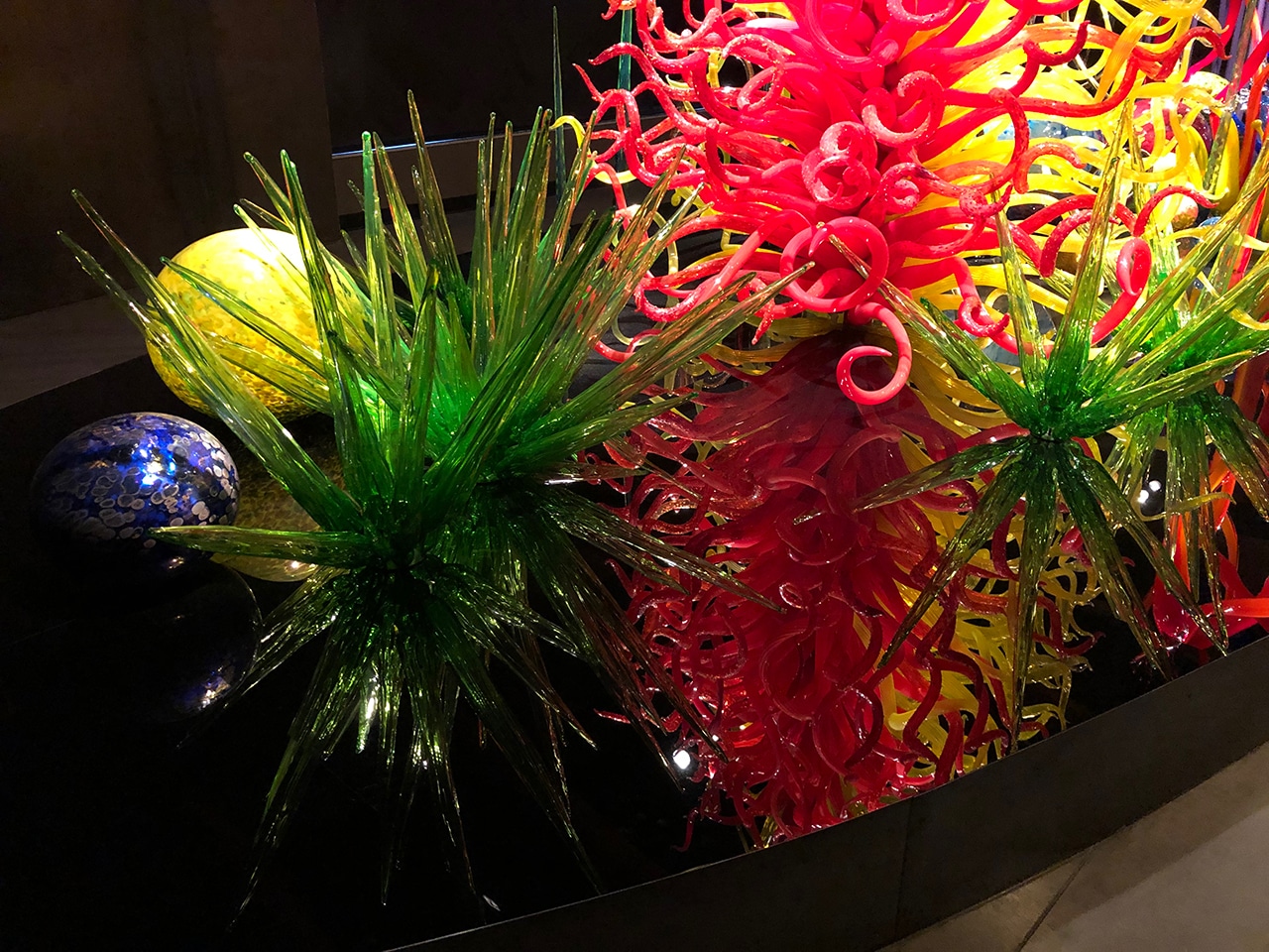 Toward the end of our visit we watched a film that was running continuously in a room with many chairs. It felt good to sit for a while and although we didn’t see the entire film, what we did see was very inspiring. There was old footage of Chihuly experimenting and pushing the envelope as a young man. It was fun to hear of his travels to other countries where he met others who loved playing with fire and glass as much as he did, learning of their different procedures, sharing their love of the art and expanding their creativity in the craft.