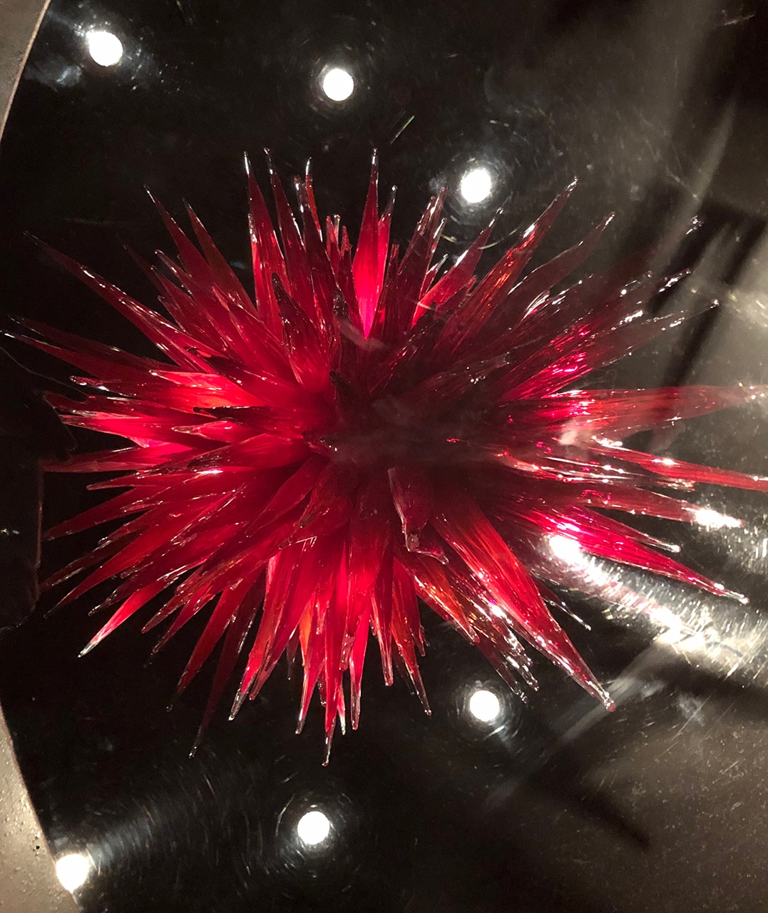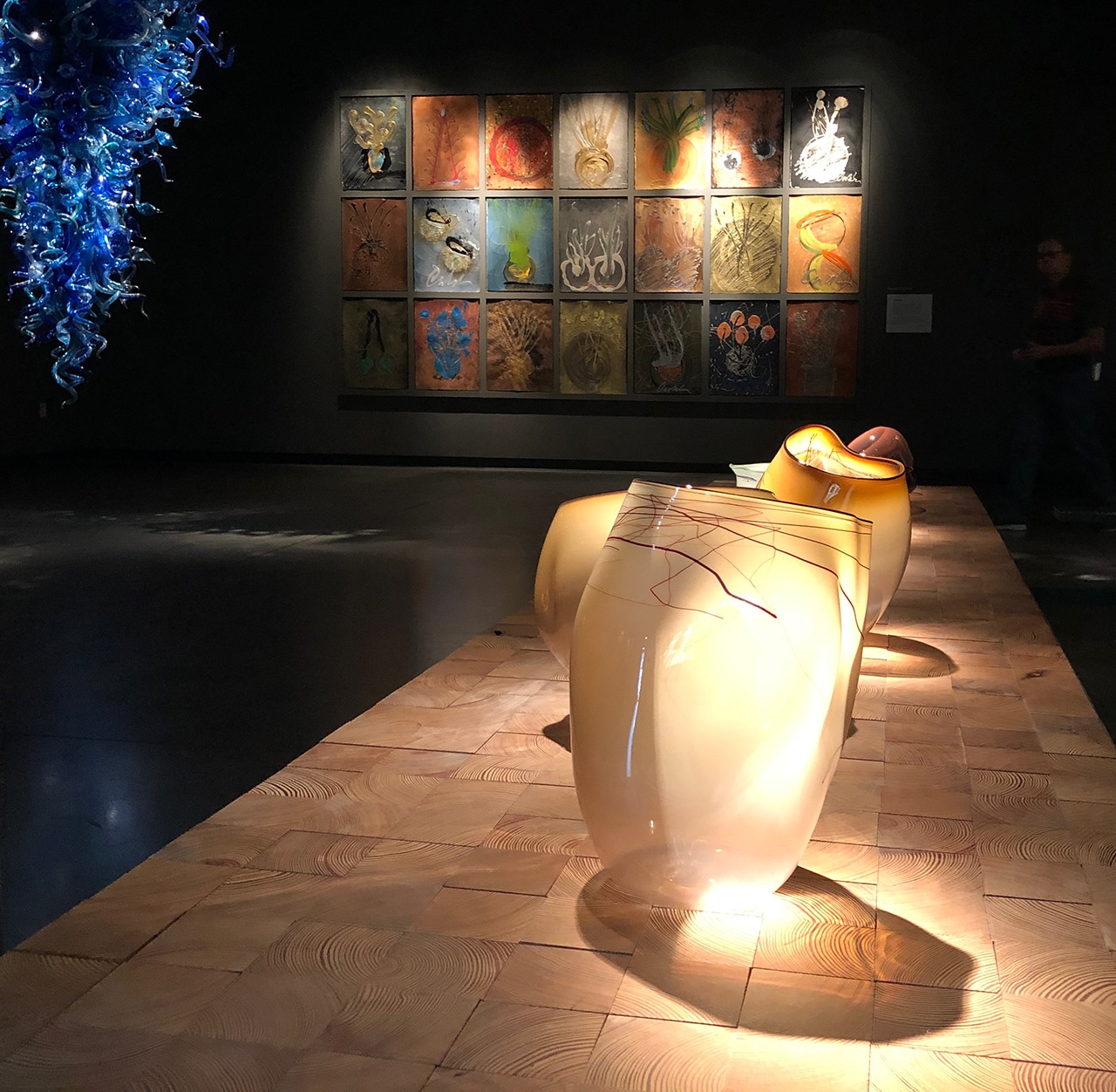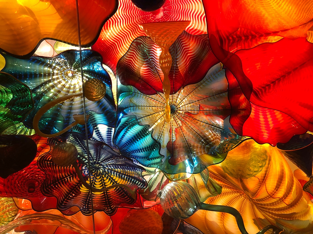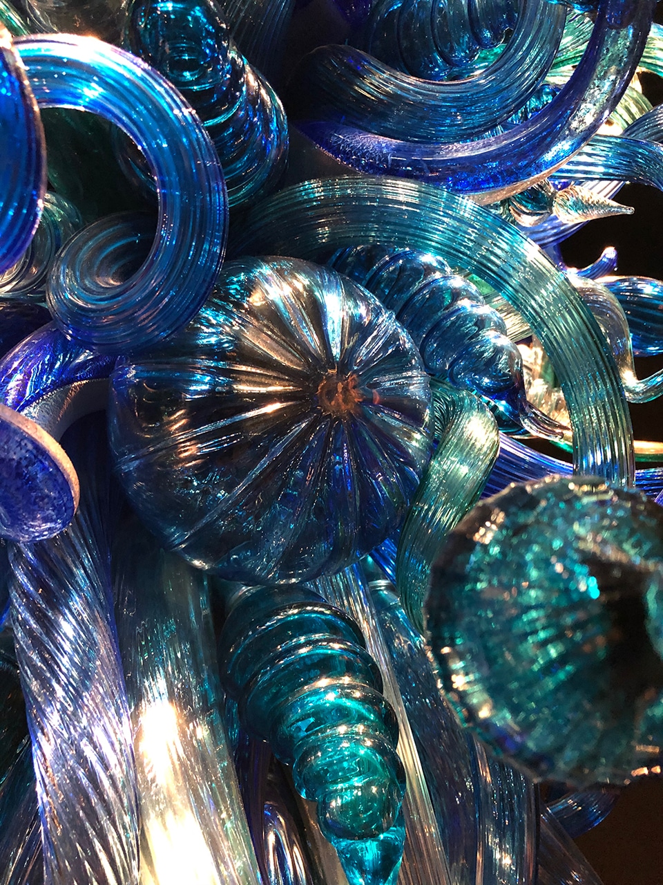 Toward the end of our visit we watched a film that was running continuously in a room with many chairs. It felt good to sit for a while and although we didn’t see the entire film, what we did see was very inspiring. There was old footage of Chihuly experimenting and pushing the envelope as a young man. It was fun to hear of his travels to other countries where he met others who loved playing with fire and glass as much as he did, learning of their different procedures, sharing their love of the art and expanding their creativity in the craft.