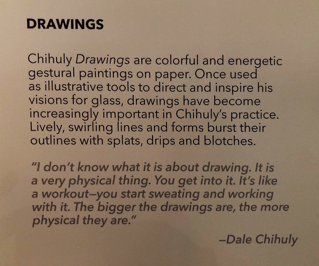 Chihuly’s drawings are displayed throughout the gallery and were used to inspire his visions for glass. “Lively, swirling lines and forms burst their outlines with splats, drips and blotches.” The drawings were almost as beautiful as the blown glass they inspired.