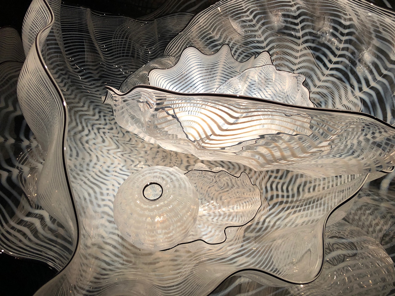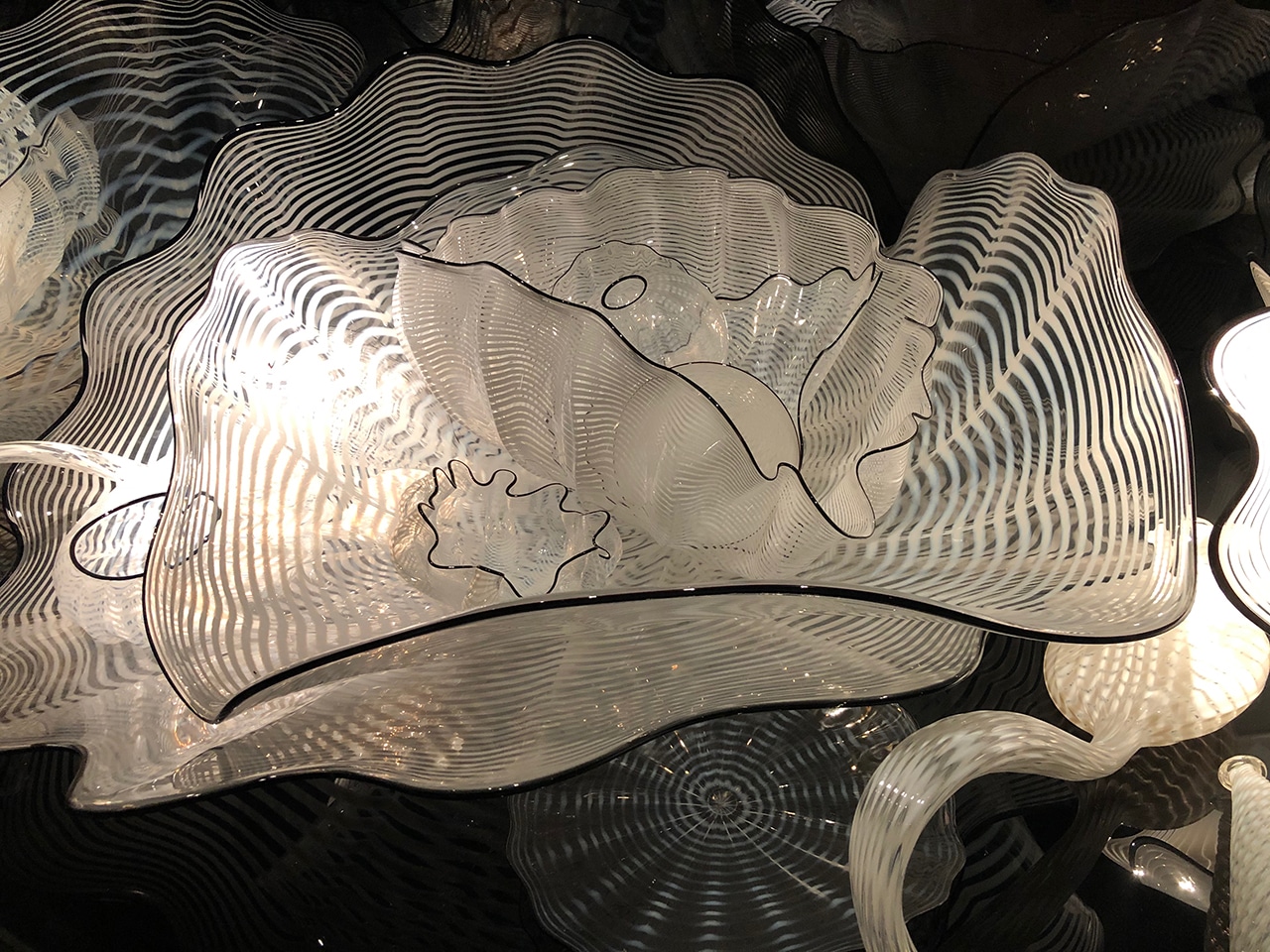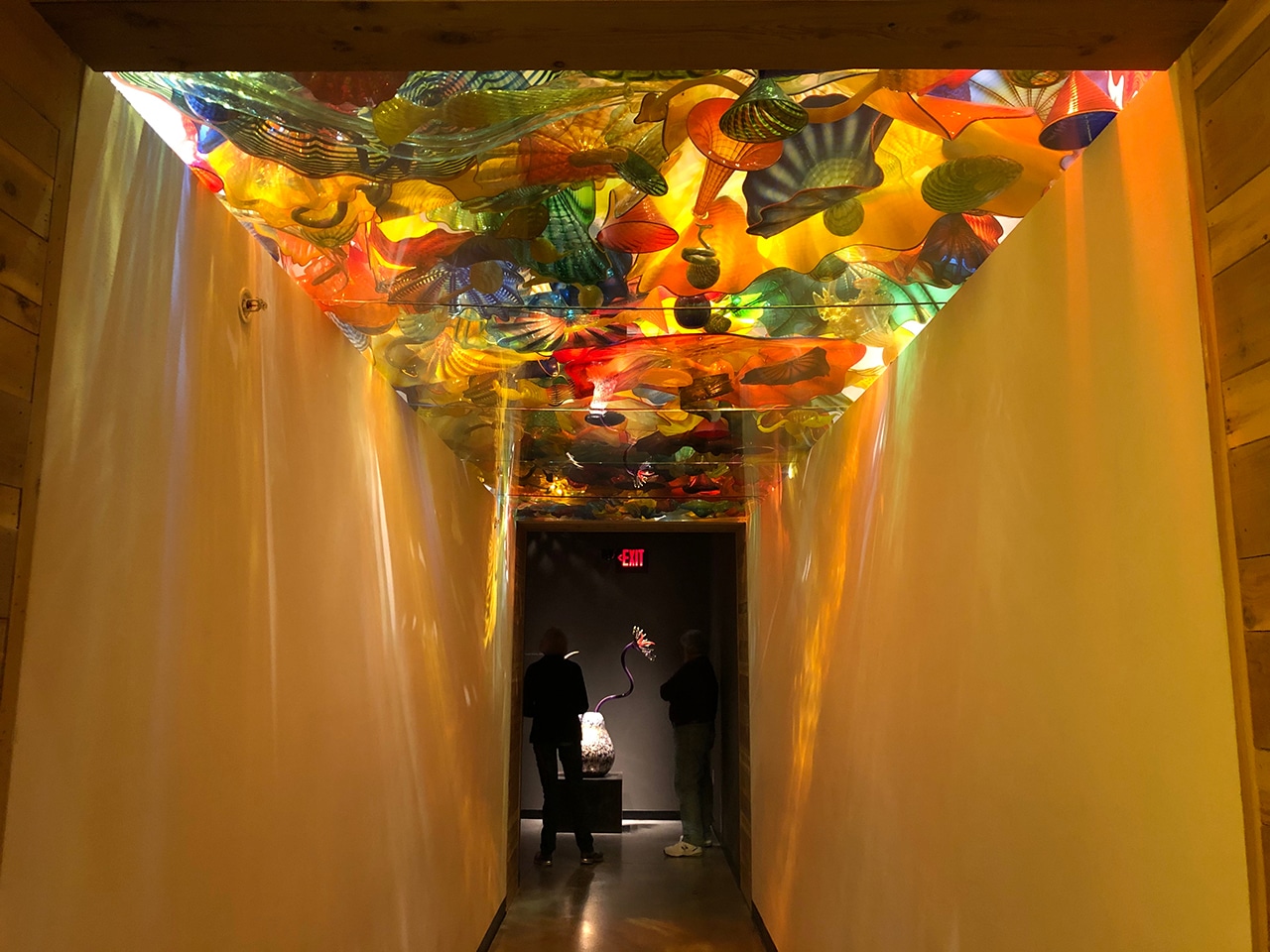 Moving from one room to another was treat, as we passed under a beautiful display of random pieces on a plexiglass ceiling. The lighting above the display was amazing to me, and it was difficult to leave that area with its bright and beautiful colors and the fabulous wavy and textured glass.