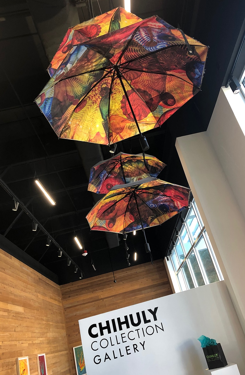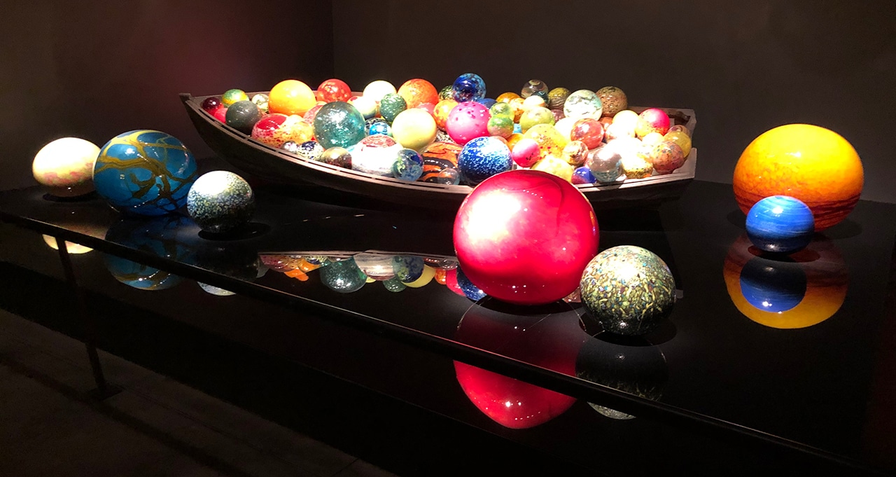“A trip to Tokyo in 1989, was the inspiration for his Niijima Floats, which range in size from one to nearly four feet in diameter, truly stretching the technical limits of glassblowing... Their kaleidoscopic colors, often highlighted by gold and silver leaf, are reminiscent of both Japanese lacquerware and Chihuly’s childhood marbles, which he also linked to his early love of glass.” – READ MORE
