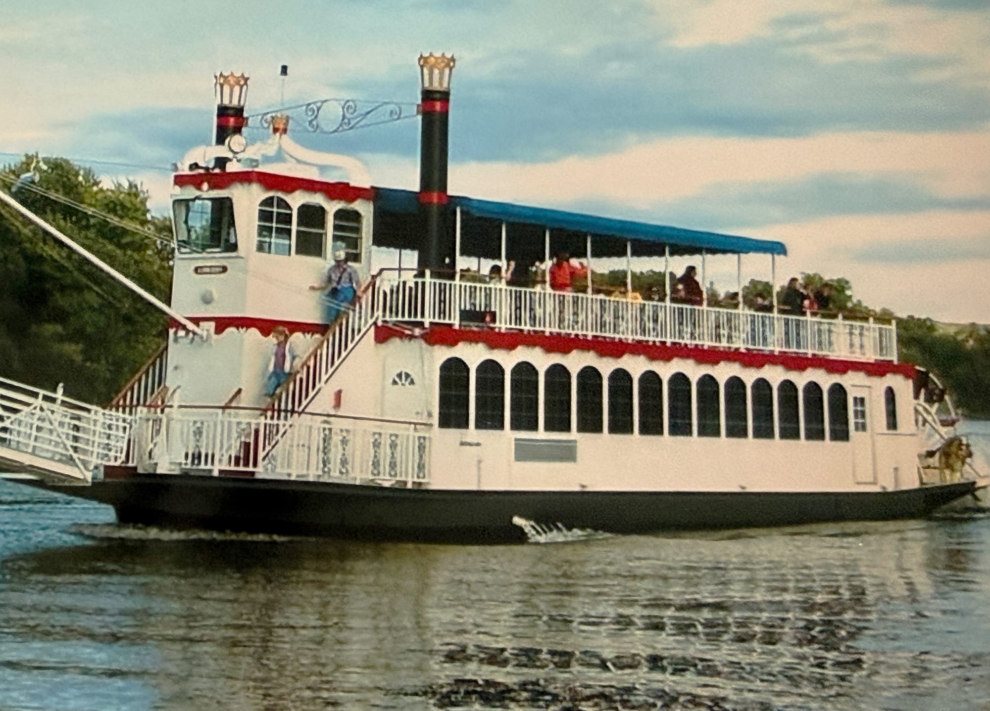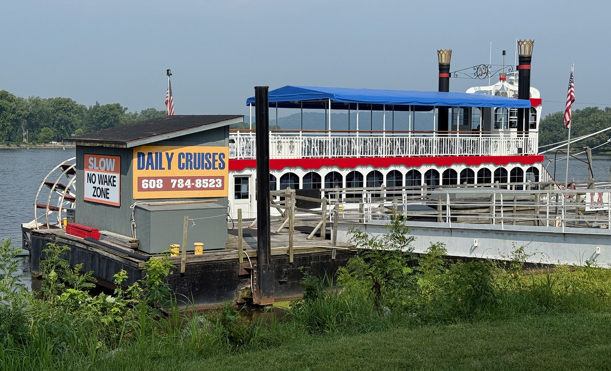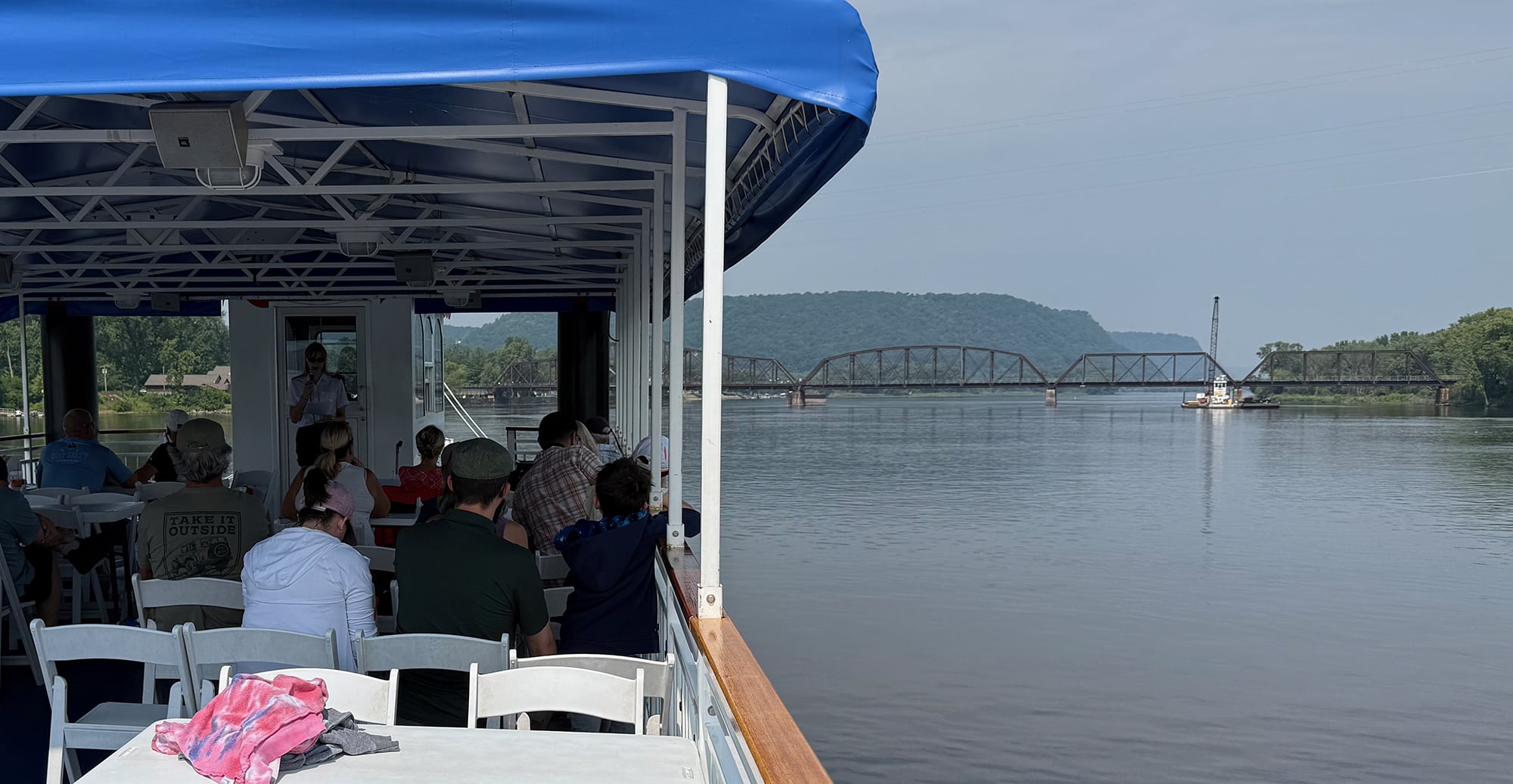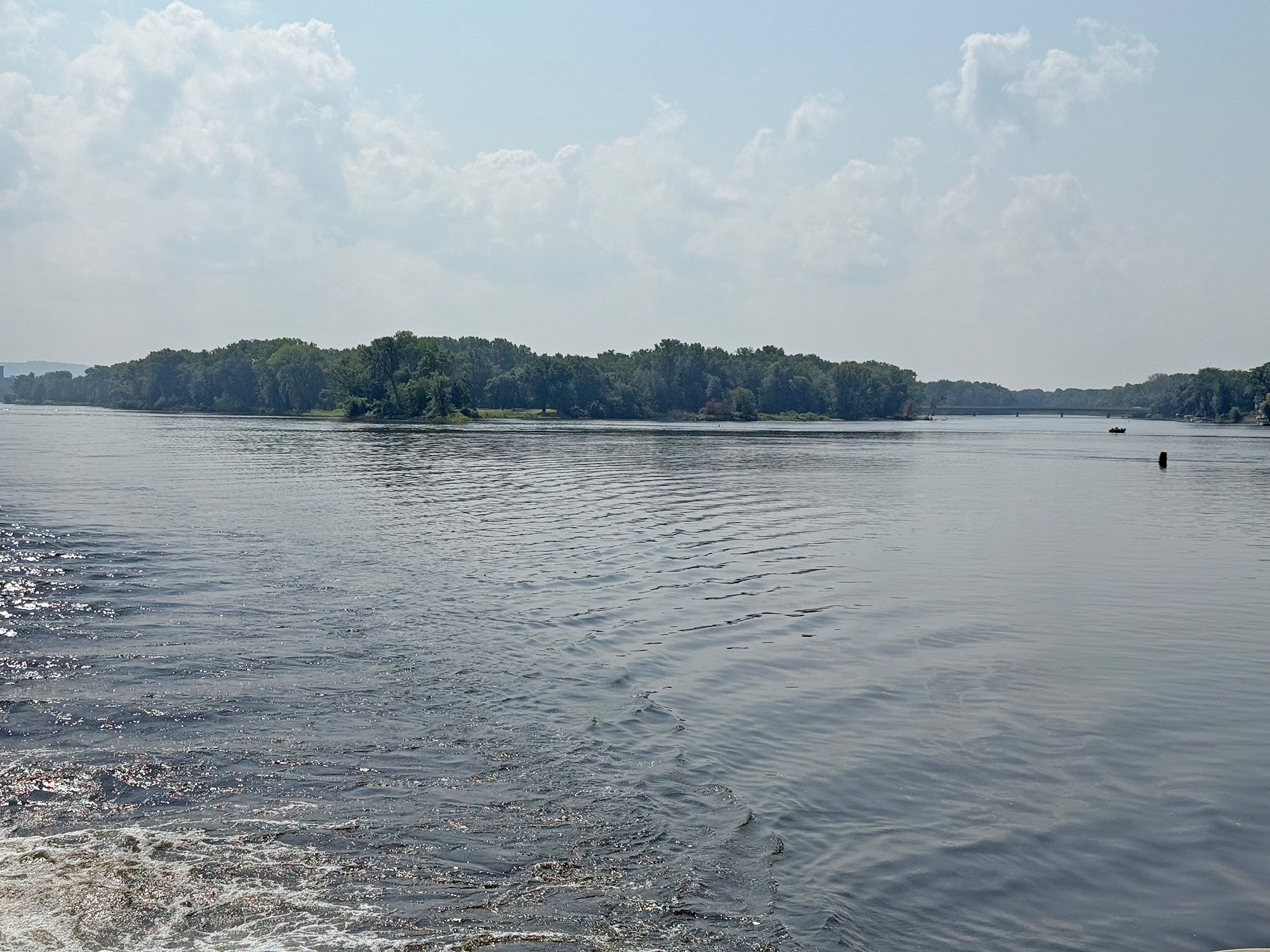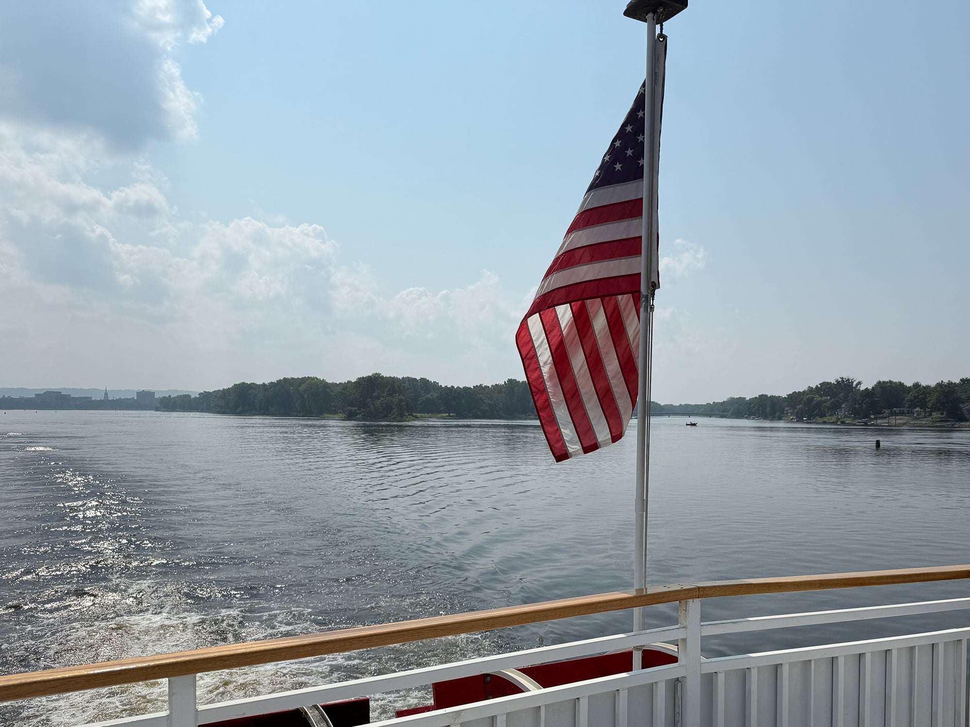 The next morning we walked a beautiful six minutes to the 11 a.m. Sightseeing Cruise aboard the La Crosse Queen. We took a seat at some picnic tables nearby while we waited to board. Just upriver we could see where the Black River joins the Mississippi and as it turned out, we were sitting right by the La Crosse River which also flows into the Mississippi.