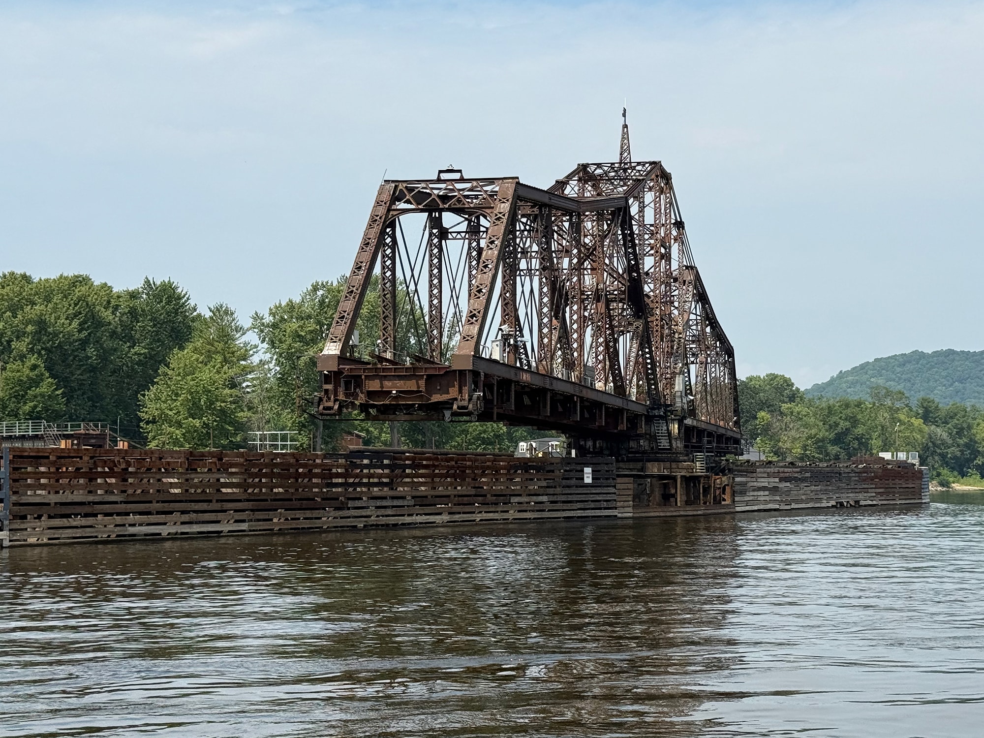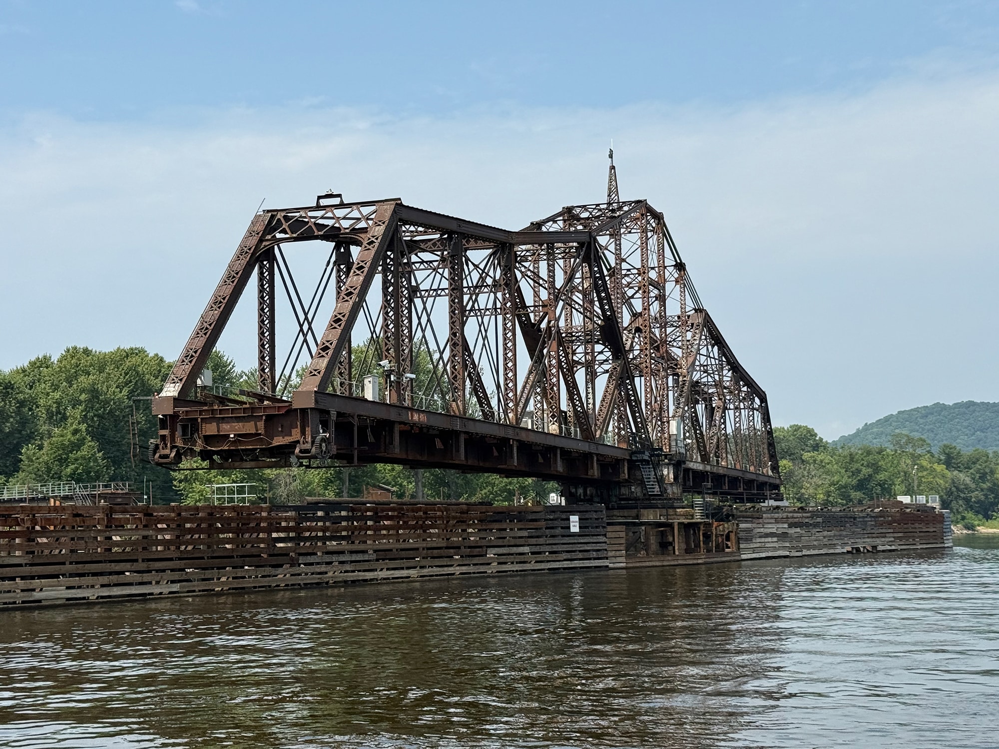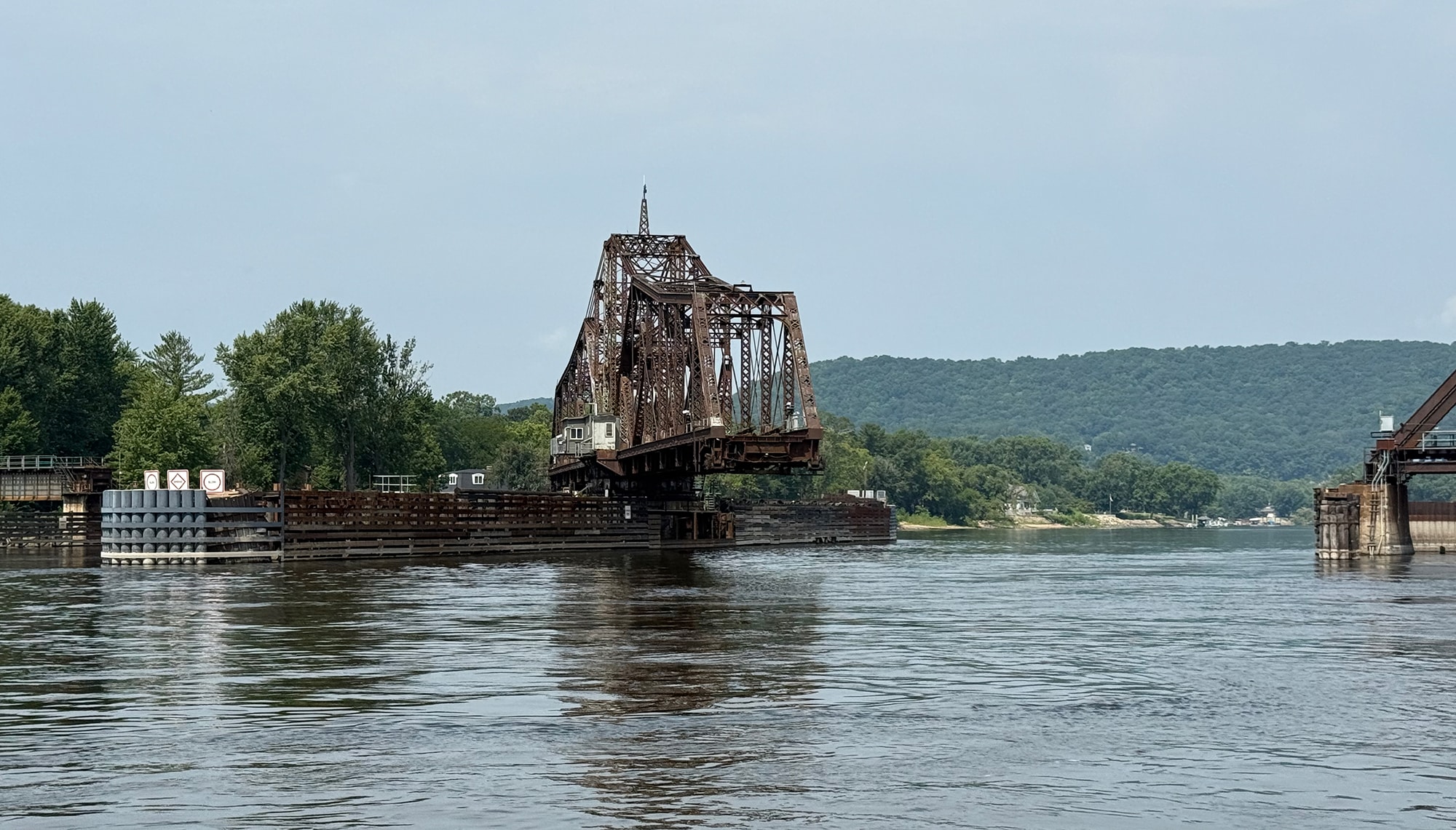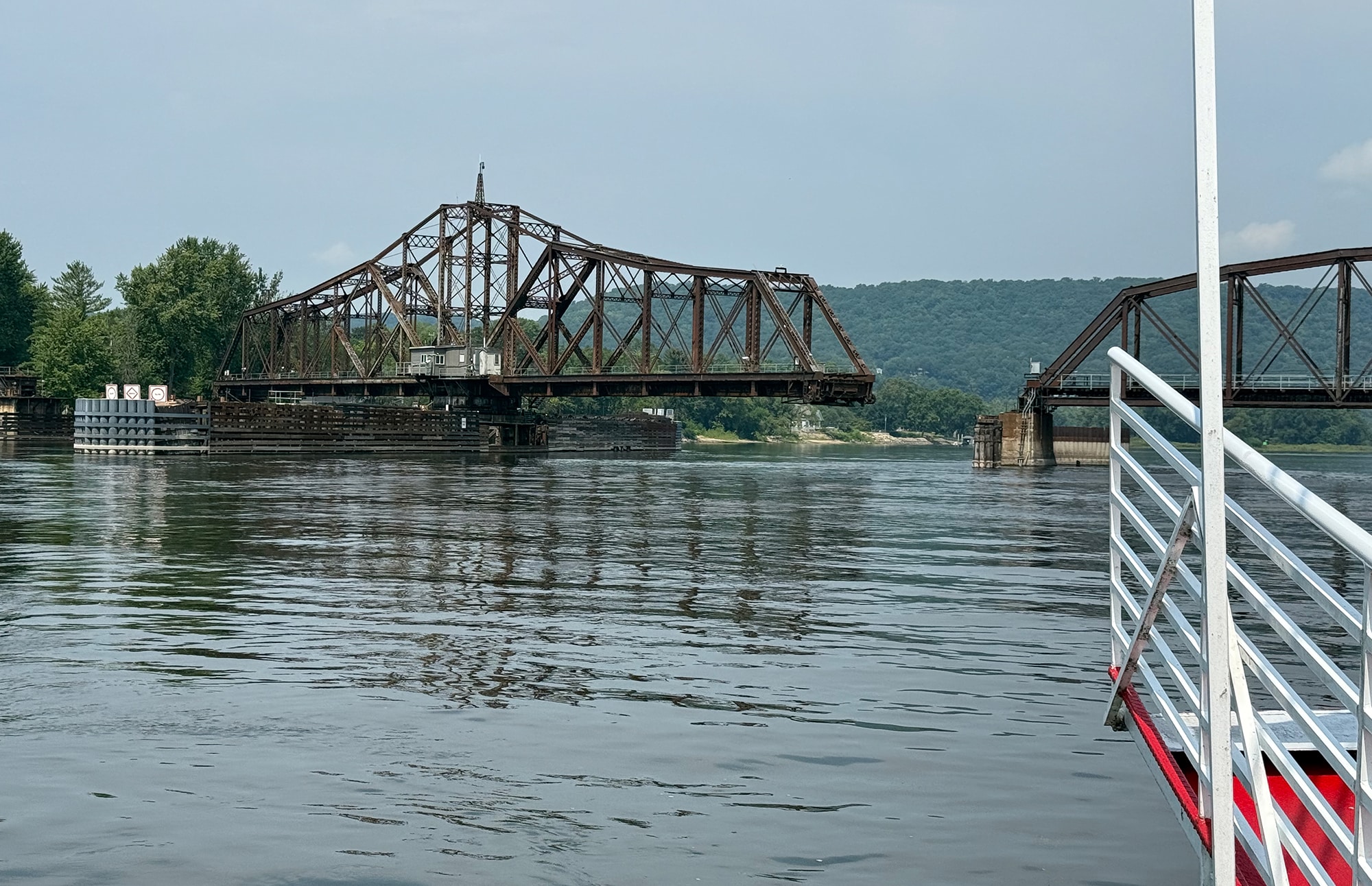 That turned out to be a very cool delay, since this bridge is one of only a few remaining swing bridges on the Mississippi River, and we were fortunate enough to watch it open for us. After the train passed by, of course! This bridge is “designed to rotate horizontally around a central vertical pivot”, allowing both boats and trains to pass through (one after the other). And our small boat was more easily inconvenienced than that speeding train!