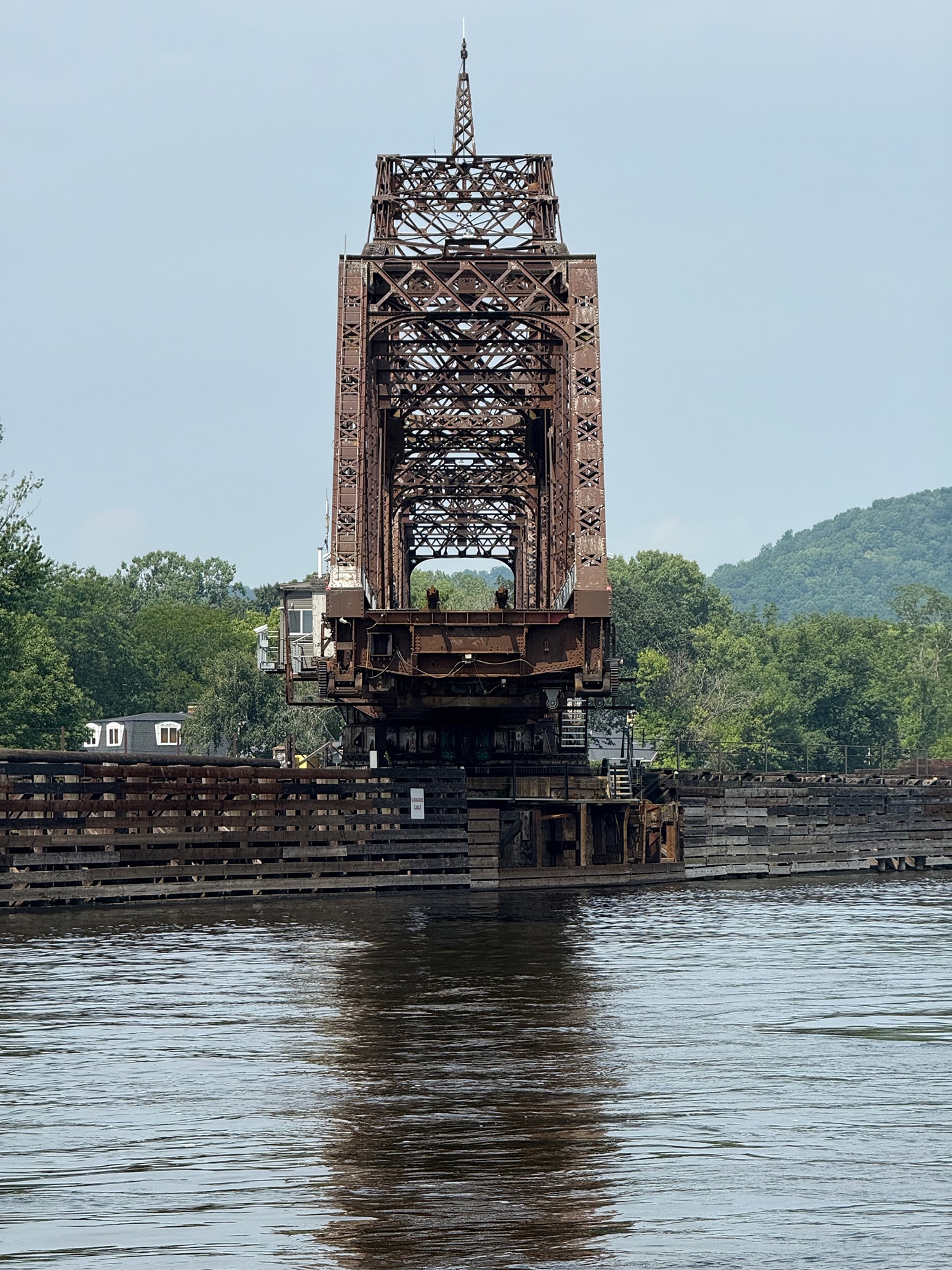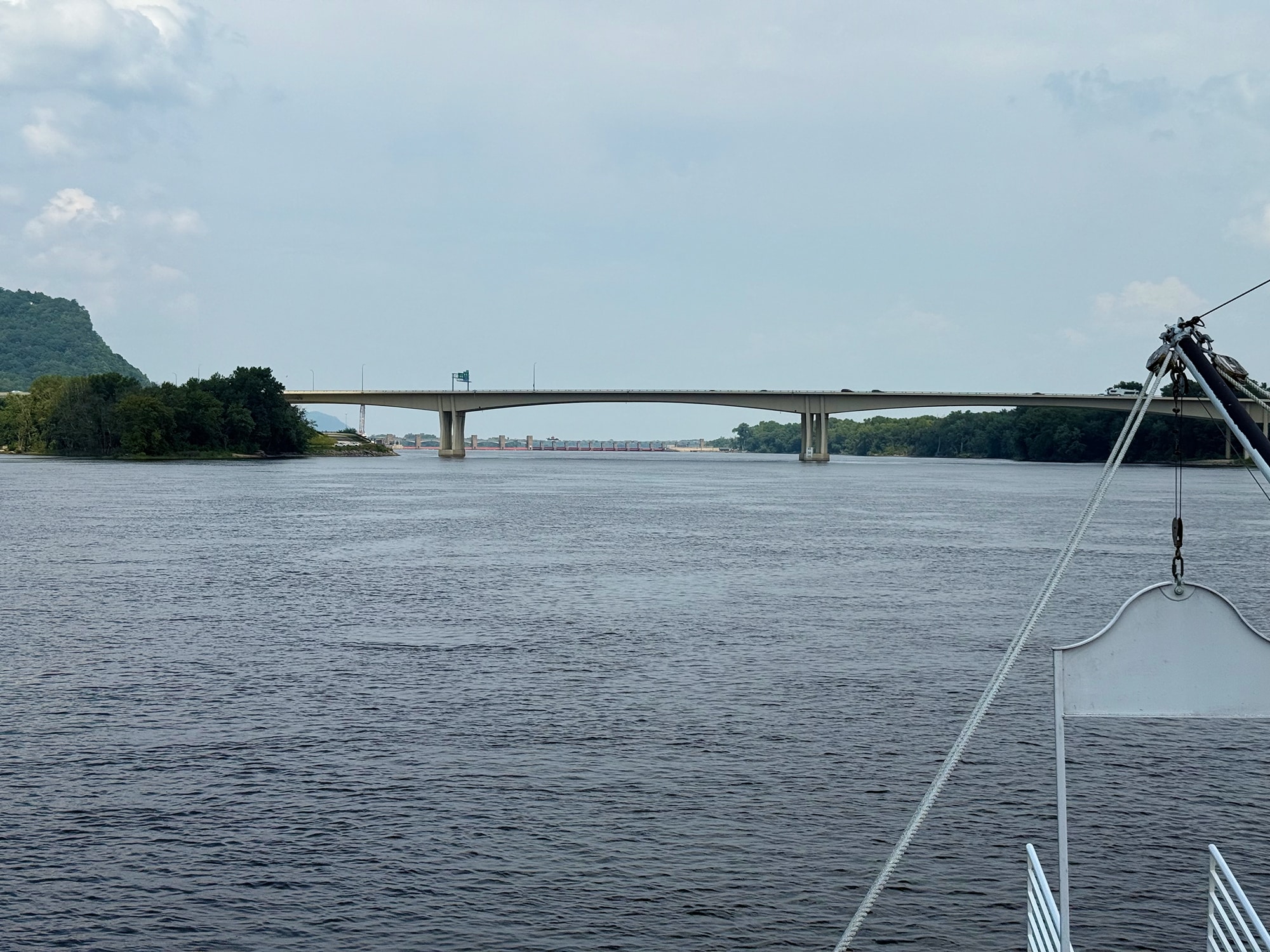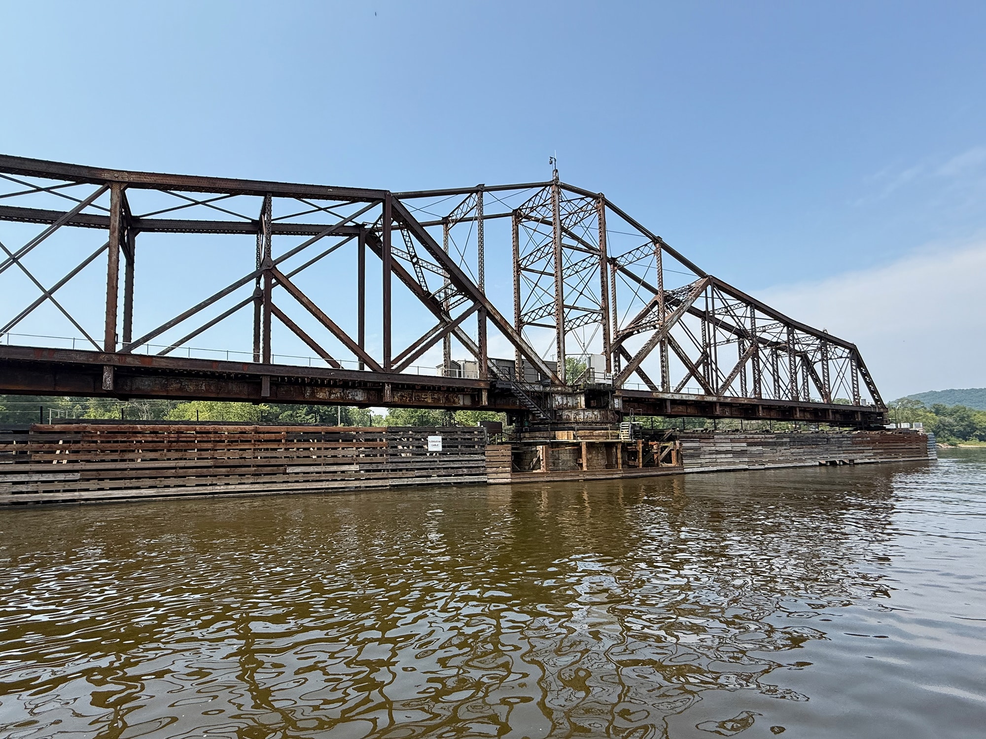 That turned out to be a very cool delay, since this bridge is one of only a few remaining swing bridges on the Mississippi River, and we were fortunate enough to watch it open for us. After the train passed by, of course! This bridge is “designed to rotate horizontally around a central vertical pivot”, allowing both boats and trains to pass through (one after the other). And our small boat was more easily inconvenienced than that speeding train!