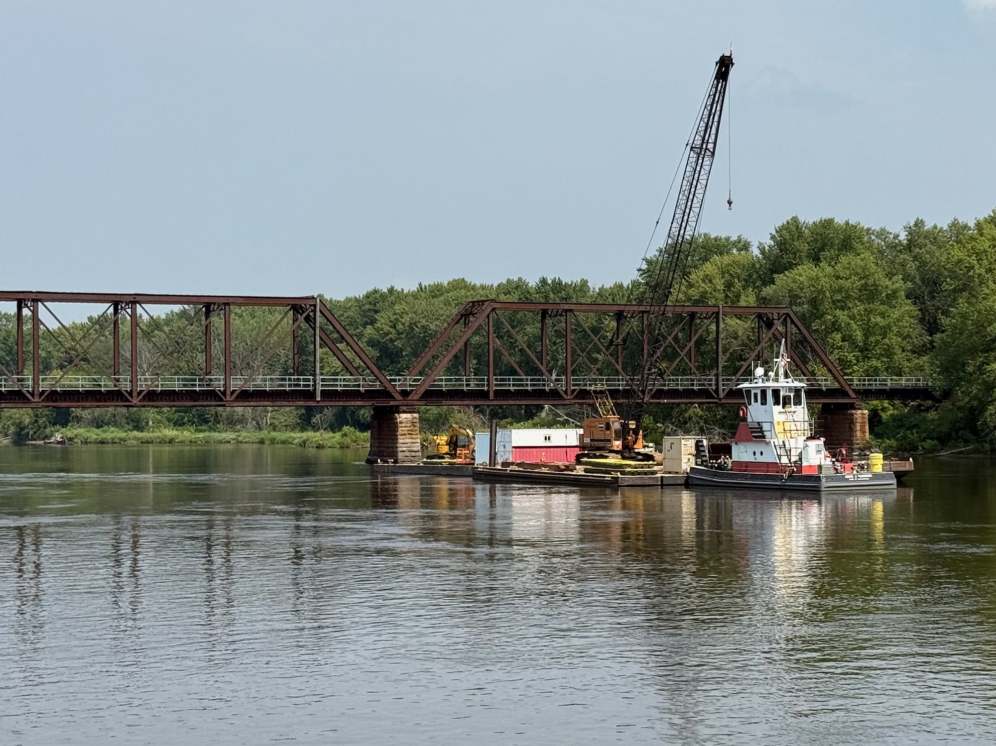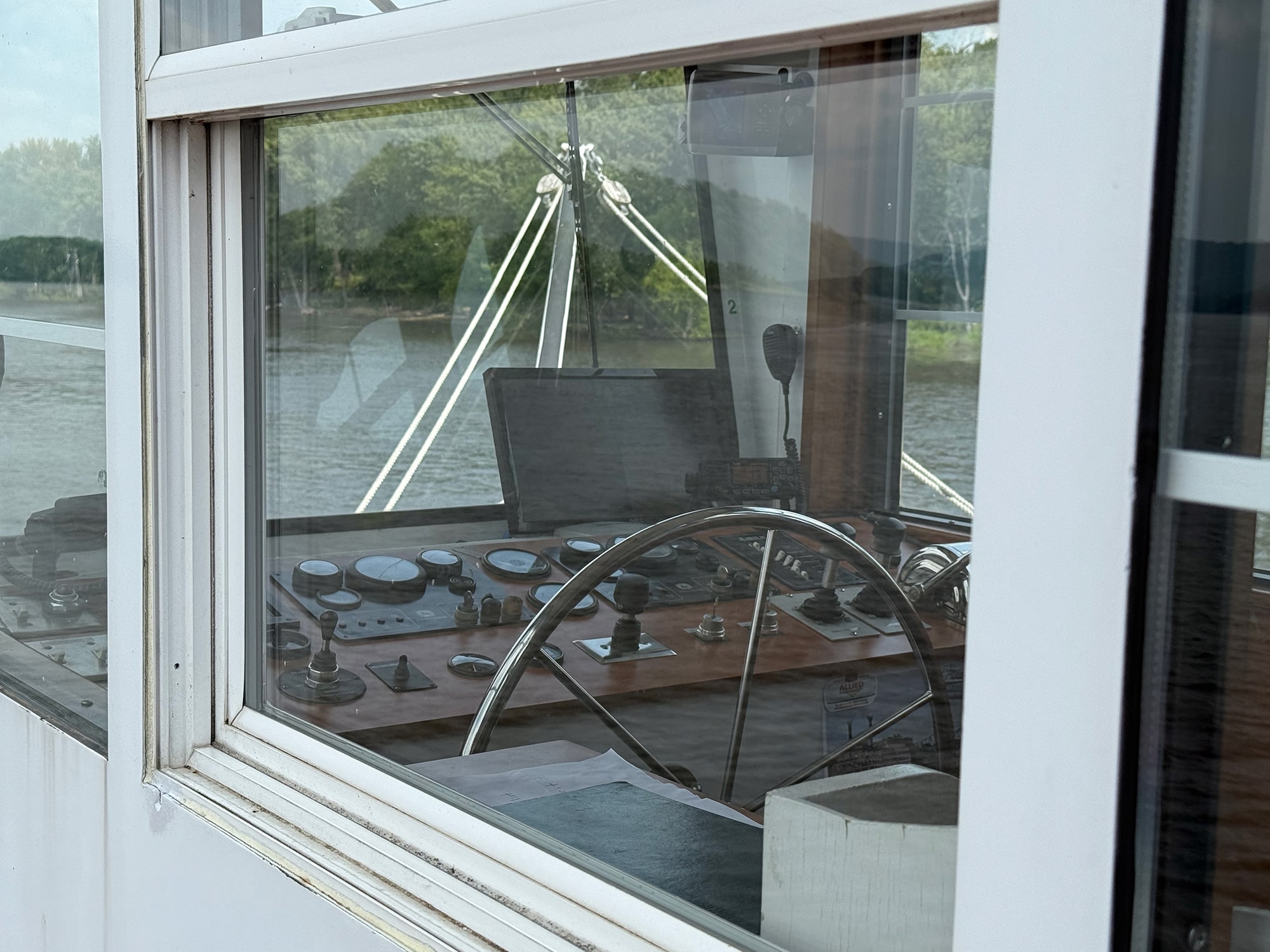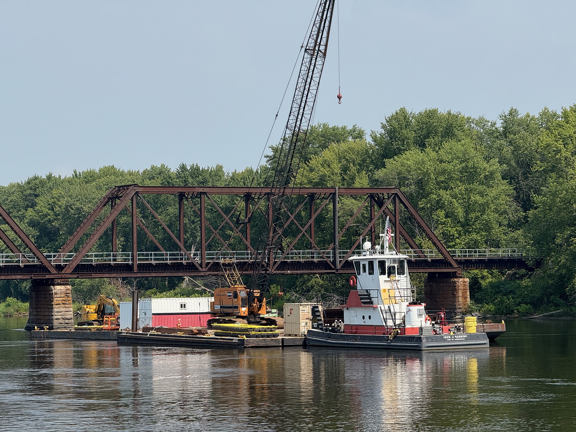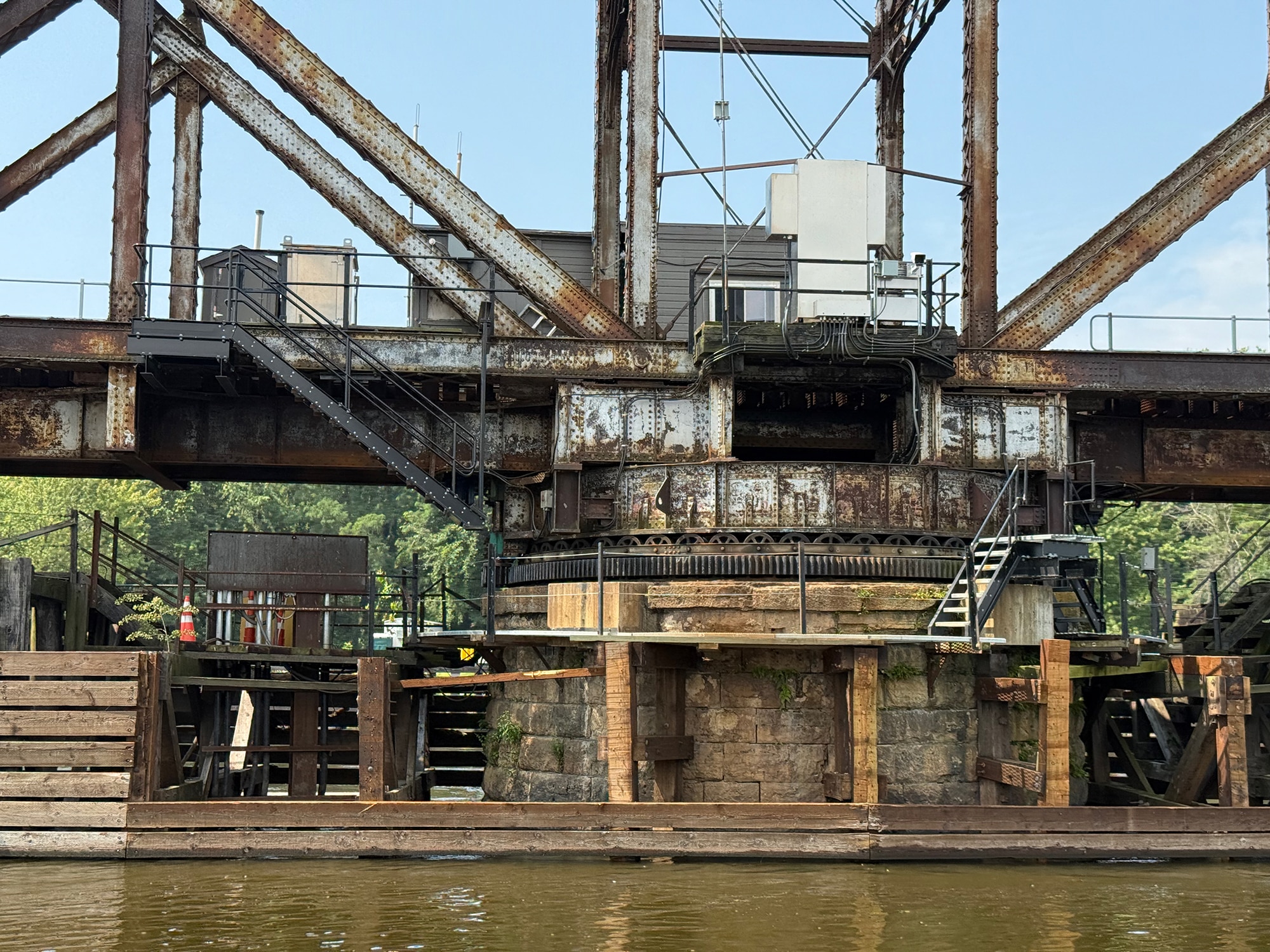 That turned out to be a very cool delay, since this bridge is one of only a few remaining swing bridges on the Mississippi River, and we were fortunate enough to watch it open for us. After the train passed by, of course! This bridge is “designed to rotate horizontally around a central vertical pivot”, allowing both boats and trains to pass through (one after the other). And our small boat was more easily inconvenienced than that speeding train!