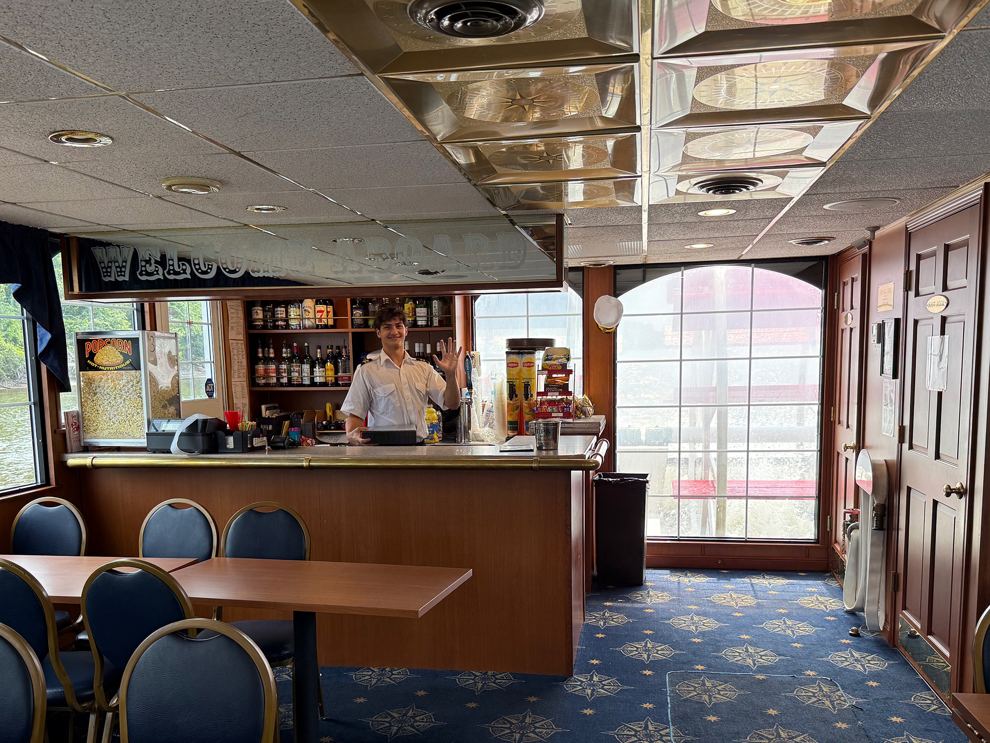 After all the excitement of the swing bridge, I went below deck to check out the paddles that were on full display behind a pretty wet and smeary window. Then I found someone to help with refreshments. Say hello to our steward – keeper of Bloody Marys and a bag of popcorn. Not a great breakfast, but at least we had tomato juice and veggies, right? On my way back up, I took the video of the paddles on full display out in the open.