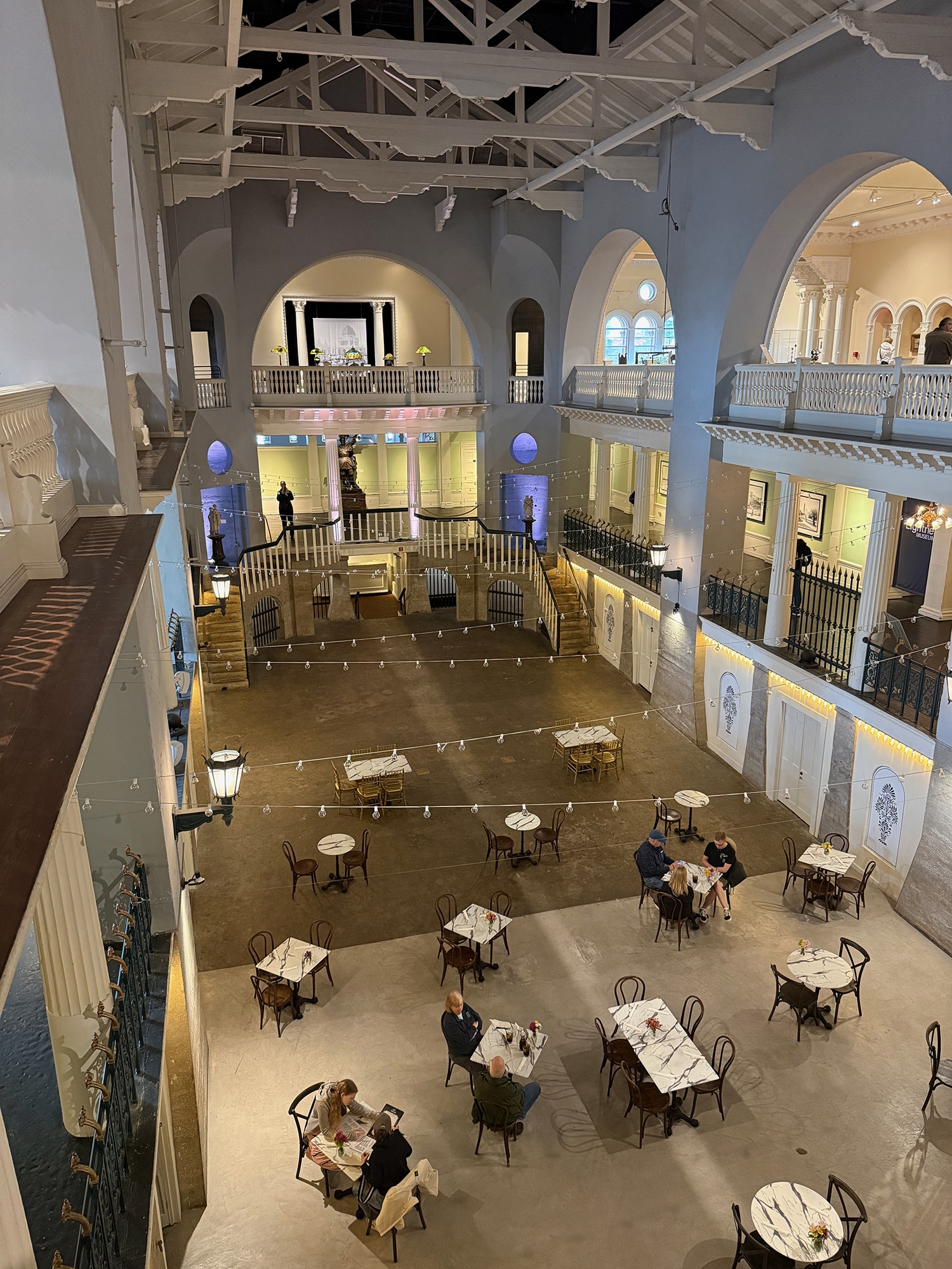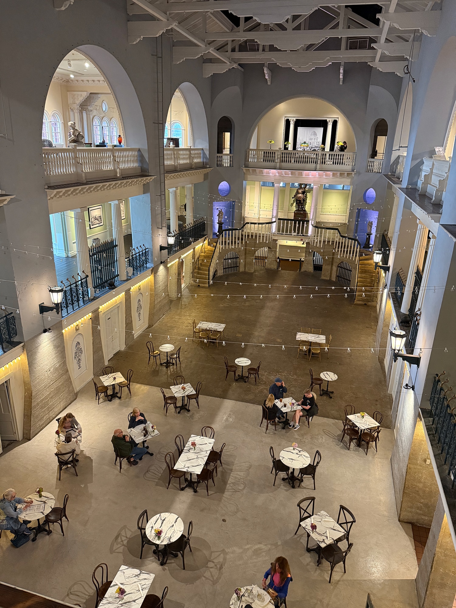 From the third-floor vantage point of the Gilded Age exhibit, we had a bird’s eye view of the former pool which is also shown in the header photo at the top of this post. We had hoped to have lunch in the Café, but without a reservation that didn’t happen. We now have one more reason to return to St. Augustine!
