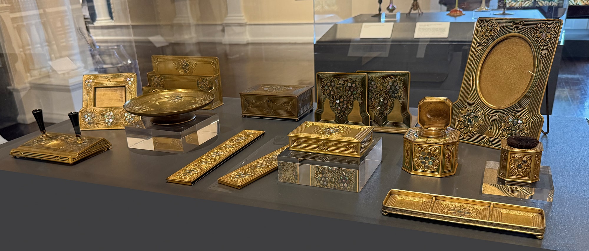 “The desk sets produced by Tiffany Studios demonstrate how the firm’s high-art aesthetic was applied to objects for everyday use. Over the course of its history, Tiffany Studios produced approximately twenty different desk sets. The accessories were not mass-produced. Rather they were fabricated individually in small lots and pieces were priced and sold separately so there was no such thing as a standard set – customers could pick and choose based on their specific needs.” ~ from an informational card