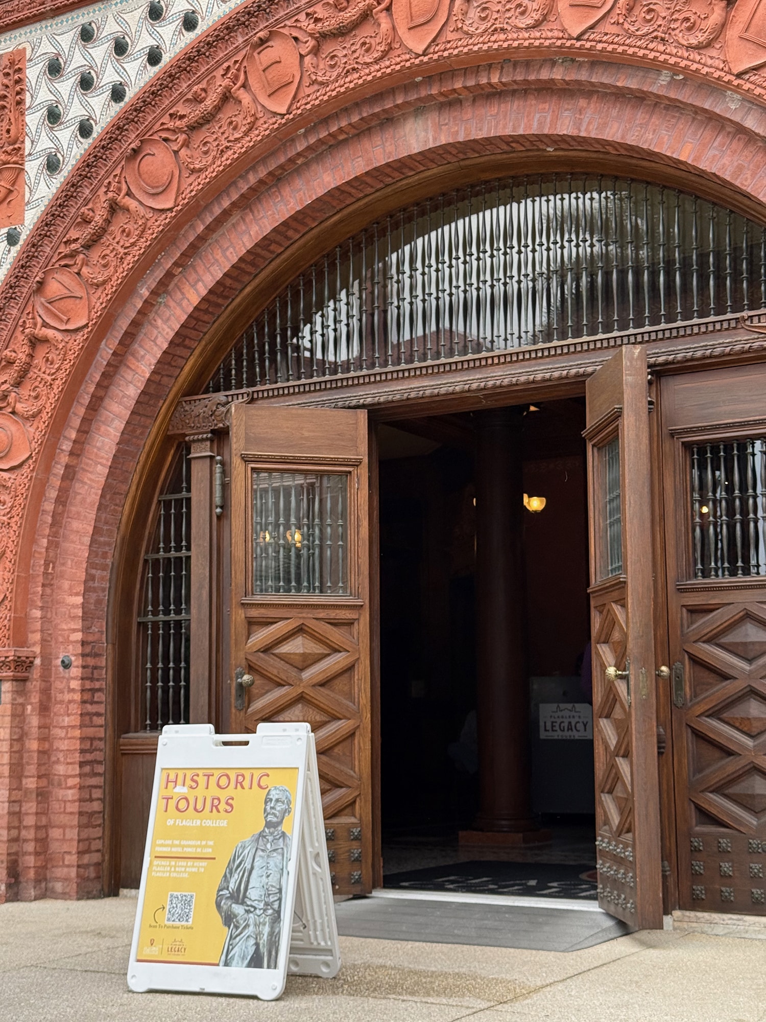 Located in the “Winter Newport,” this resort hotel entertained celebrities from around the world, including several U.S. Presidents. During World War II, the hotel served as a Coast Guard Training Center and in 1968, this historic landmark was converted into Flagler College, an accredited liberal arts institution. ~ Paraphrased from the green sign below: