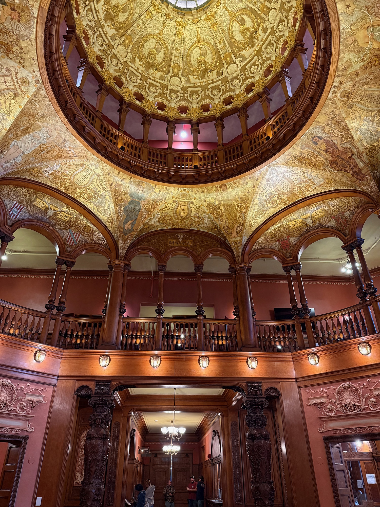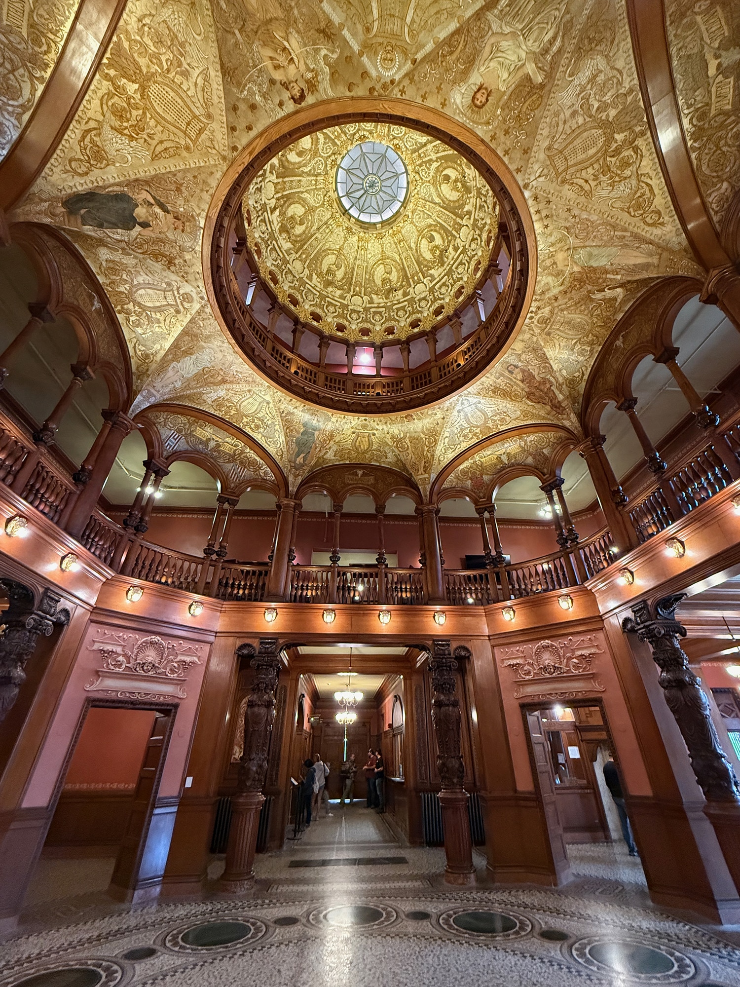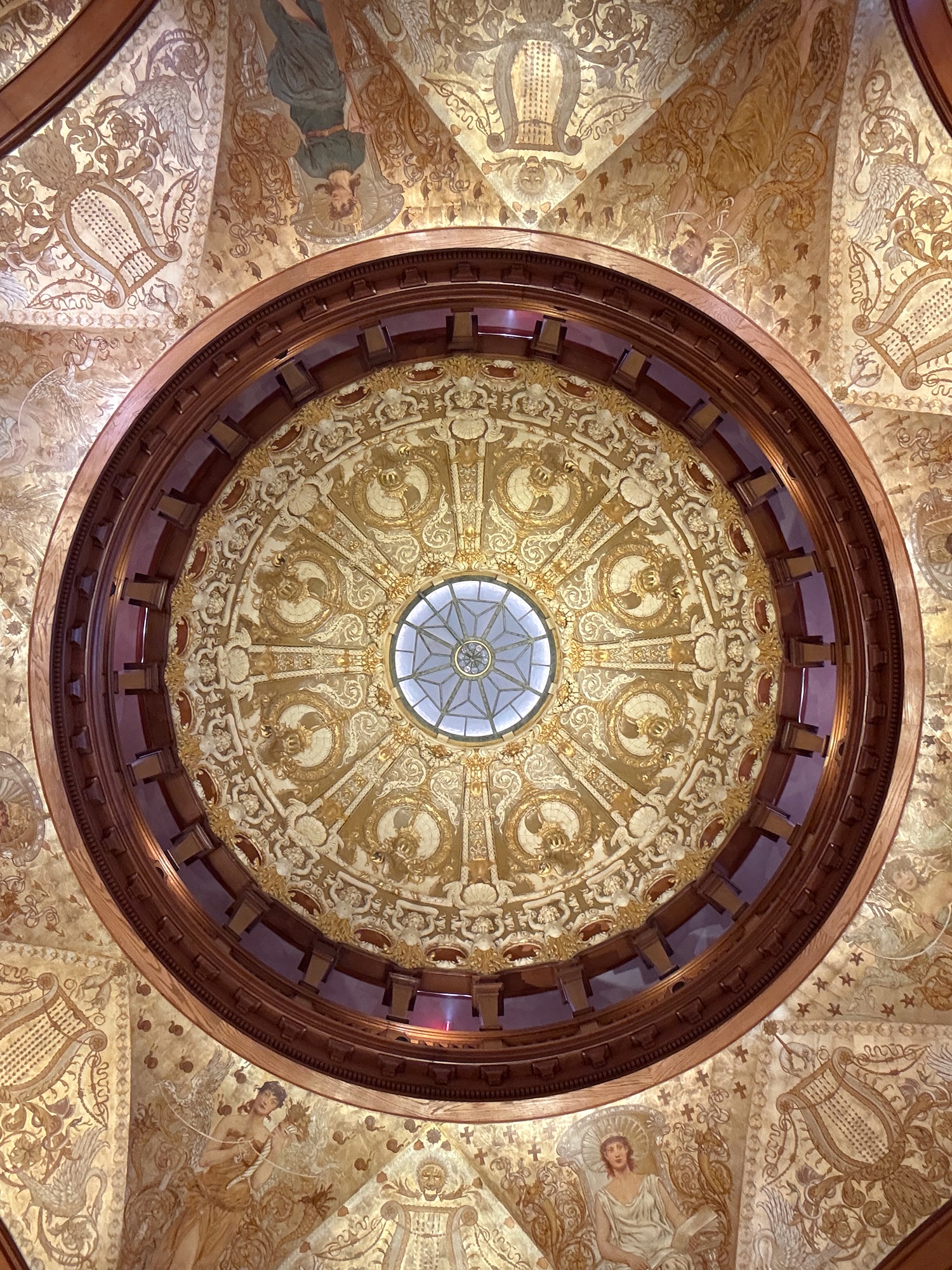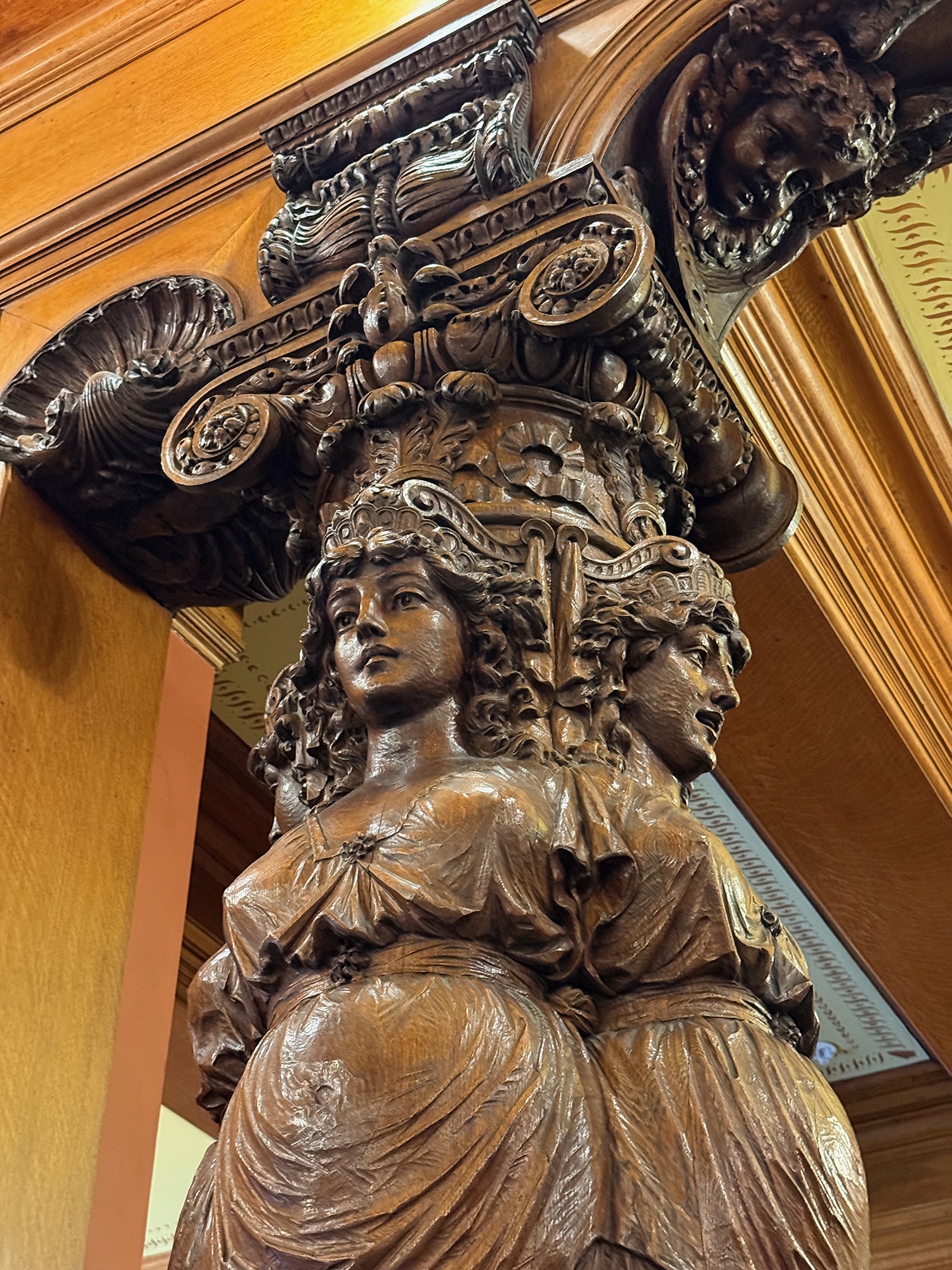 While the exterior and courtyard are pretty impressive, the interior is filled with magnificent design elements. Our tour started in the rotunda (pictured above). The floor is just gorgeous with its hand-laid African Mosaic Tile – not in sheets like you’ll find at Home Depot. The 68-foot domed ceiling displays murals that are embellished with 23K gold leaf, and the eight lovely ladies (each unique) that surround it were hand-carved from oak beams.
