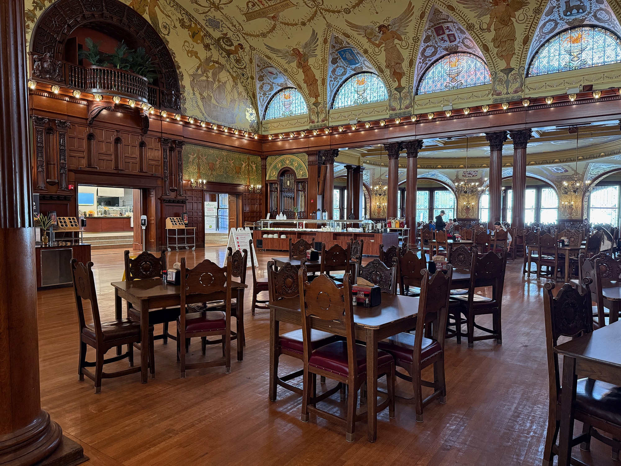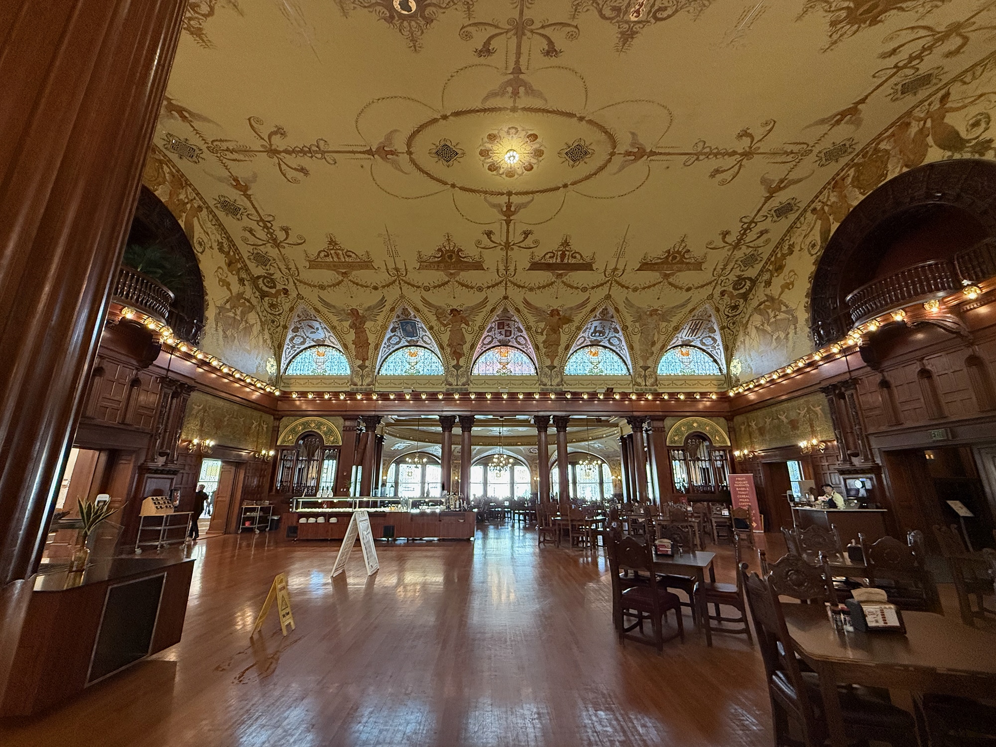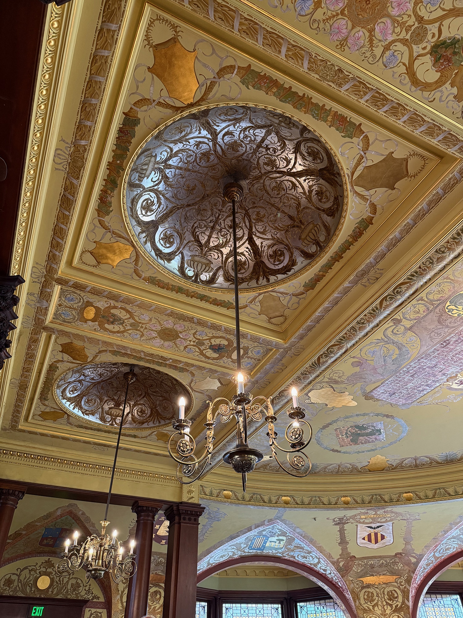 In this room, there are forty Louis Comfort Tiffany stained glass windows, featuring clear and colored glass in geometric patterns and filigree designs. Also, the barrel-vaulted ceiling features additional allegorical females and murals by George W. Maynard.” ~ READ MORE