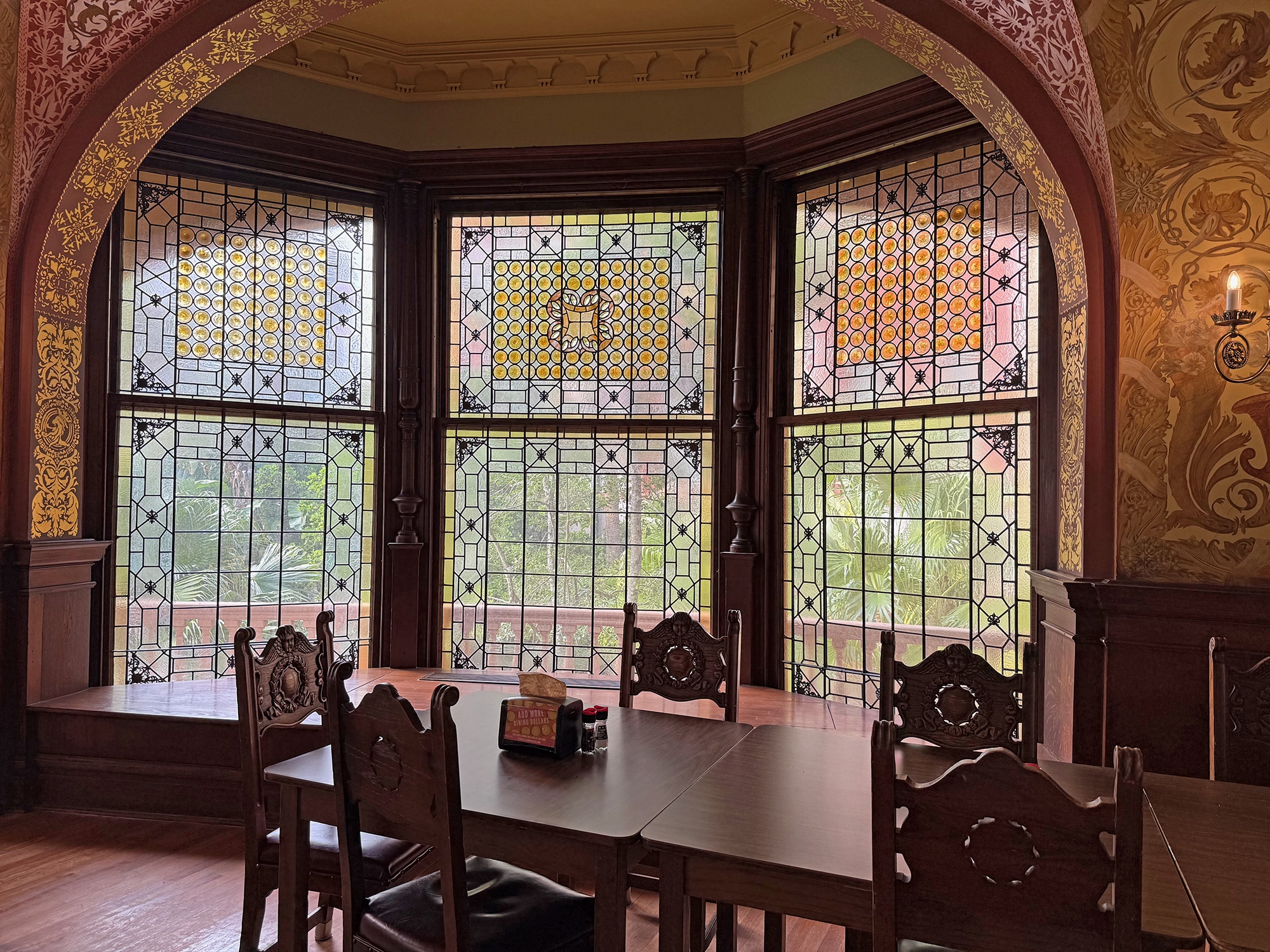 The interior is decorated with imported marble and carved oak, with murals painted by Tojetti and George W. Maynard. Its stained glass windows were created by Louis Tiffany of New York. The Ponce de Leon Hotel was the flagship of the Flagler hotel system which soon extended all along the east coast of Florida.