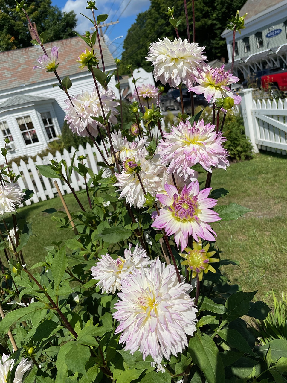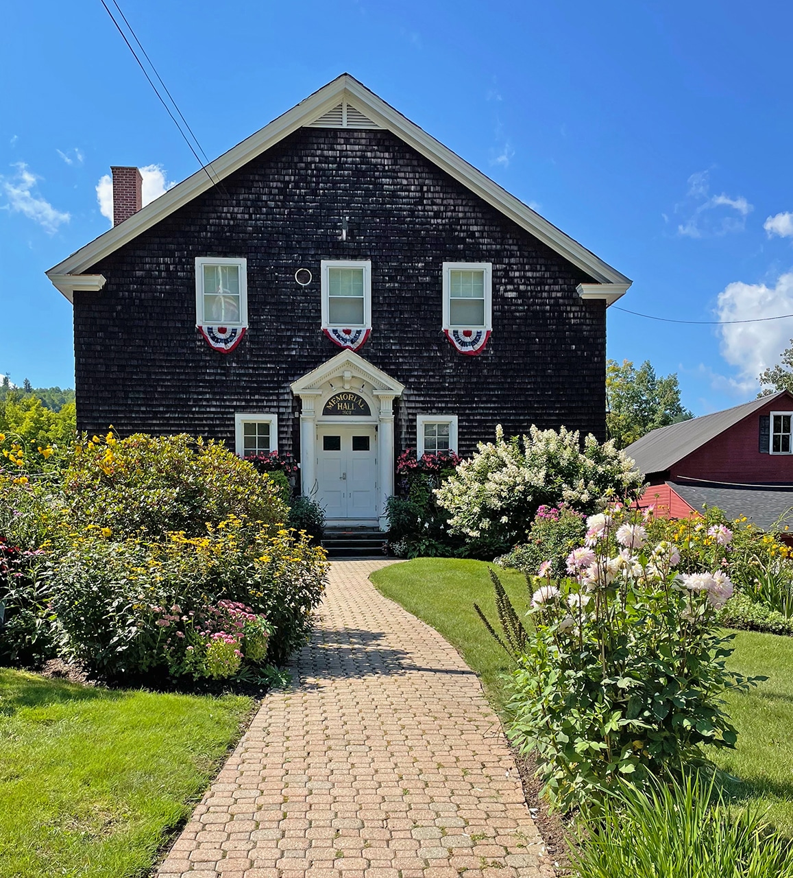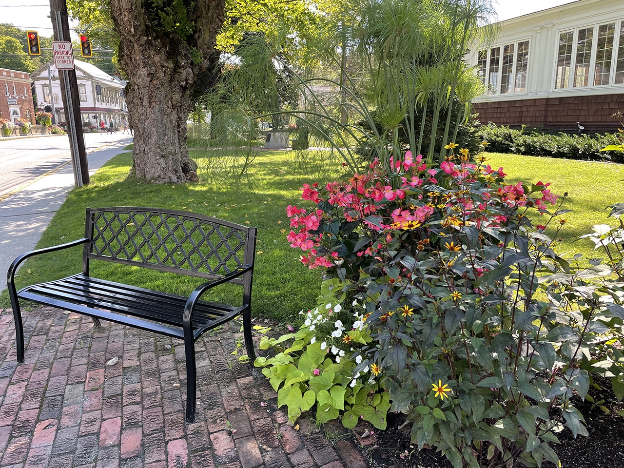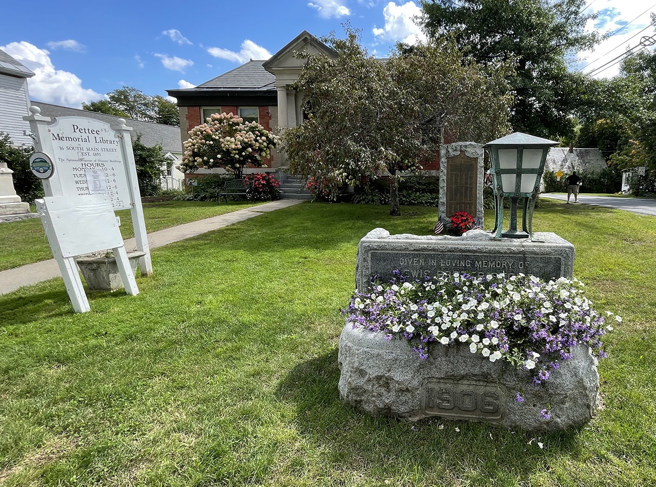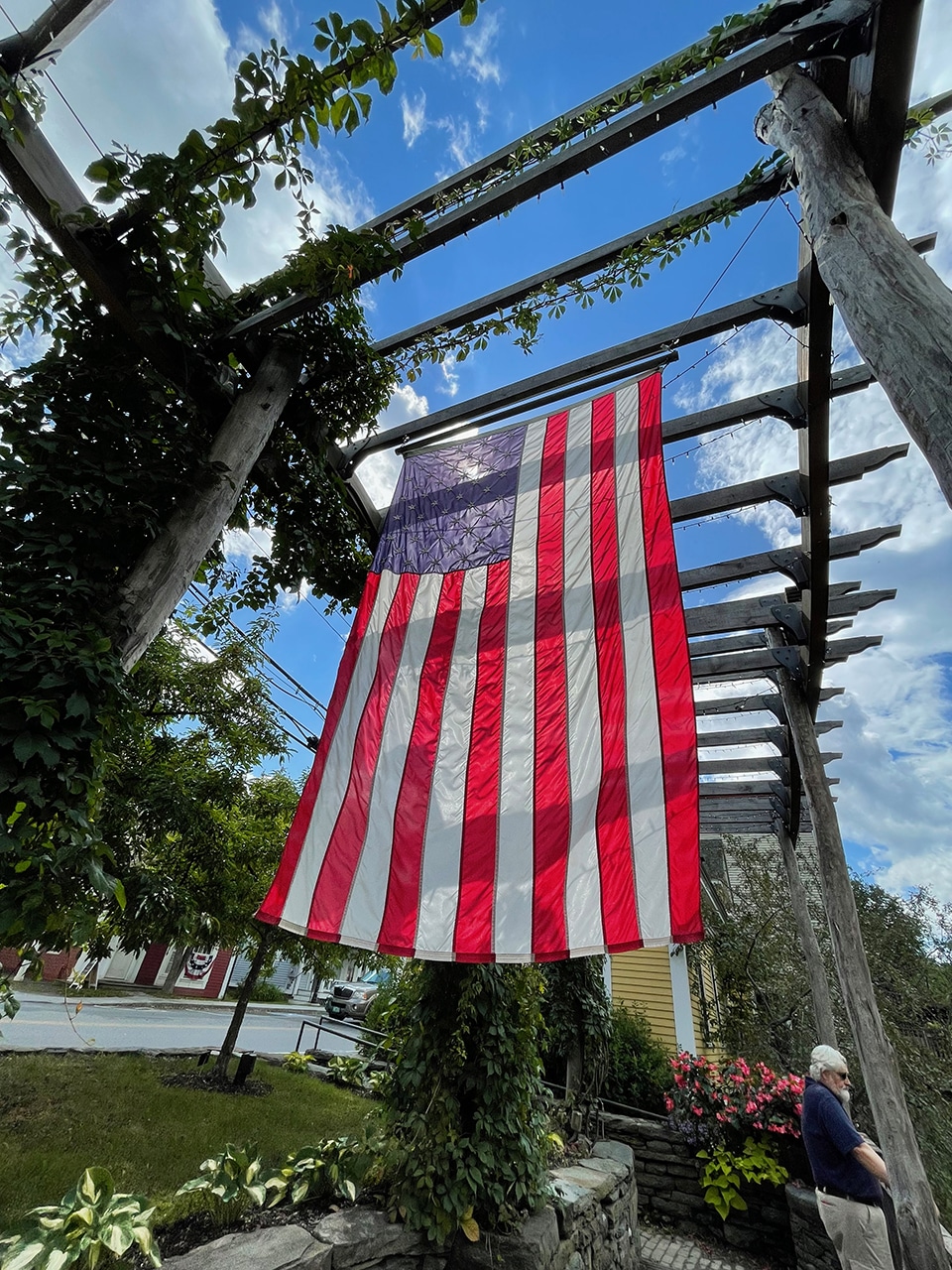The photos below: 1) The Valley Town Church was undergoing some renovations, which doesn’t surprise me since it was built some time after 1835. Before it was built, early meetings of the Universalist Church held their meetings in members’ homes. 2) Pettee Memorial Library. Before there were public libraries, there were social libraries where residents purchased a membership to borrow from a private collection. 3) Seasonal events are held where this beautiful sun-lit flag hangs, but from 1885-1970 this park was the site of the town’s first bank, which burned in 2007.