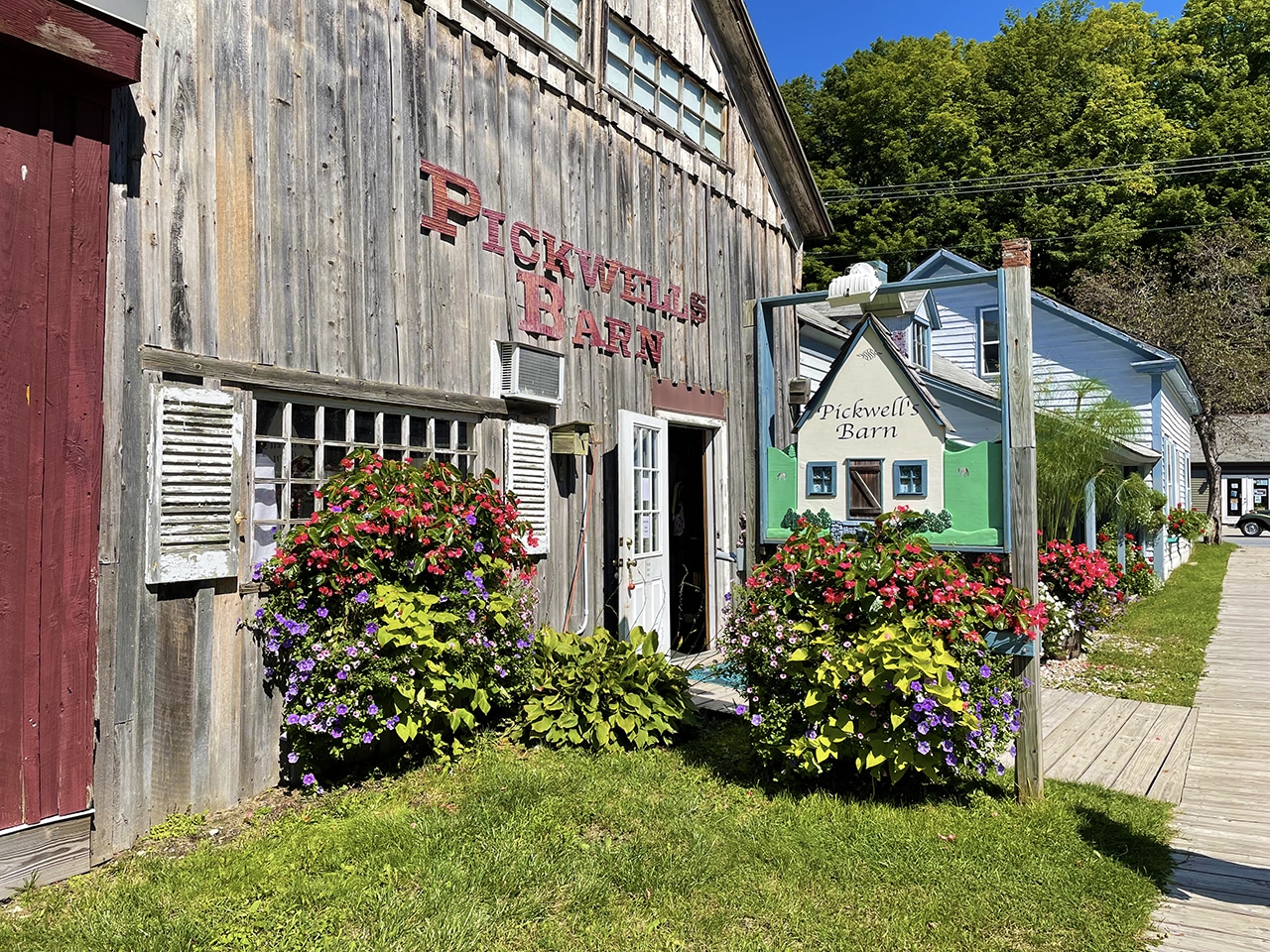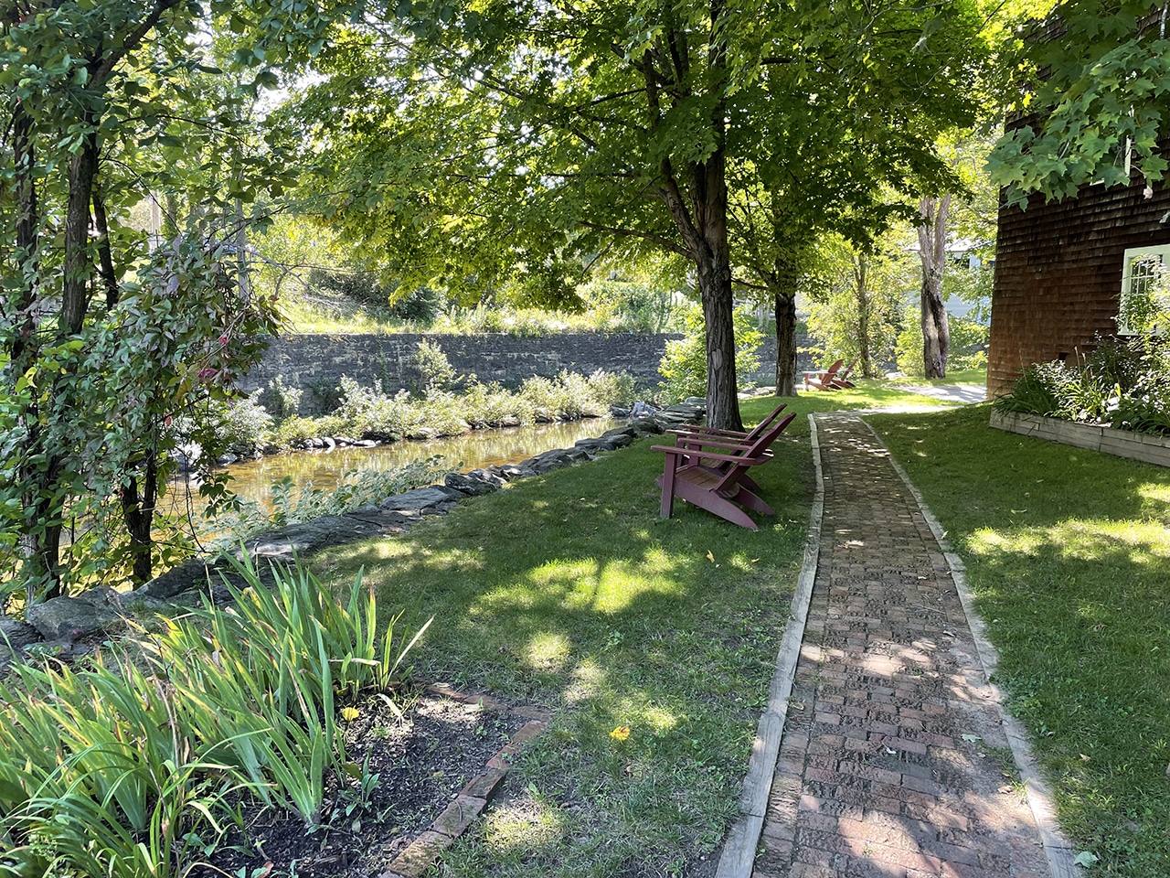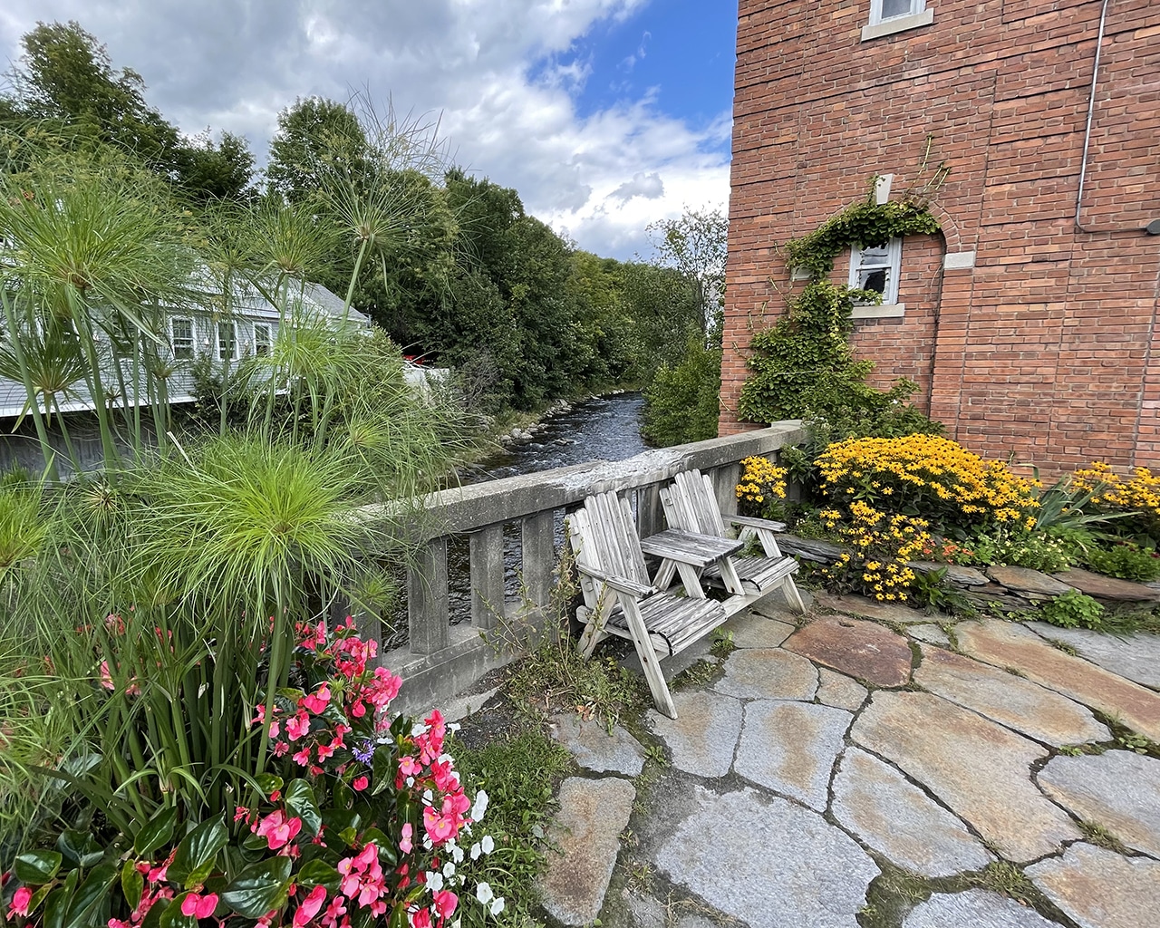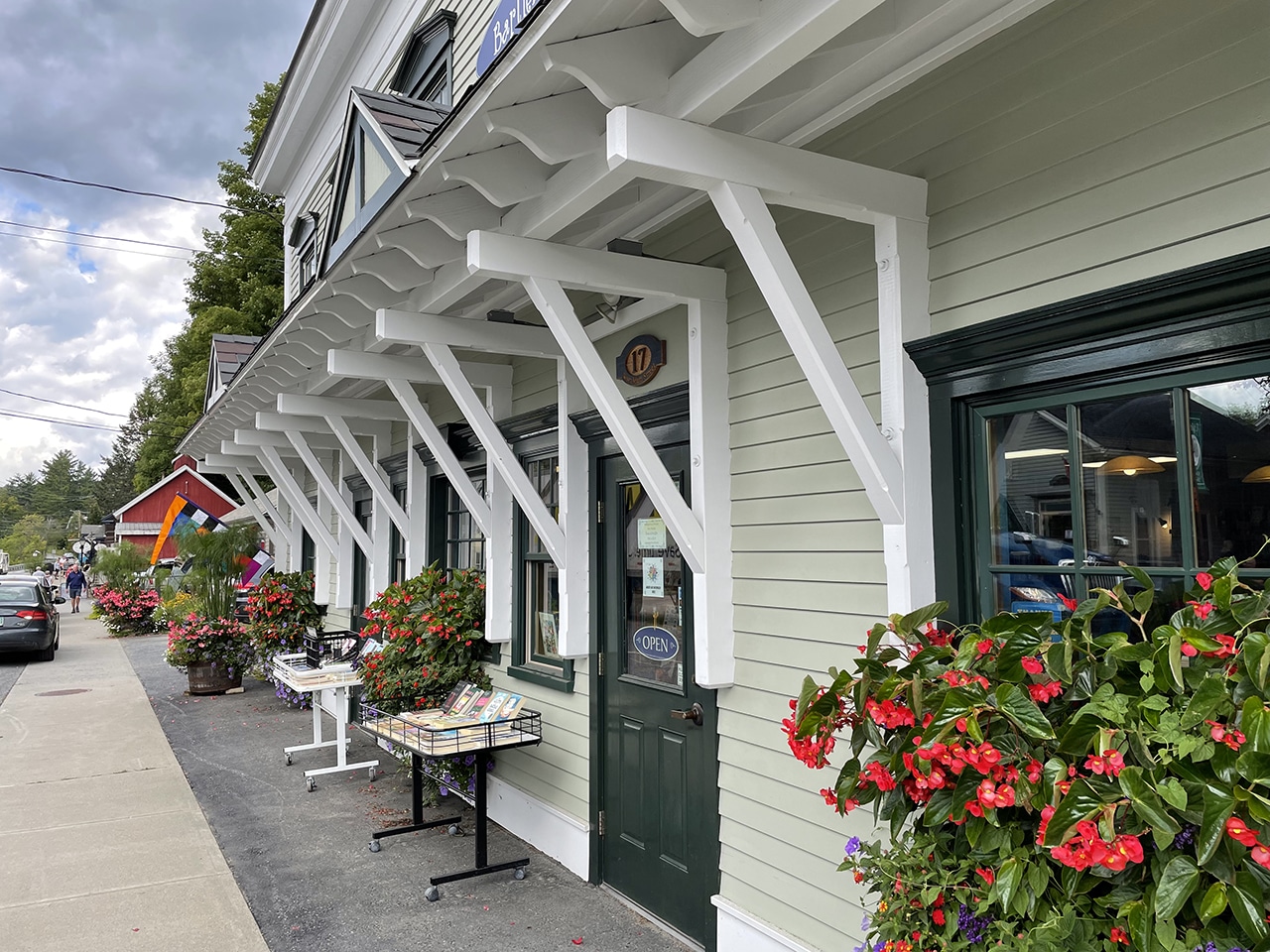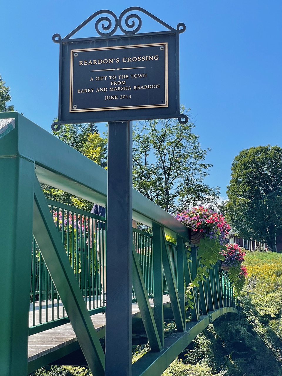 The photos below: 1) The Lyman House was built in 1836 and now houses Jezebel’s Eatery which offers craft beers and farm fresh comfort food. 2) Right next door is Norton House Quilting. The old metal sign out front reads: The Norton House circa late 1700s, one of the oldest houses left in town, was originally built on Lisle Hill in the first town of Wilmington. It was moved to its present site by ox cart in the 1830s. 3) Pickwell’s Barn has been a women’s clothing boutique since 1994, but the building was built in 1836 as the backyard barn of original owners Fred and Nellie Pickwell. 4) Wheeler Woven & Mosaic is run by a delightful woman who does fabulous work with her dog Rex in the back portion of Pickwell’s Barn. 5) Reardon’s Crossing is a beautiful footbridge over the Deerfield River where the Hoot, Toot and Whistle Trail starts. The unpaved trail provides a relaxing journey through peaceful woodlands on the west edge of town.