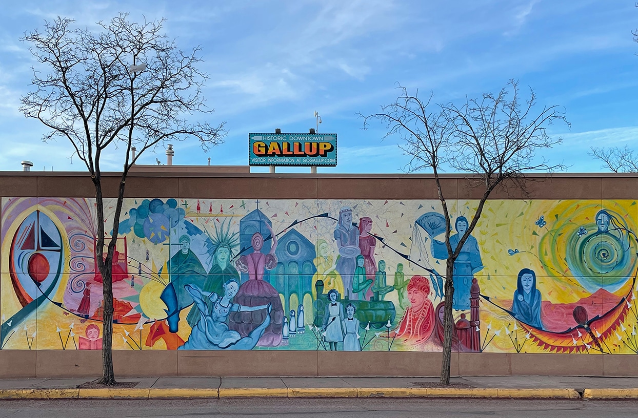 “Telling Gallup’s Story Through Art. Over 20 colorful murals are within walking distance of each other in the downtown area. These works of art vary in style and size, working together to share Gallup’s rich and romantic history, patriotism and Native American culture. A short walk through downtown will reveal murals that depict scenes from mining, rodeos and western life, with others commemorating the Long Walk or showcasing Native American trading. ~ READ MORE
