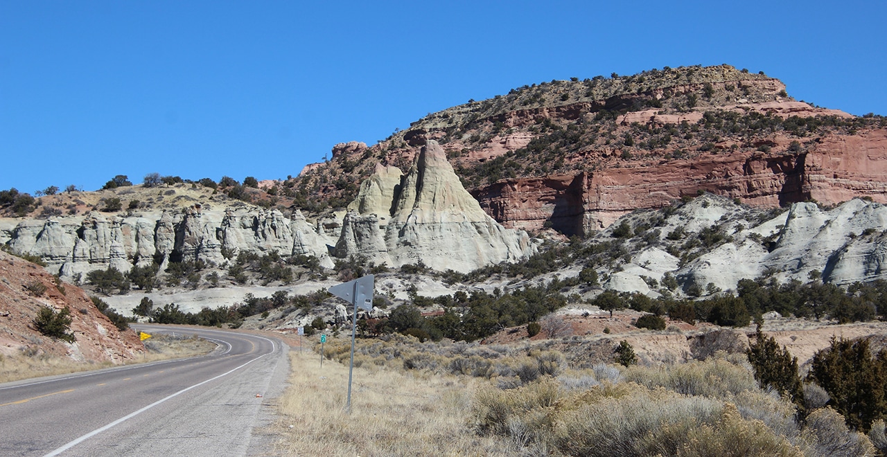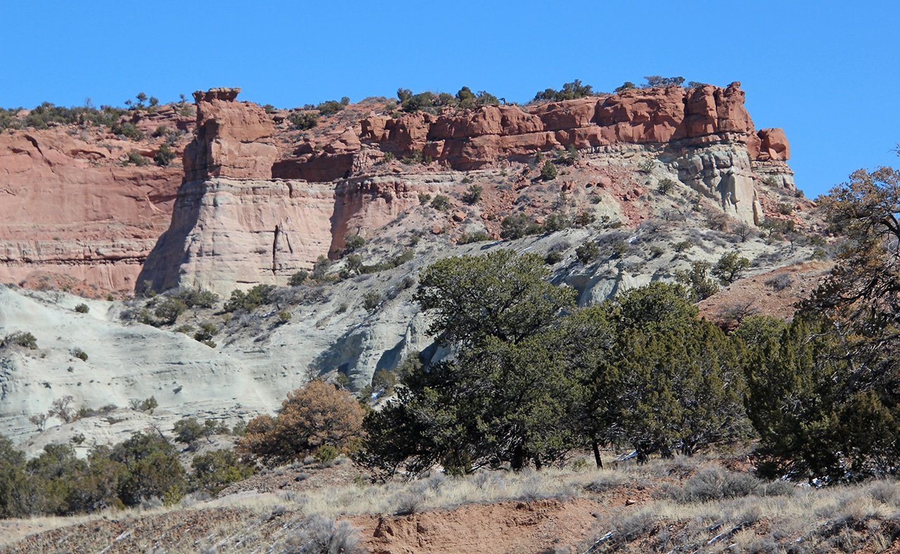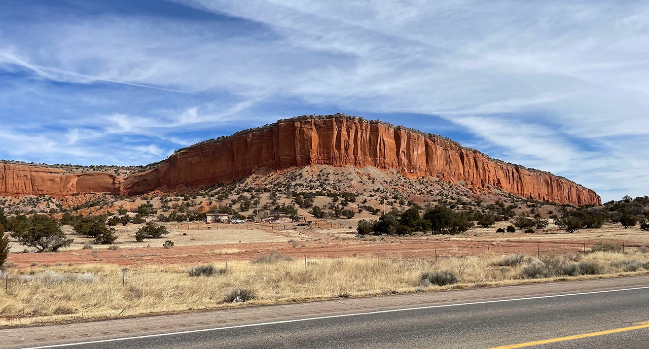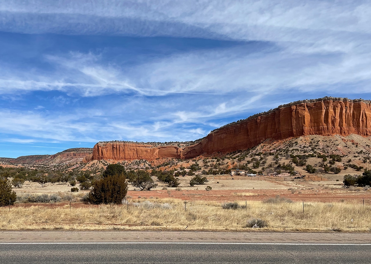 After Red Rock Park, we went on a little wild goose chase. We kept following more and more beautiful formations, but we finally had to call it off when we were up the road about a half an hour. The last two photos were taken on our way out of town en route to Grants, NM. I’m not sure which was prettier – the beautiful blue sky, or the fabulous red plateau!