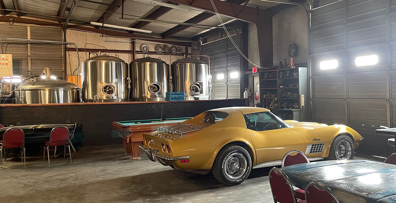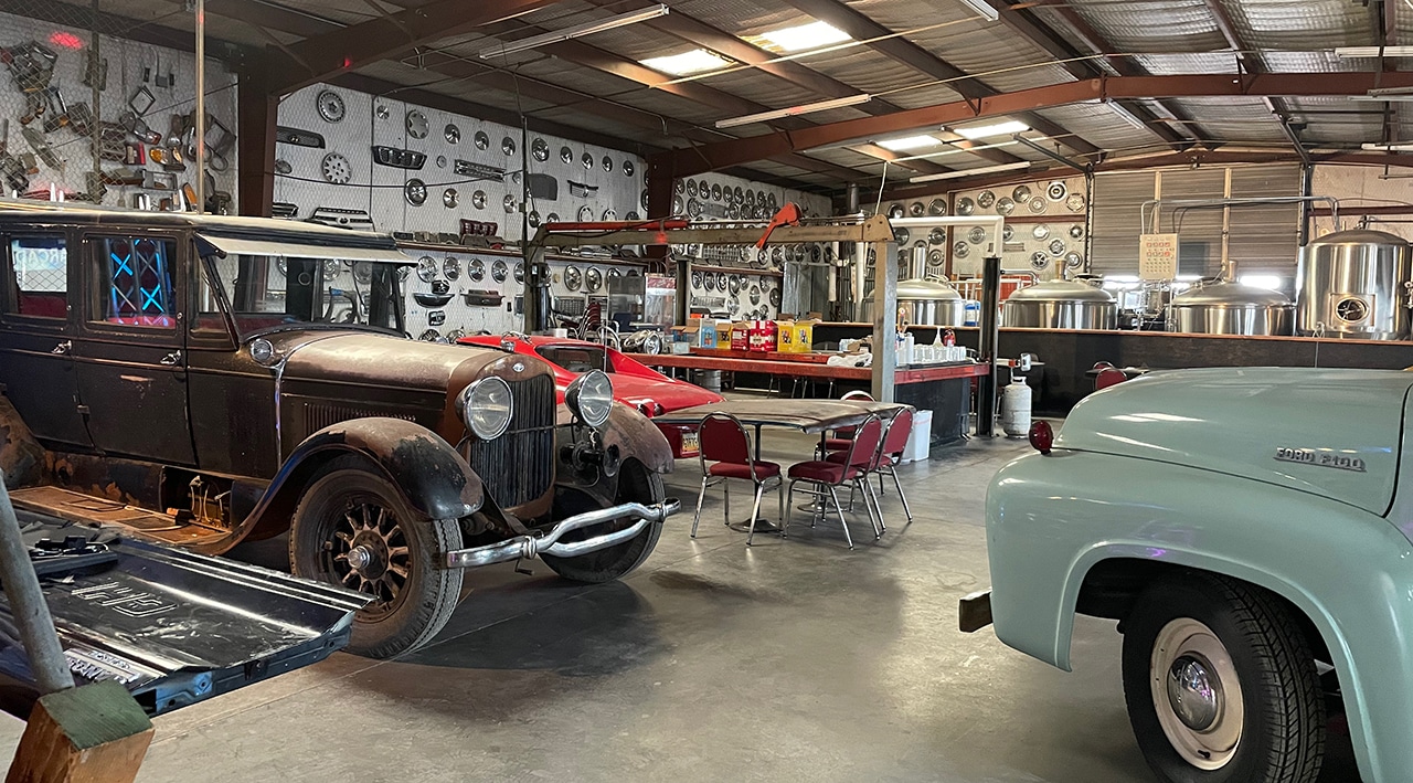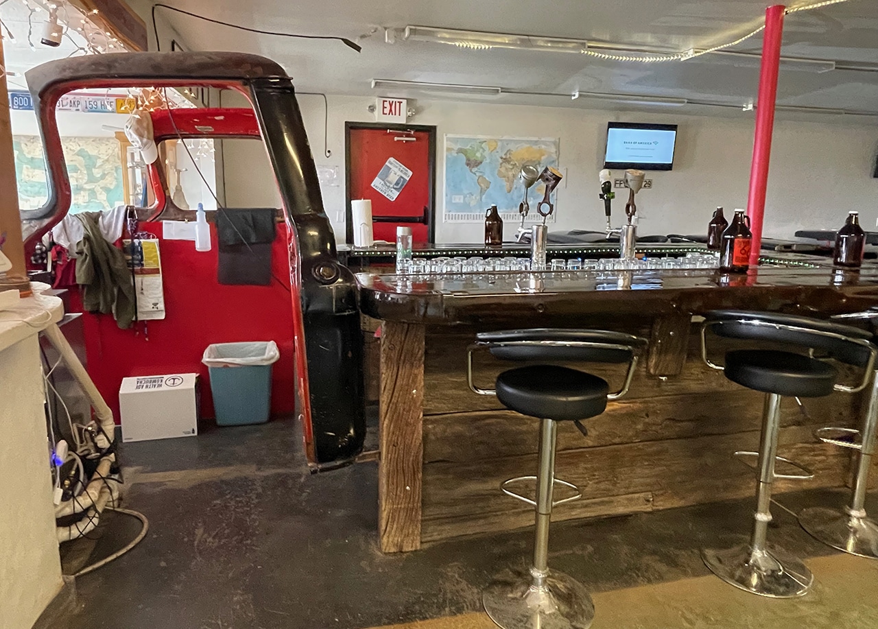 Although the tappers for the beers we ordered were located in the garage, the bar was in what may have been a reception area. A rusty old pickup served as our server’s station and a bar was built around the bed of the truck. We sat in a front area that had more comfortable chairs.