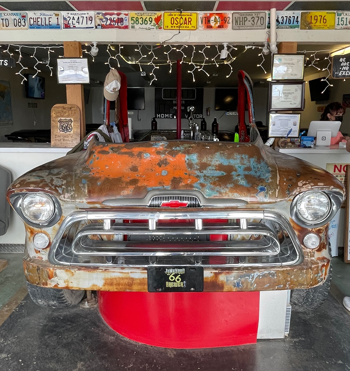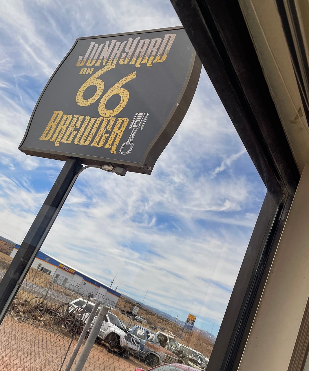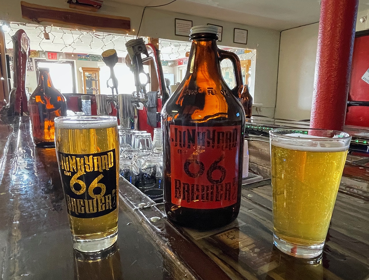After we were checked into our hotel in Grants, we went in search of a happy hour or two and a little dinner. After a little stress during part of our journey today, The Junkyard on 66 Brewery was just the ticket! Not many repair shops include a brewery in their work area!