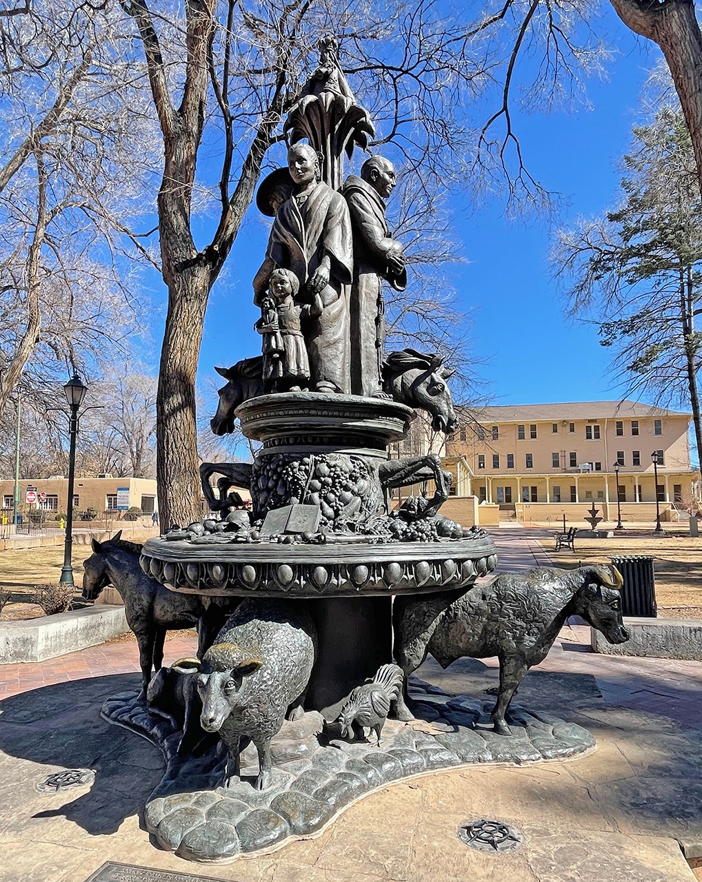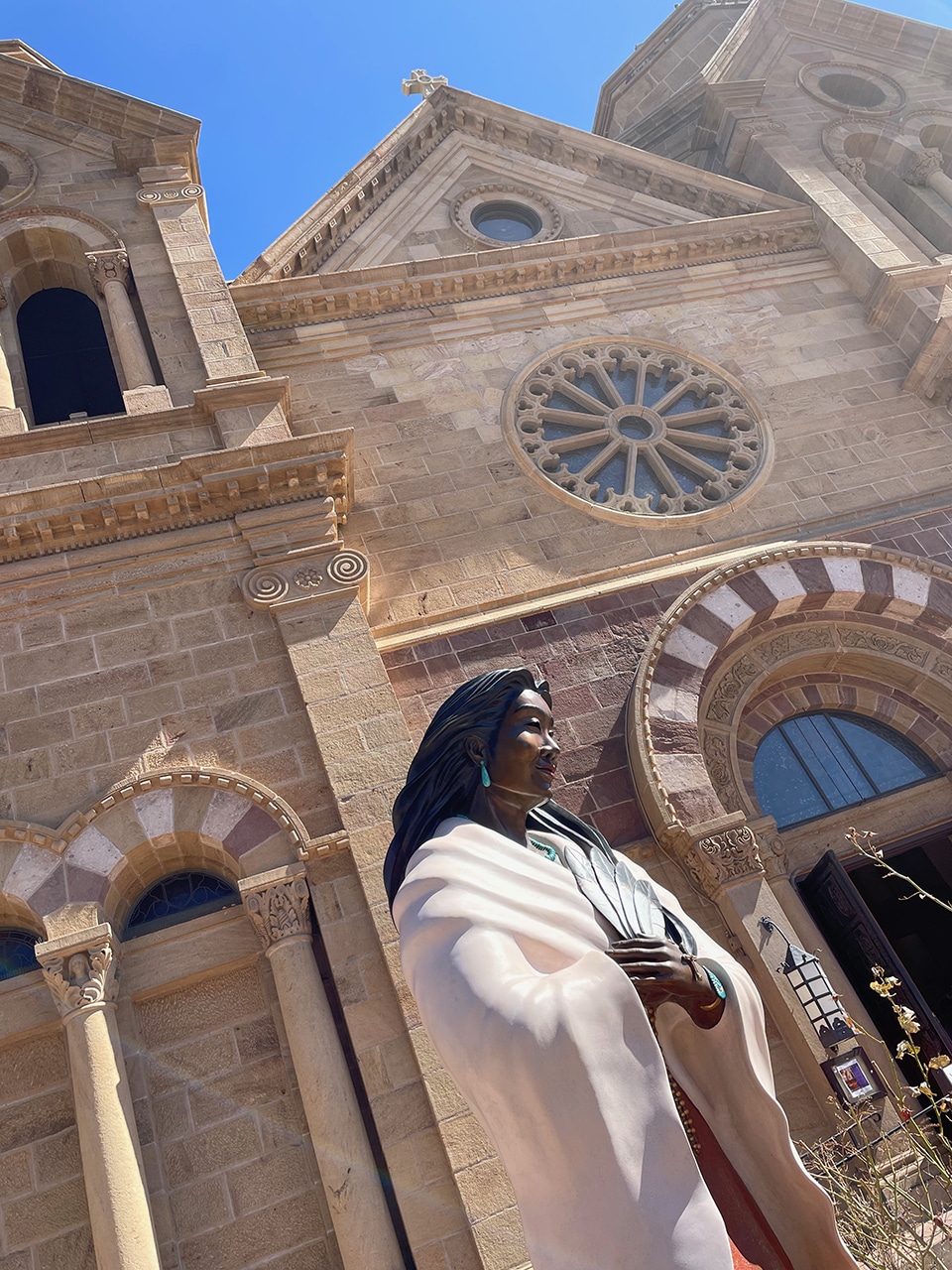 “The crowning achievement of Archbishop Lamy’s church construction in New Mexico, the Saint Francis Cathedral was built between 1869 and 1886 and designed in the French Romanesque Revival style. Although its design contrasts the surrounding adobe buildings, the cathedral remains one of Santa Fe’s most celebrated landmarks.” ~ READ MORE