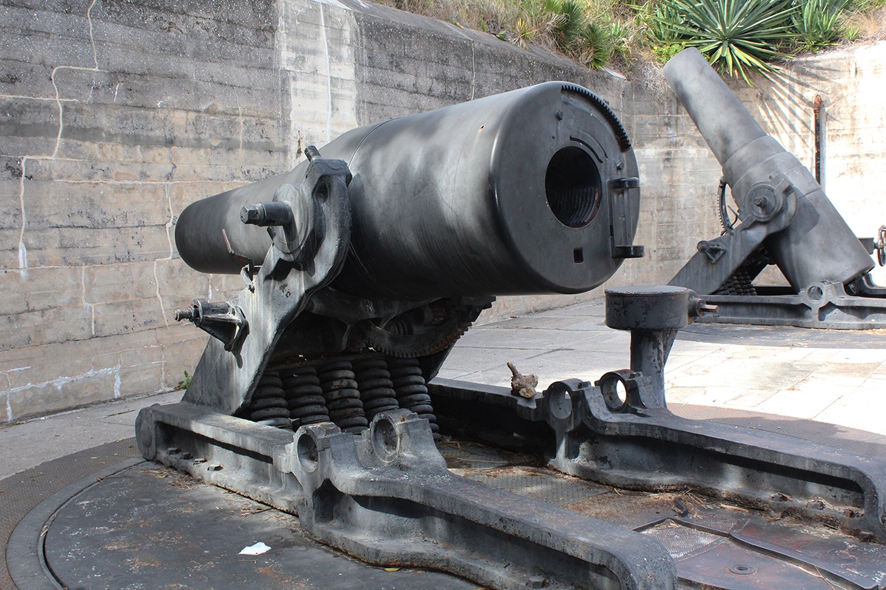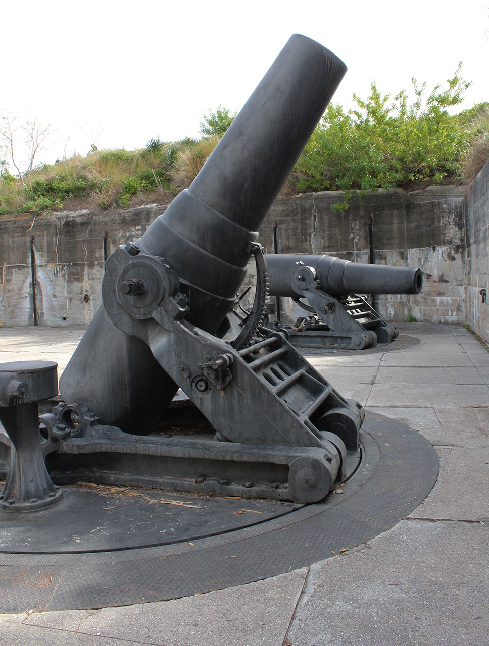 Two mortar batteries defended the fort. Battery Laidley contained eight 12-inch M 1890-MI mortars. Of those eight, four remain (two are shown below) and they are the only mortars of their kind left in North America. Battery Bigelow contained two 15-pounder, 3-inch Driggs-Seabury rapid-fire guns, but it collapsed into the Gulf of Mexico. Its ruins can be seen from shore in the surf below.